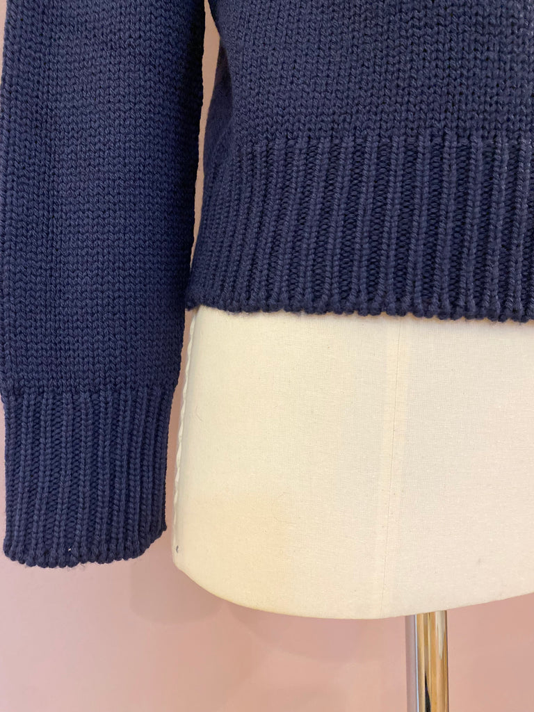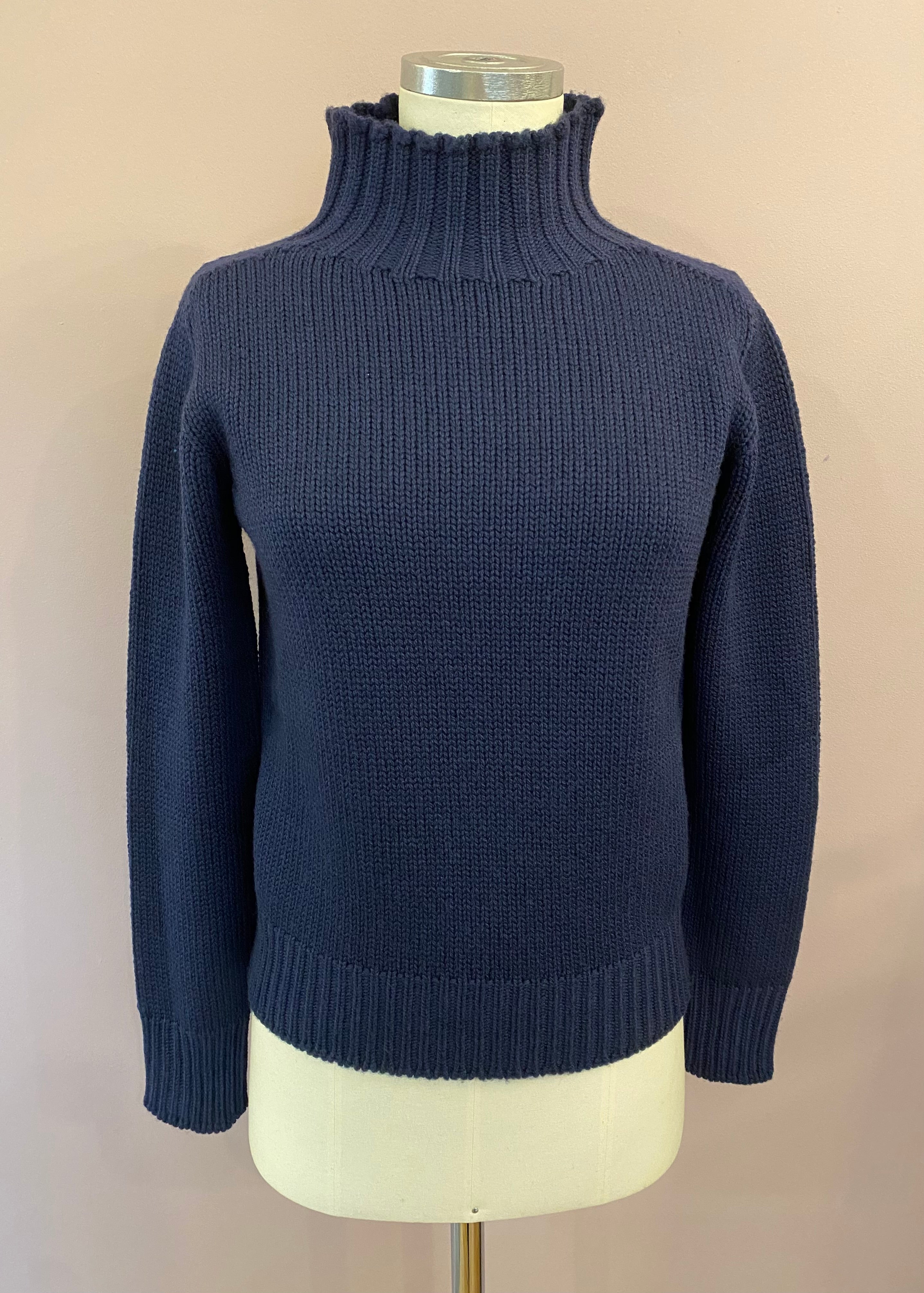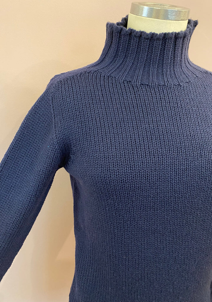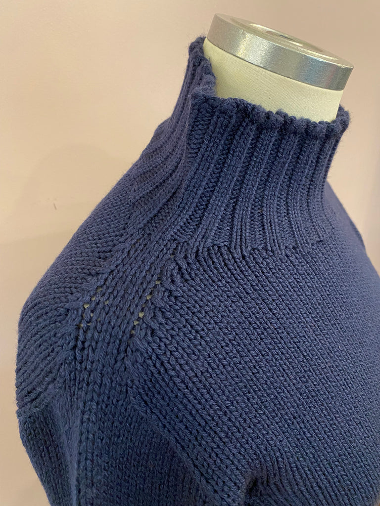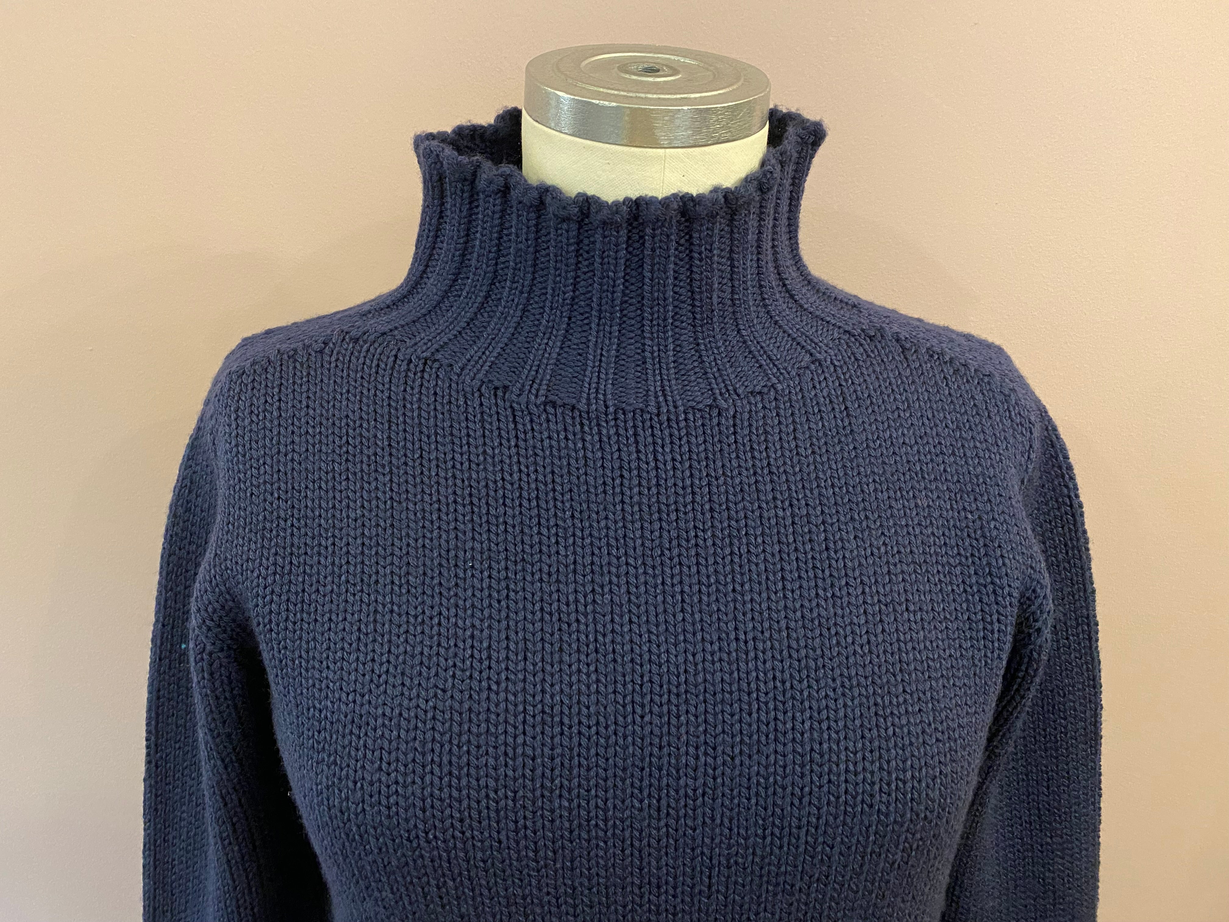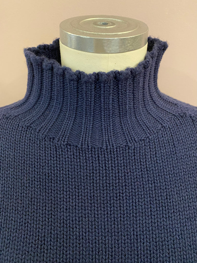 Wunderschön, lässig und kuschelig weich: Dieser Turtleneck-Pullover überzeugt mit einer schmeichelhaften Silhouette, einem edlen Dunkelblau und liebevollen Details – besonders schön sichtbar an der Schulterpartie. Der angesetzte, gerippte Kragen sowie die breiten Rippenstrickbündchen verleihen dem Pullover eine stilvolle Struktur und machen ihn zum idealen Begleiter für entspannte, aber dennoch elegante Outfits. Perfekt kombinierbar mit Hosen und Röcken aller Art.