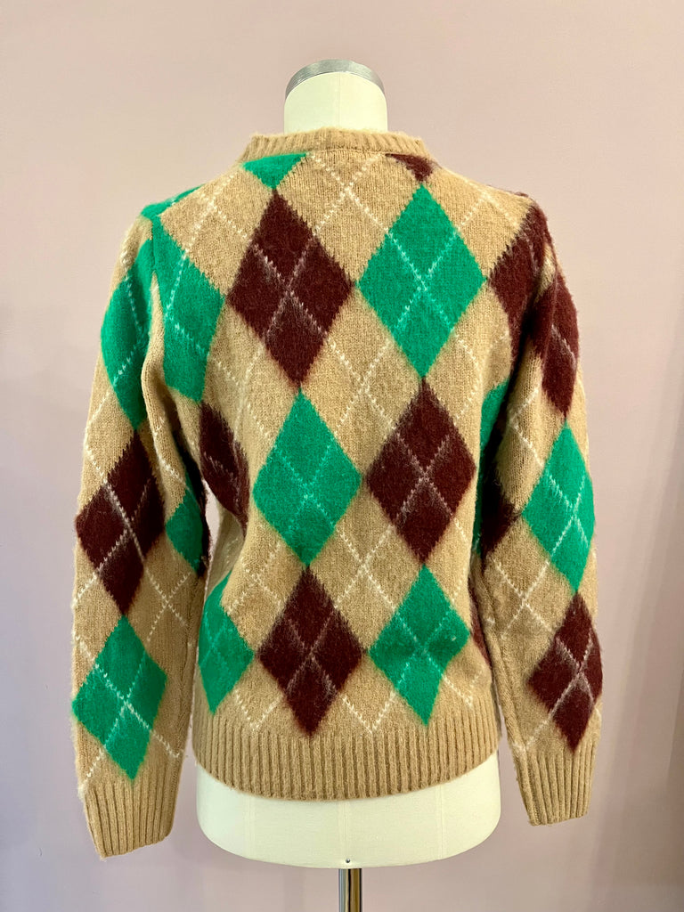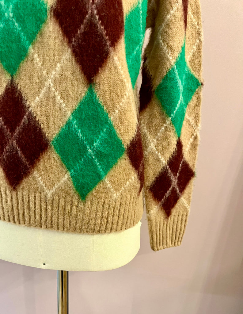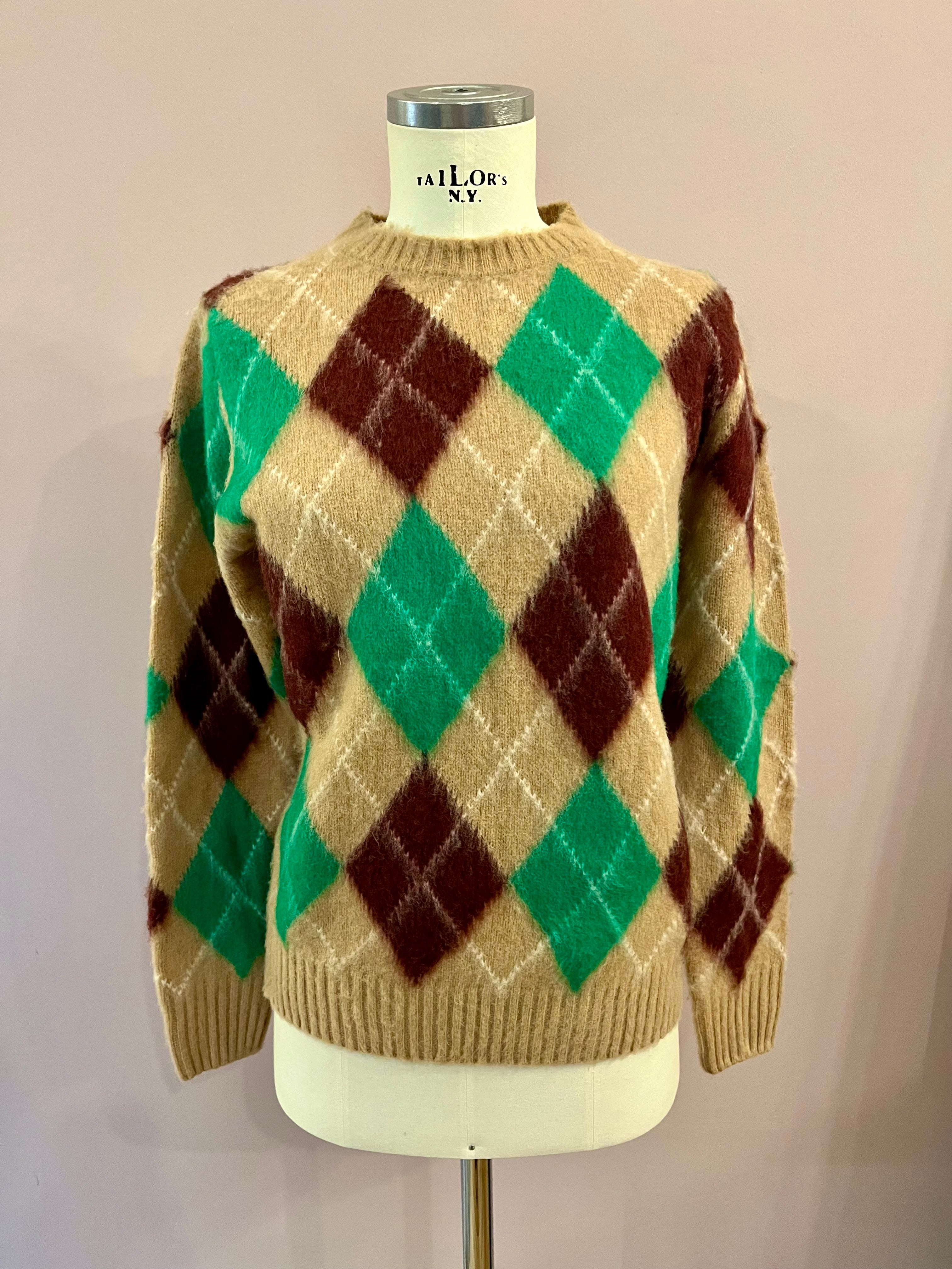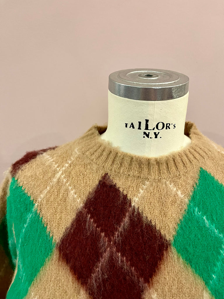 Kontrastierender Rundhals-Pullover mit Argyle-Muster in Sand, Grün und Burgund von ASPESI. Dieser Klassiker aus einer leicht aufgerauten Wollqualität zieht garantiert alle Blicke auf sich. Die rautenförmig angeordneten Farbfelder werden von weißen Streifen gekreuzt. Die Abschlußbündchen sind aus Rippenstrick in Sandfarbe gearbeitet.