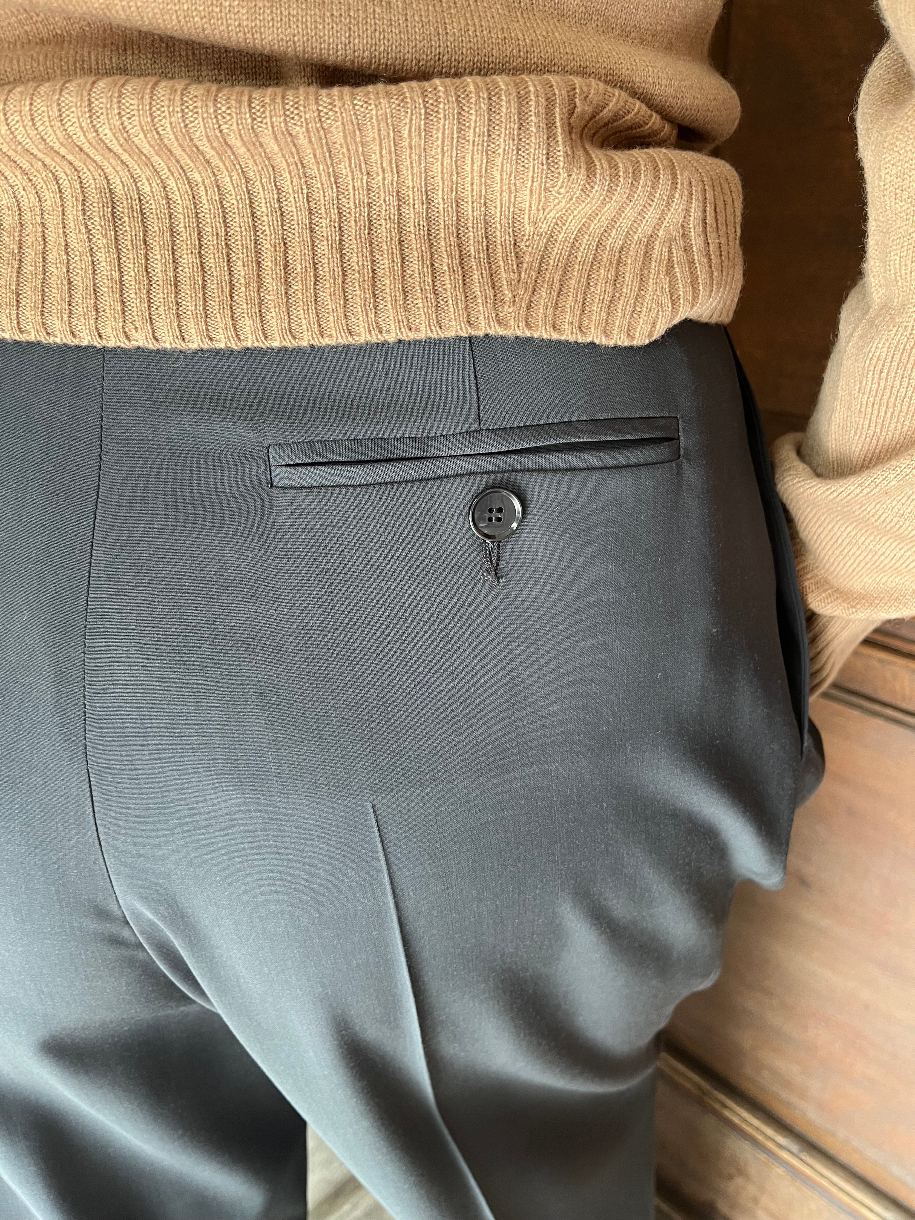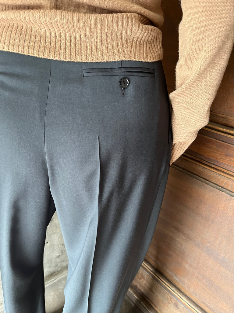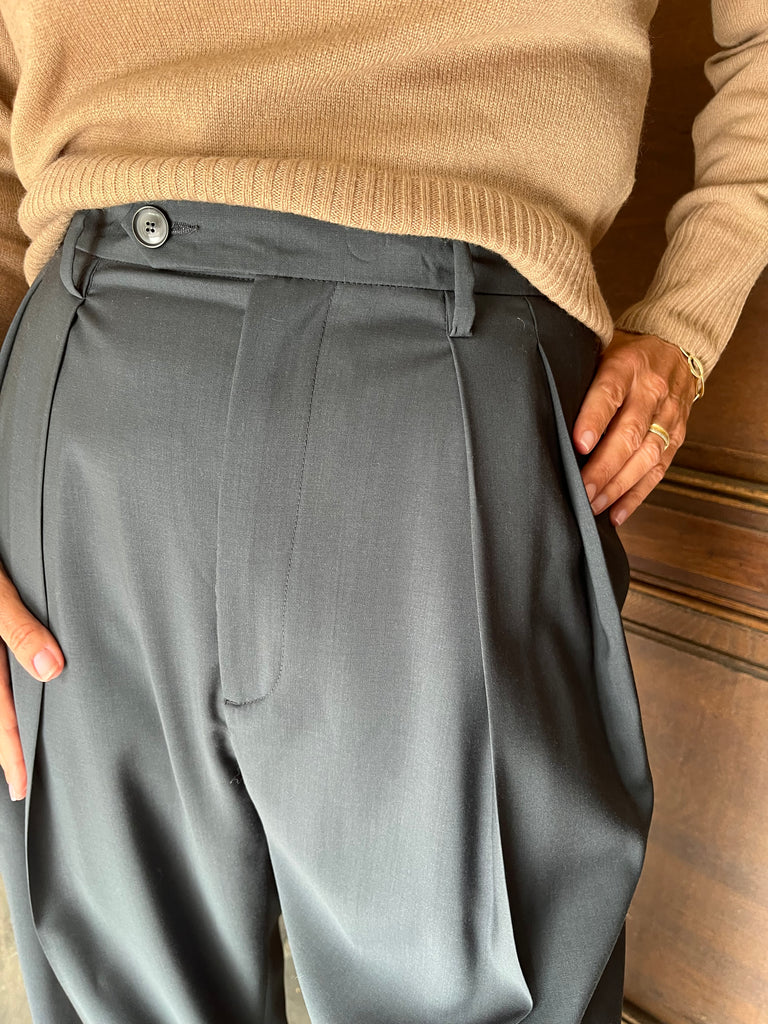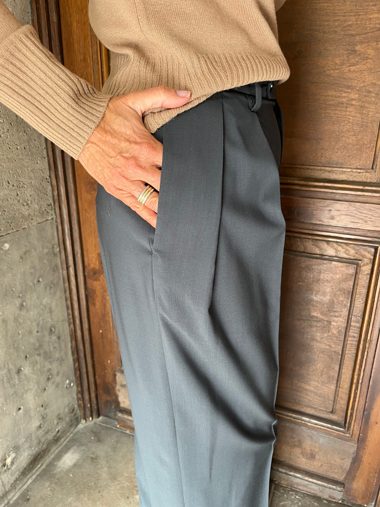 Wunderschöne Hose mit Bundfalten in Schiefergrau von Barena Venezia. Sie ist gerade geschnitten und hat ein eher weites Bein. Die hochwertige Wolle bietet einen weichen Griff, sorgt für angenehmen Tragekomfort und einen minimalistischen und dennoch raffinierten Look. Cool-Wool kratzt nicht. Perfekt auch in Kombination mit der schwarzen Tunika von Barena Venezia.