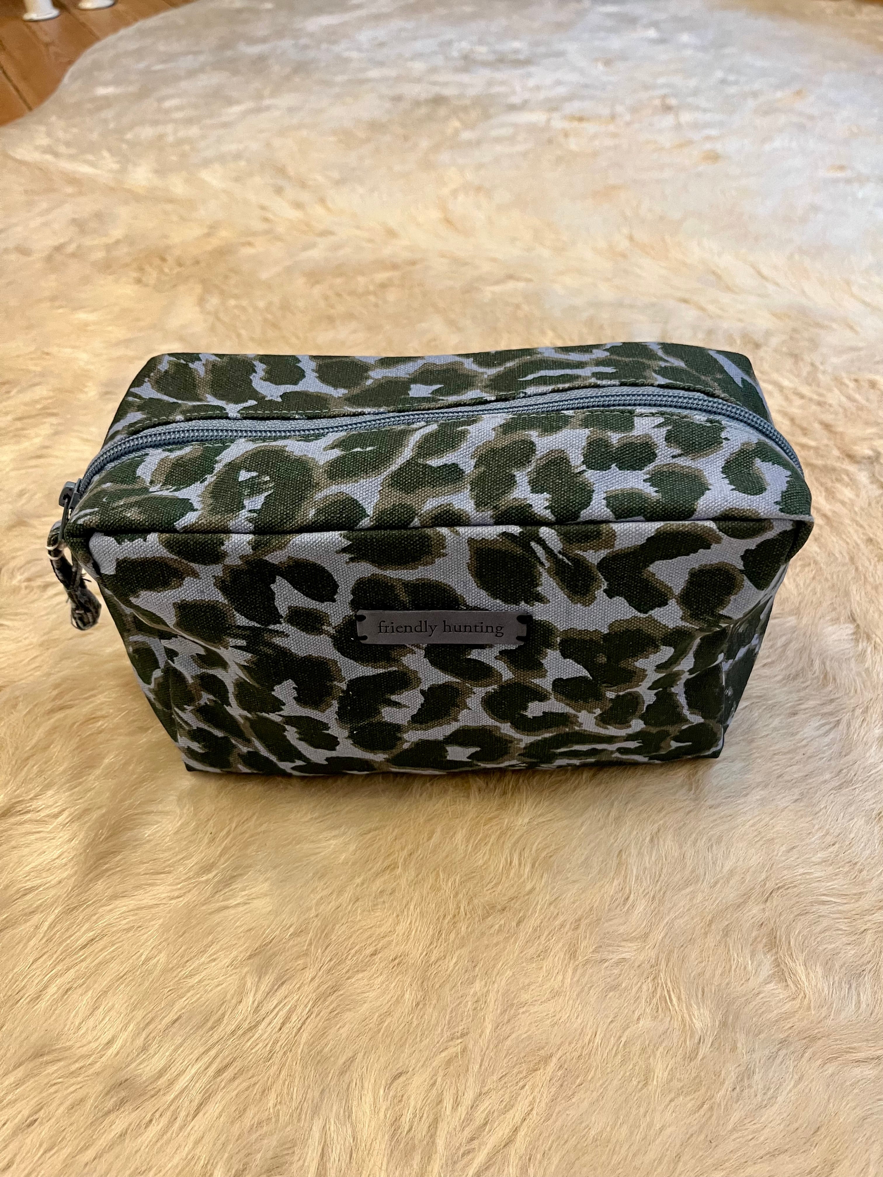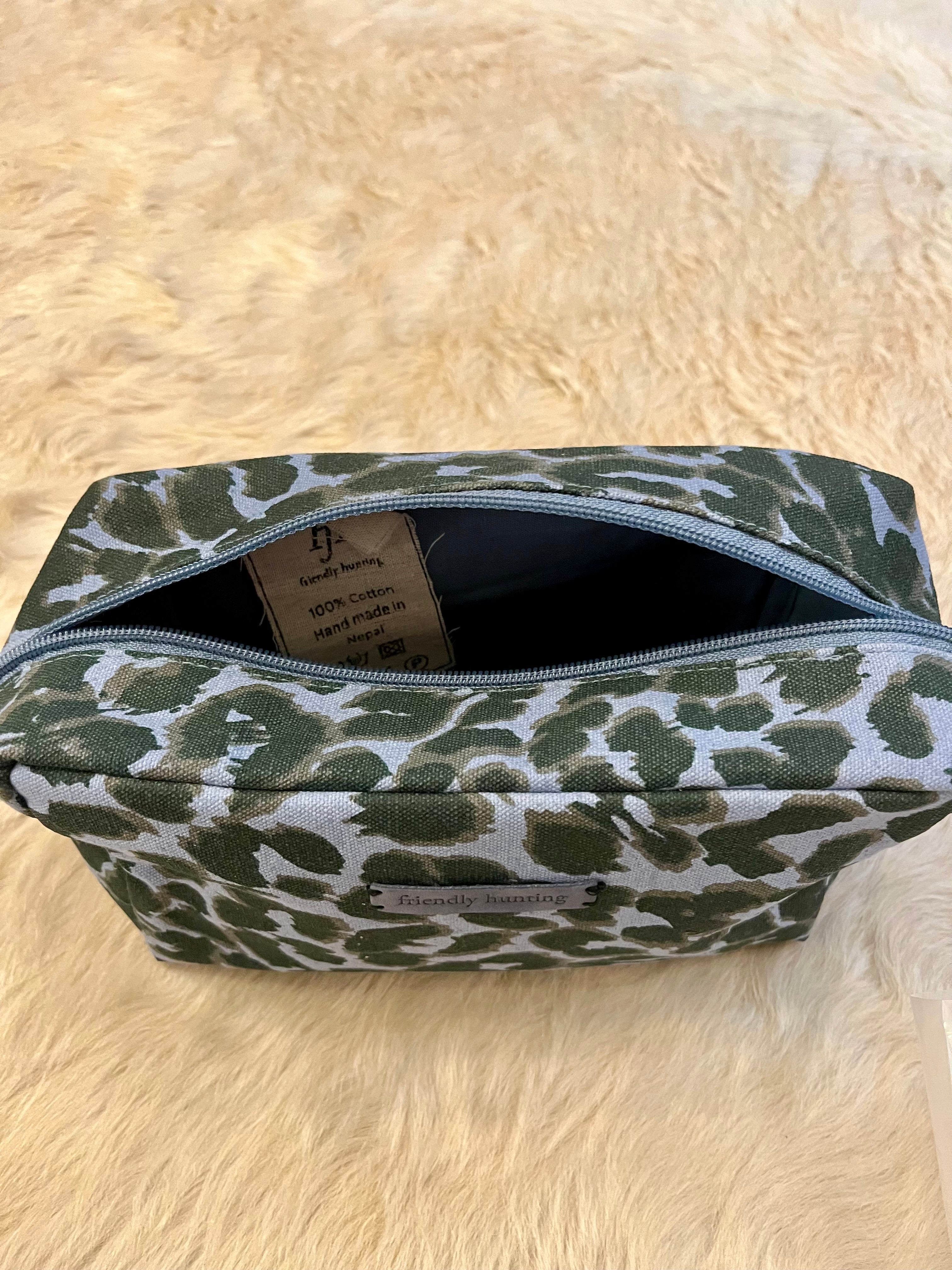 Kulturtasche von Friendly Hunting mit coolem Leo-Print in Hellblau, Dunkelgrün und Braun-Grau. Mit Reißverschluss und kleinem Patch mit Label-Signatur.
