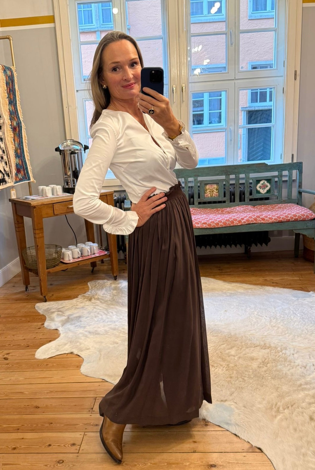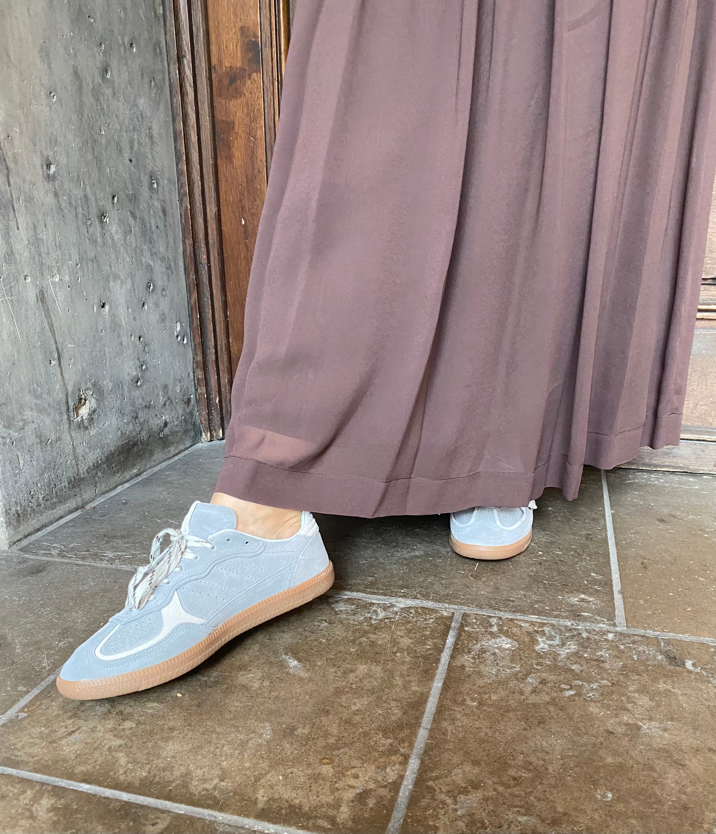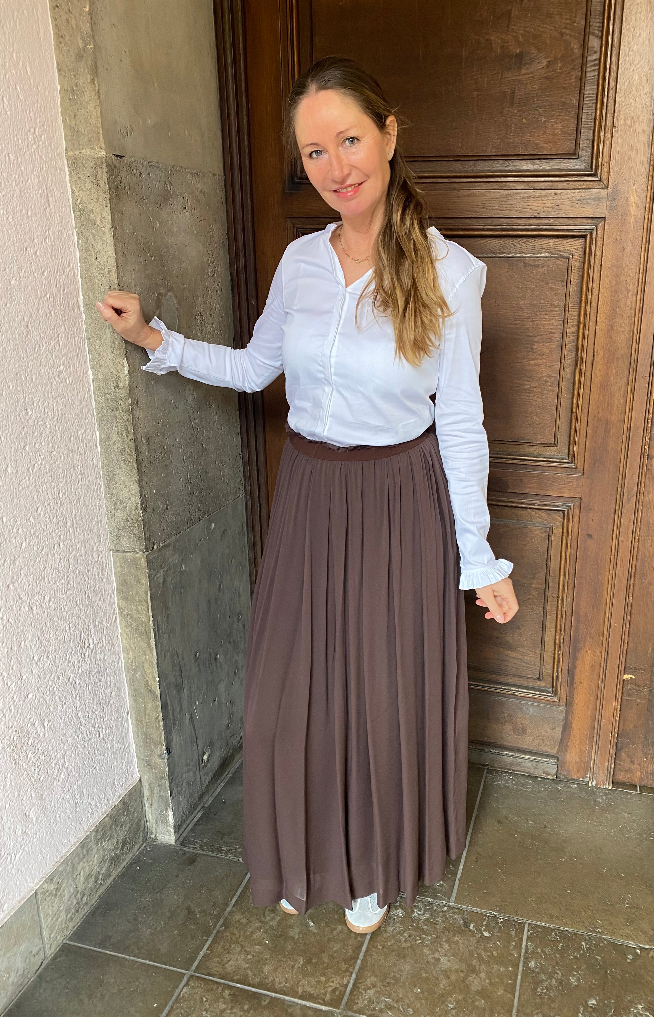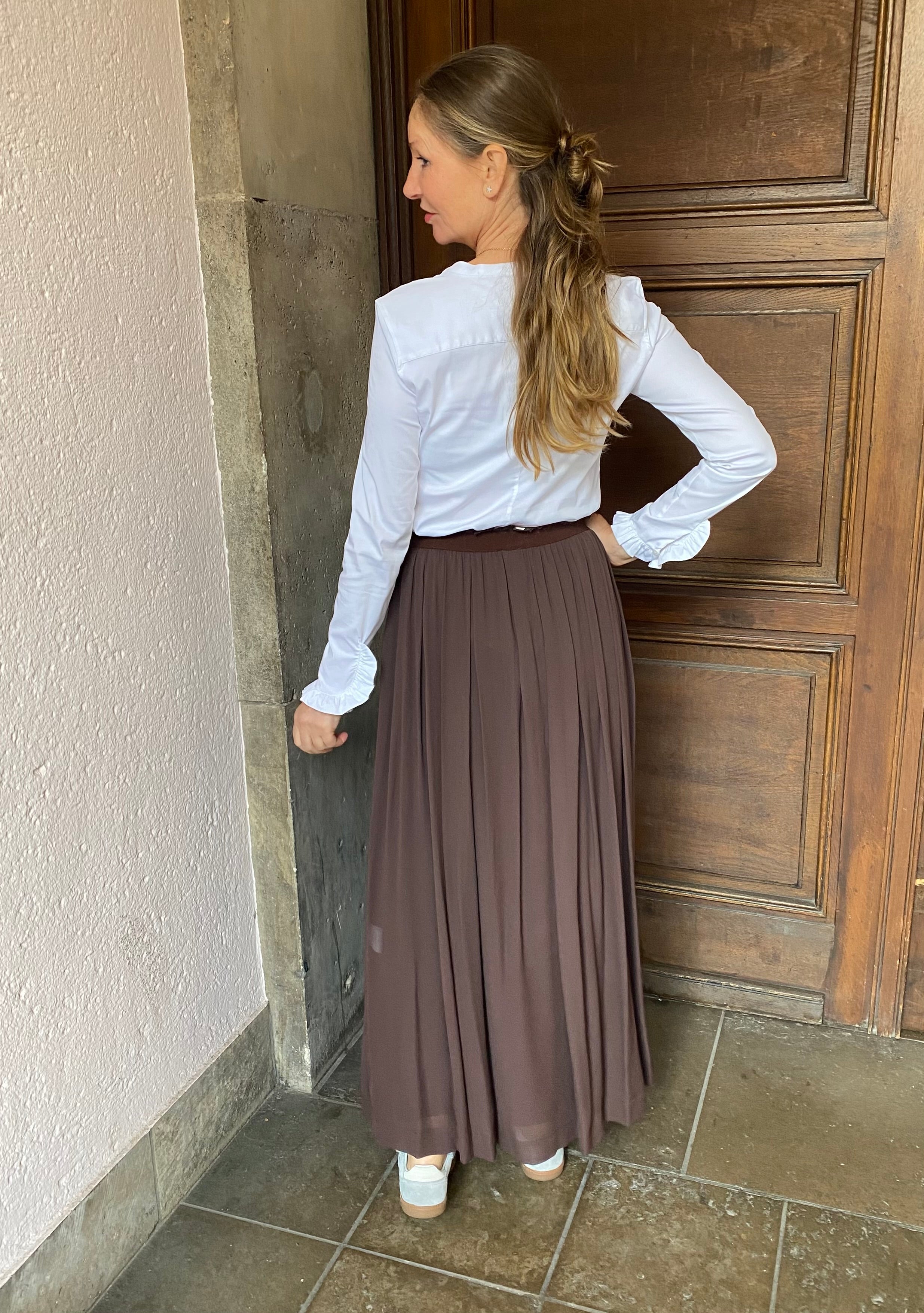 Hauchzarter Viscoserock in einem warmen Mokkabraun von Jucca. Der knöchellange Rock hat einen flexiblen Bund mit feinen Raffungen, die für Volumen sorgen, ohne aufzutragen. Der eingeknöpfte, hochgeschlitzte Unterrock sorgt dafür, dass der transparente Rock nicht durchsichtig ist.