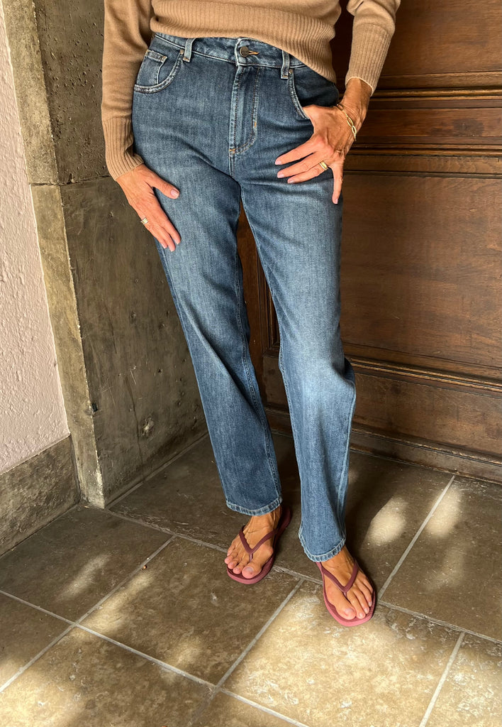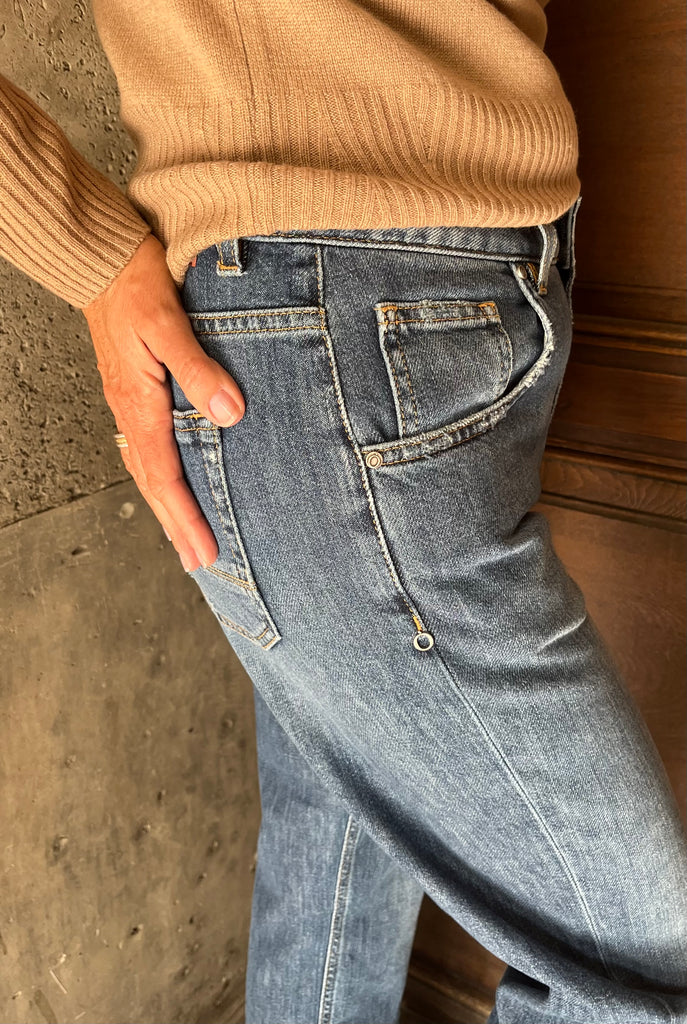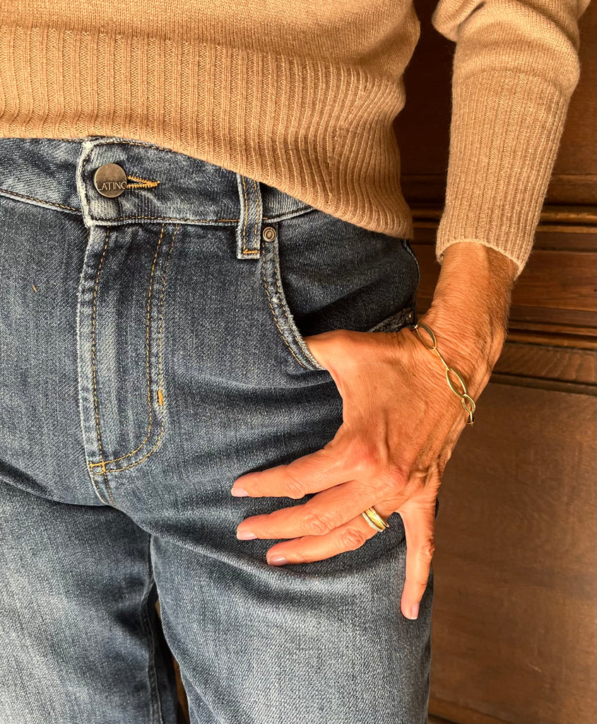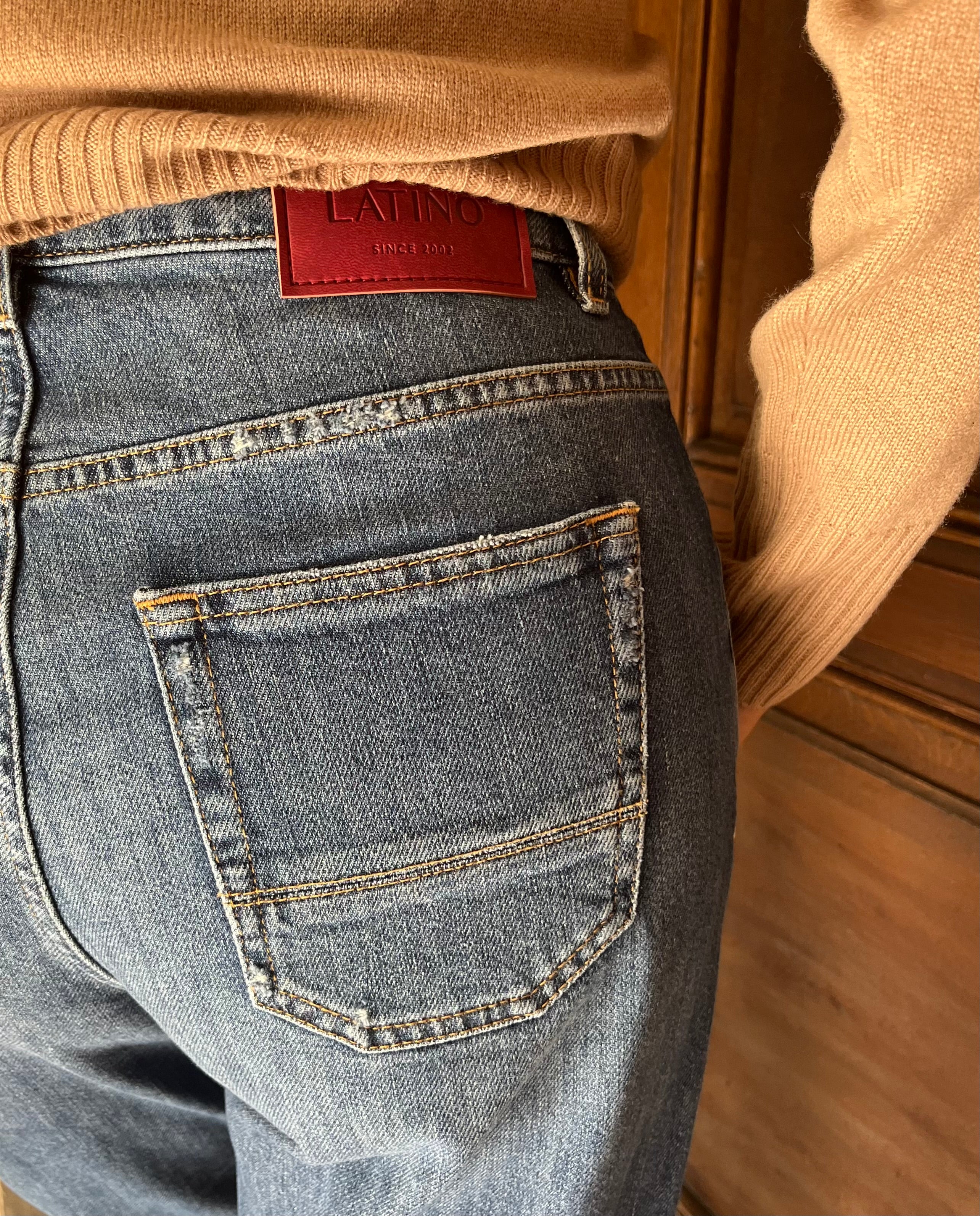 Die Jeans hat eine komfortable mittlere bis hohe Leibhöhe und ist dank des angenehmen Materialmixes wunderbar soft auf der Haut. Das Bein ist oben lässig geschnitten und verläuft nach unten hin gerade und zaubert so eine tolle Figur. Die mittellblaue Waschung hat ein perfektes Bleeching, was die schöne Silhouette zusätzlich unterstreicht. Attraktiver Metall-Knopf mit Latino-Prägung. Latino-Logo-Patch in Bordeaux. Made in Italy.