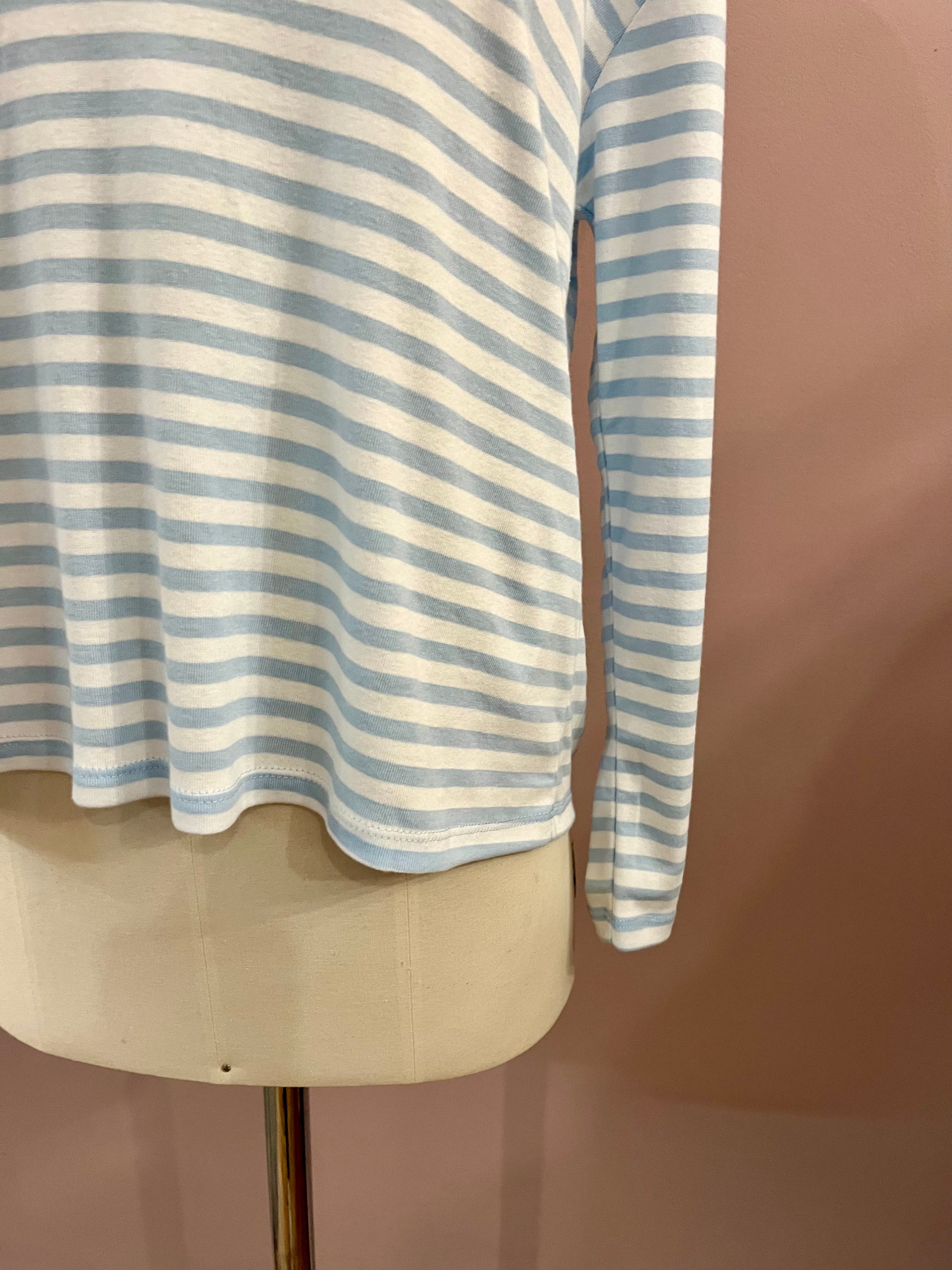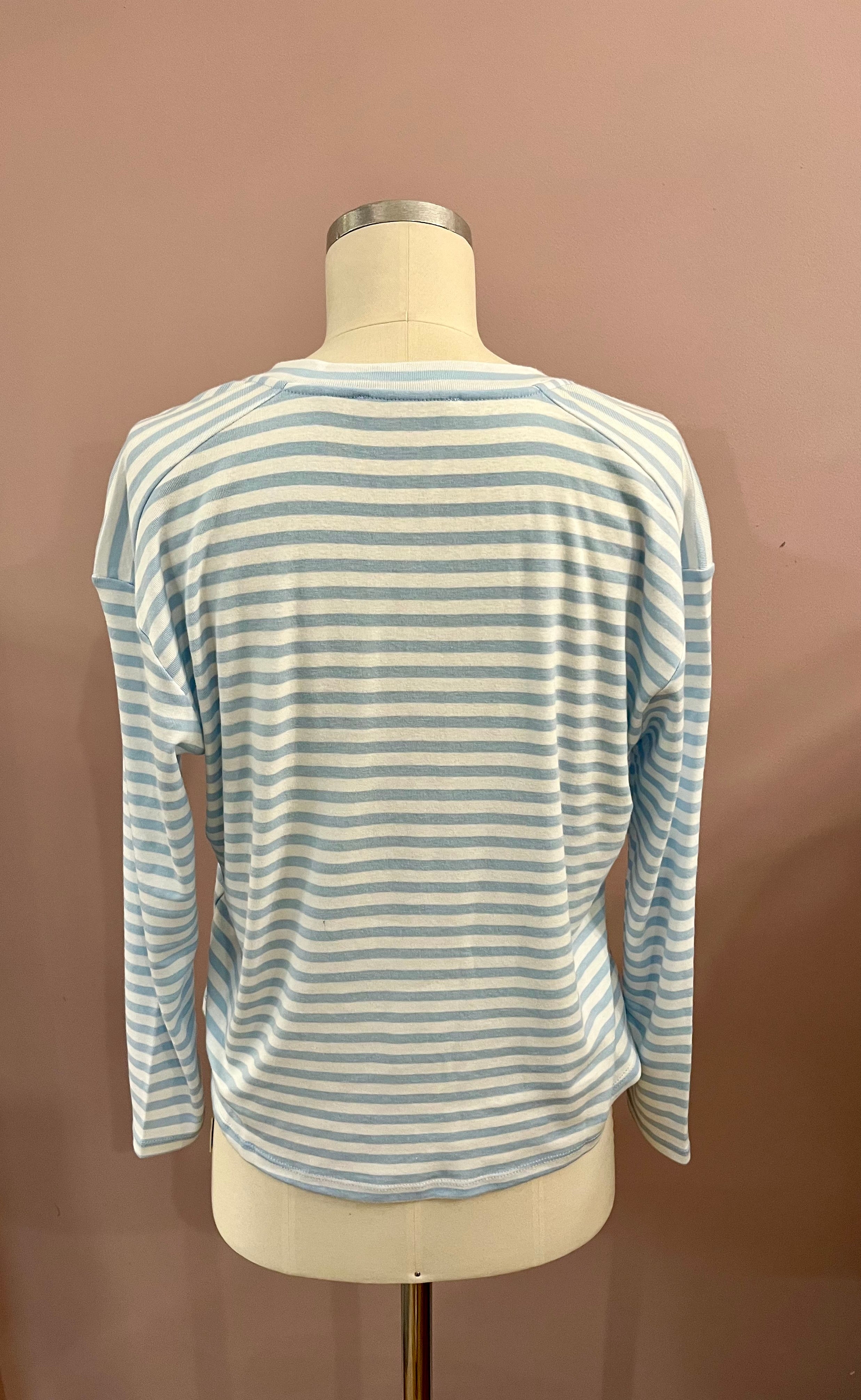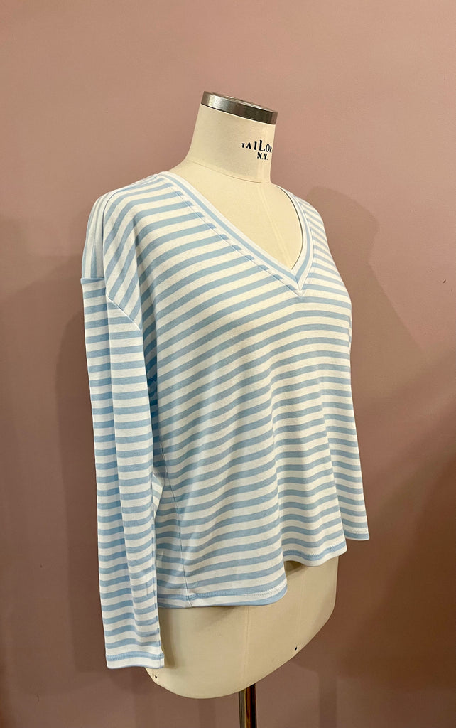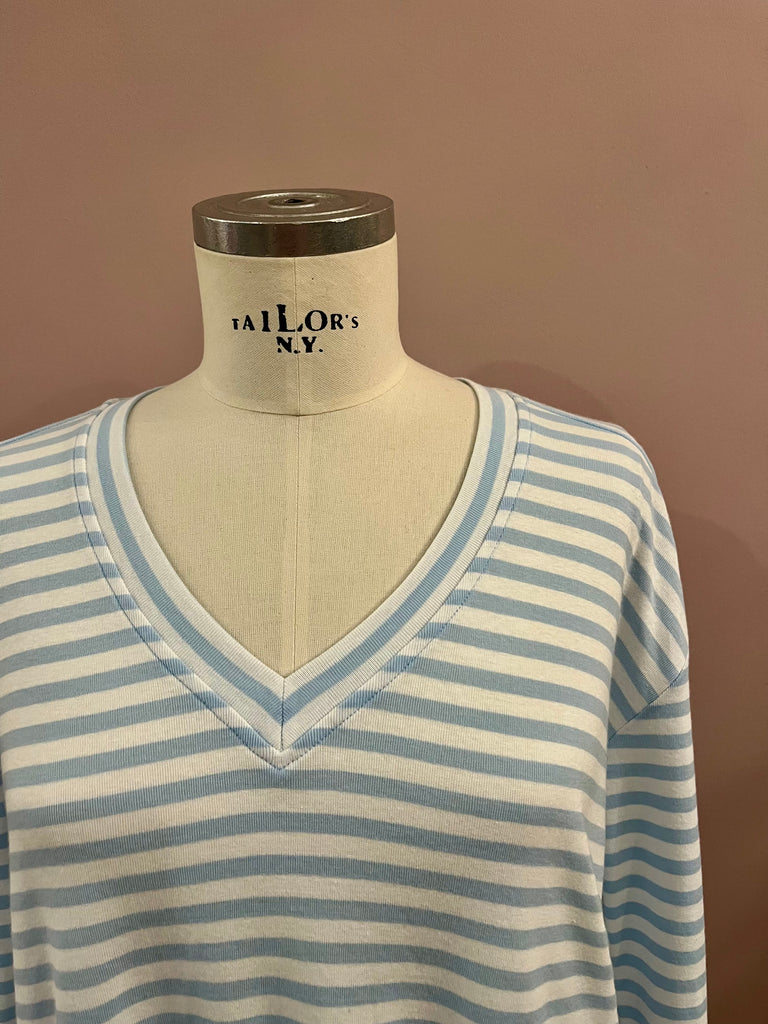 Angenehm weiches Streifen-Shirt in Weiß und Himmelblau mit langem Arm und V-Neck von NARLI. Leicht kastige Schnittführung mit überschnittenen Ärmeln und attraktivem Rippstrickbündchen am Ausschnitt. Ein wundervolles Basic für das Frühjahr.