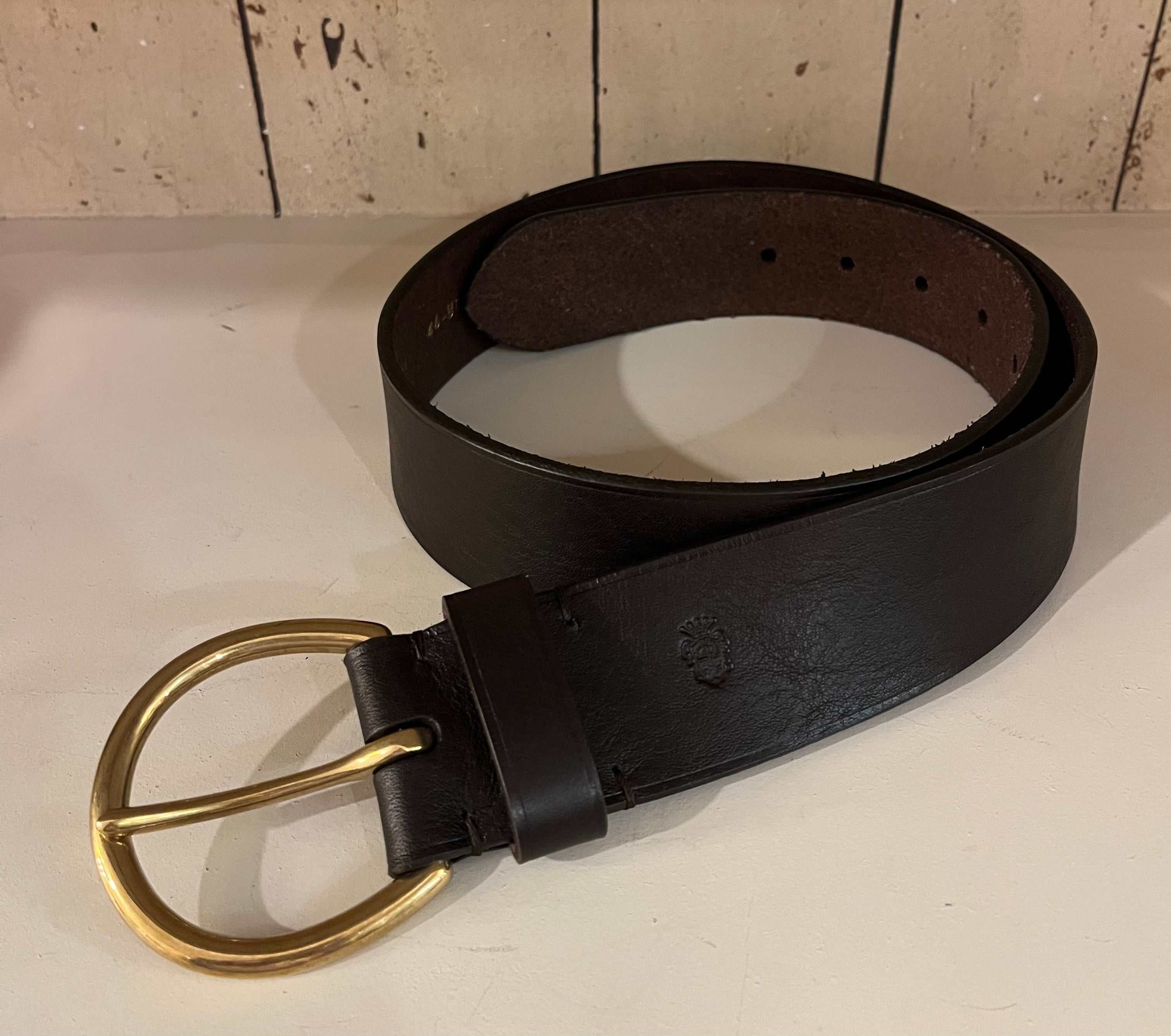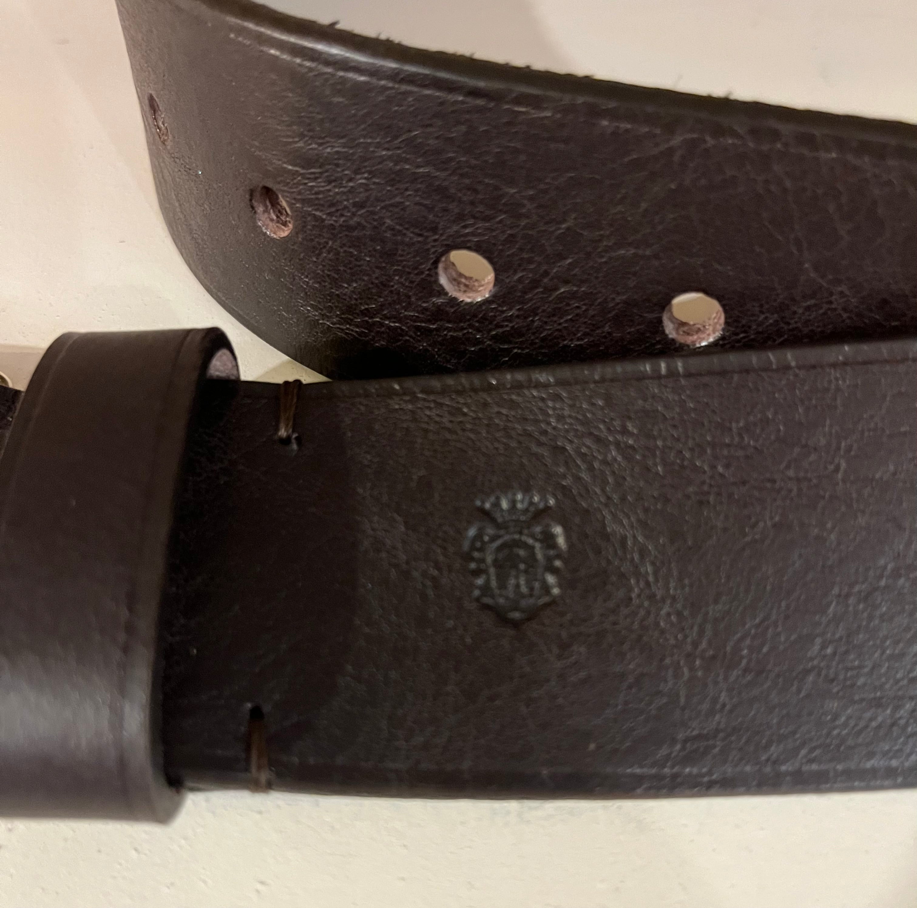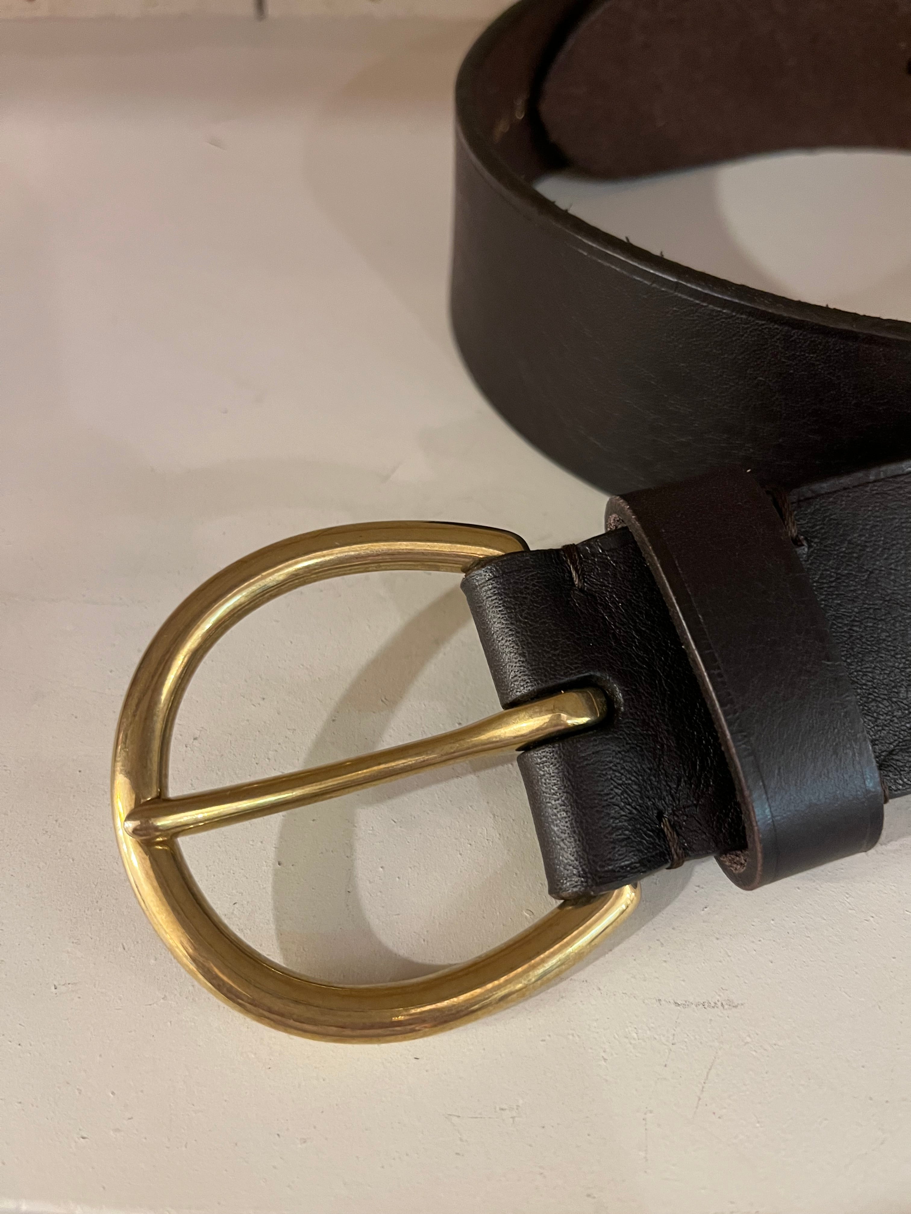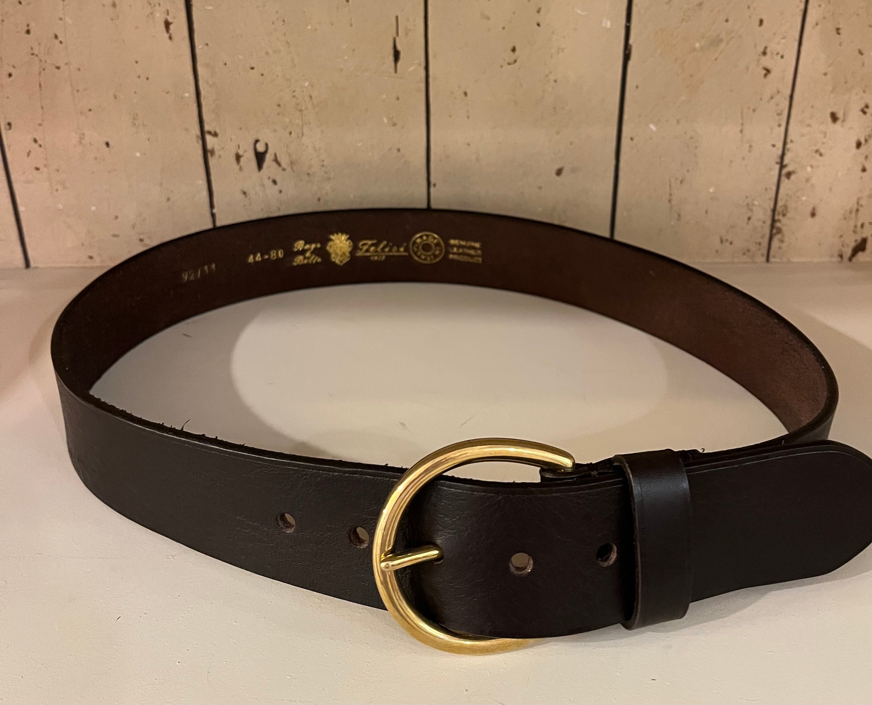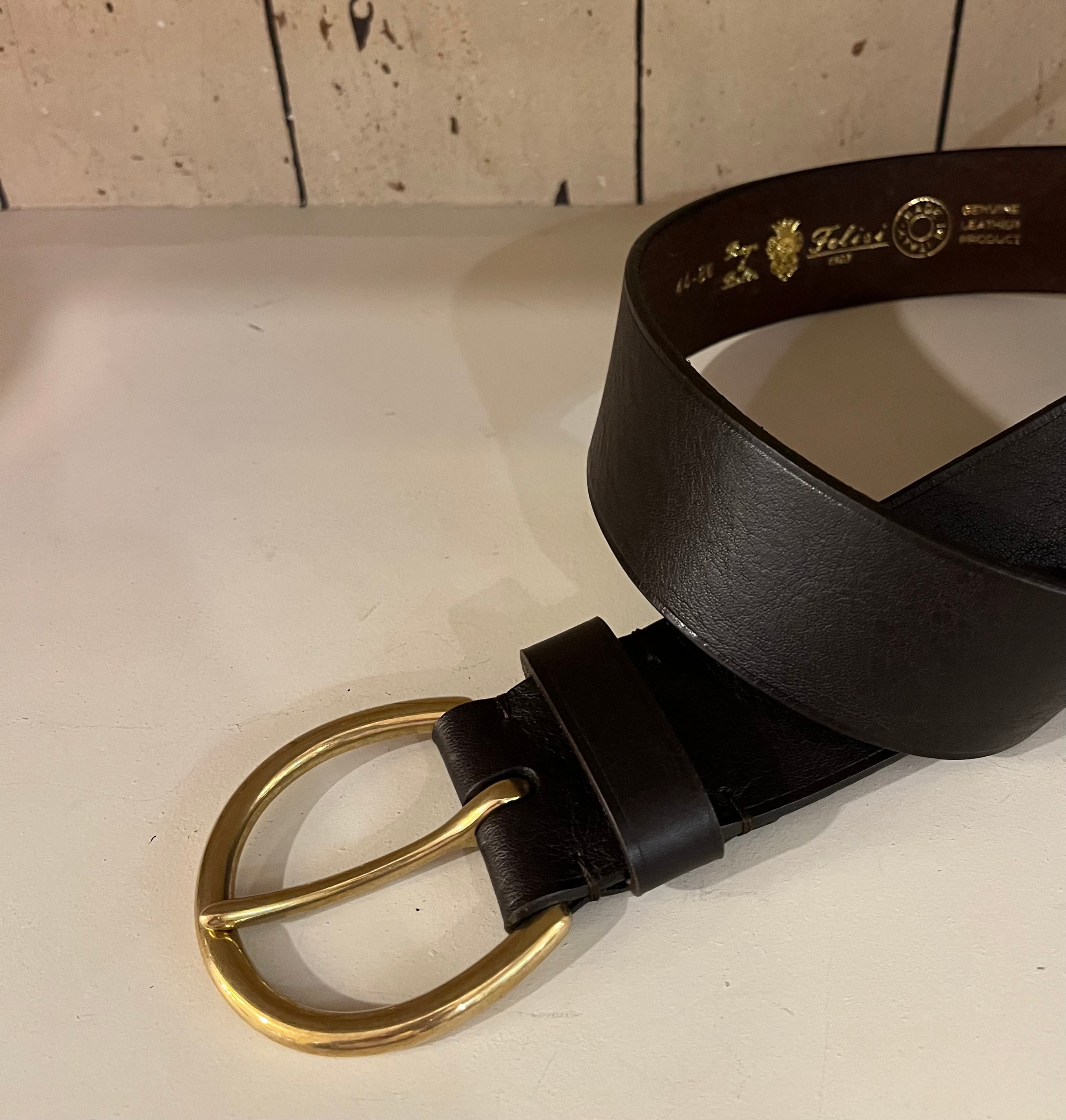 Gebogter Glattleder-Gürtel in einem dunklen Kaffeebraun von Felisi. Mit feiner Struktur und breiter Fixierungsschlaufe. Die Dornschließe aus poliertem Messing hat eine leichte Hufeisenform. Der 4,5 Zentimeter breite, kräftige Lederriemen ist pflanzlich gegerbt und mit einer dezenten Rahmenprägung versehen. Seine Breite ist optimal für die üblichen Gürtelschlaufen an Jeans, Palazzohosen und Röcken. Wunderschön!
