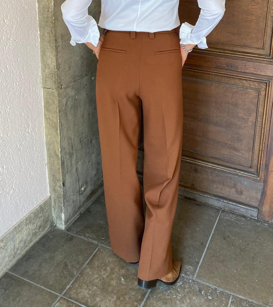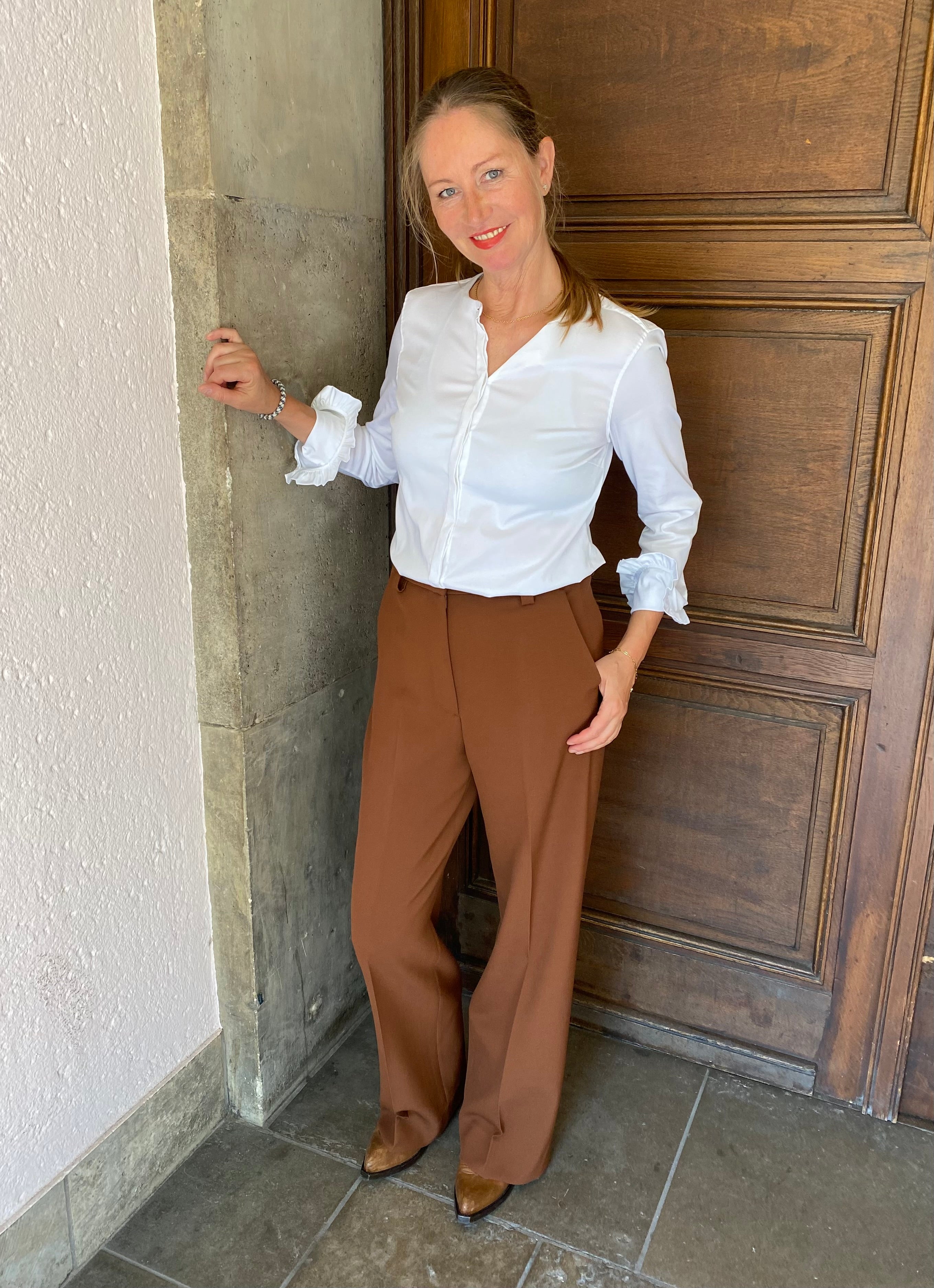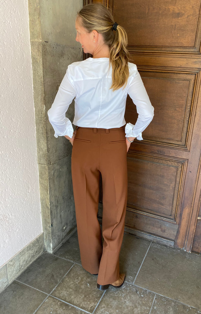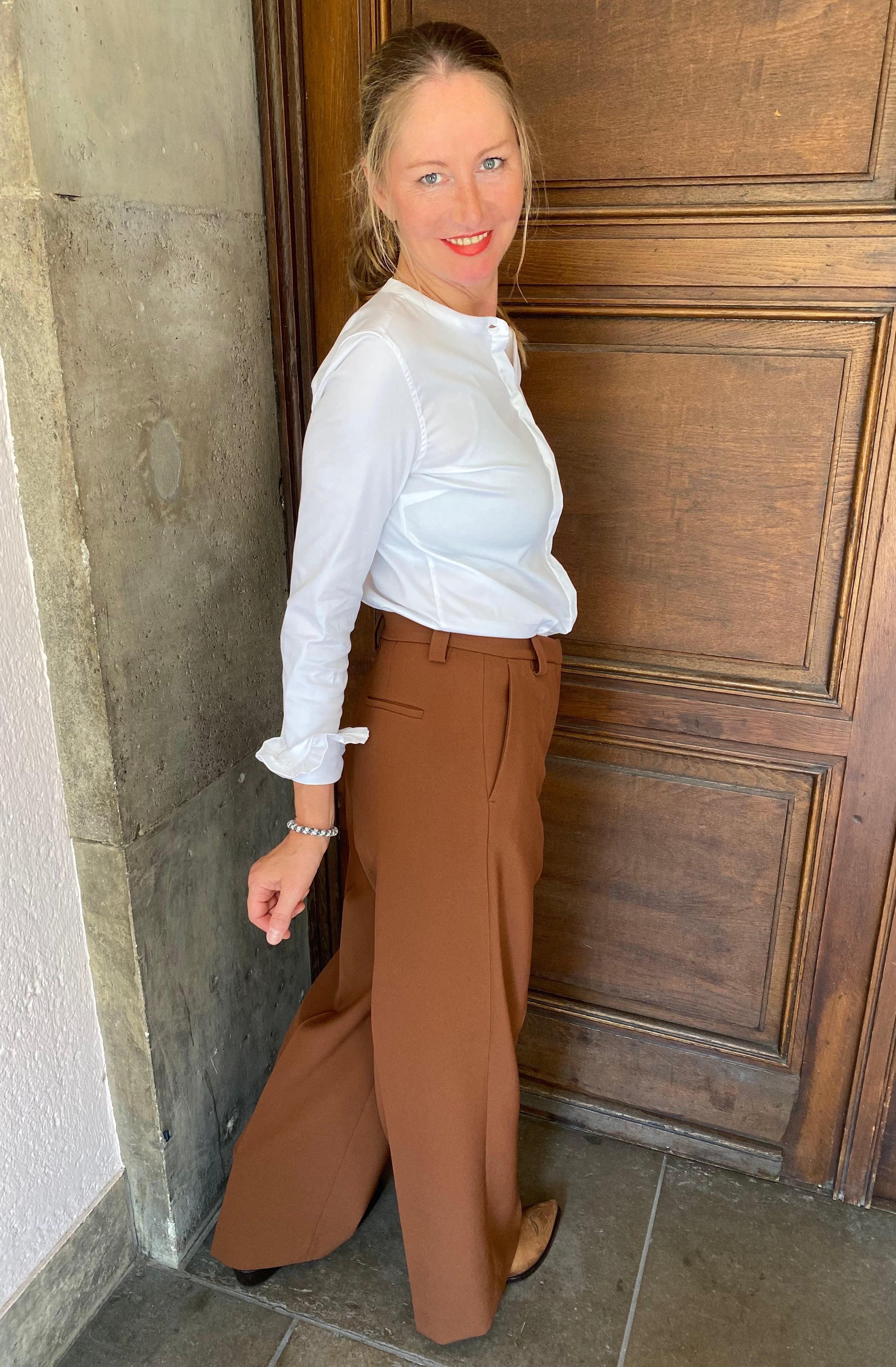 Schicke Palazzohose aus angenehmem Compact-Stretch in Haselnussbraun von Zenggi. Diese Hose sieht top aus und geht bei jeder Bewegung mit. Schräge Eingrifftaschen, Gürtelschlaufen und paspellierte Backpockets sind weitere Details der unkomplizierten Hose, die nicht nur auf Reisen eine optimale Figur macht.