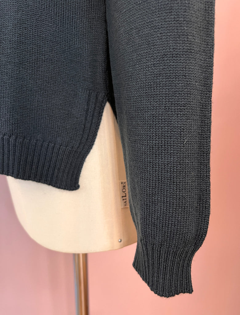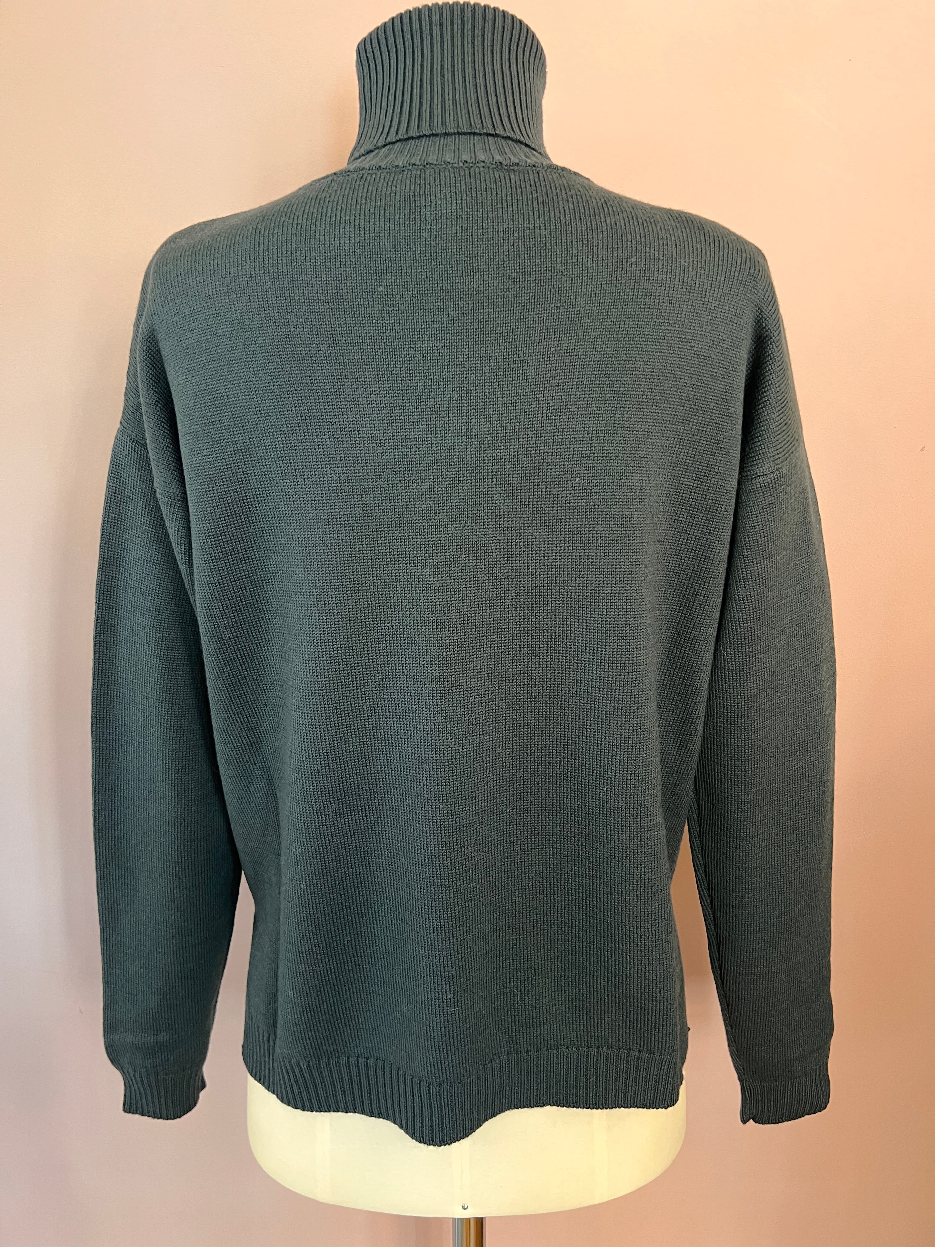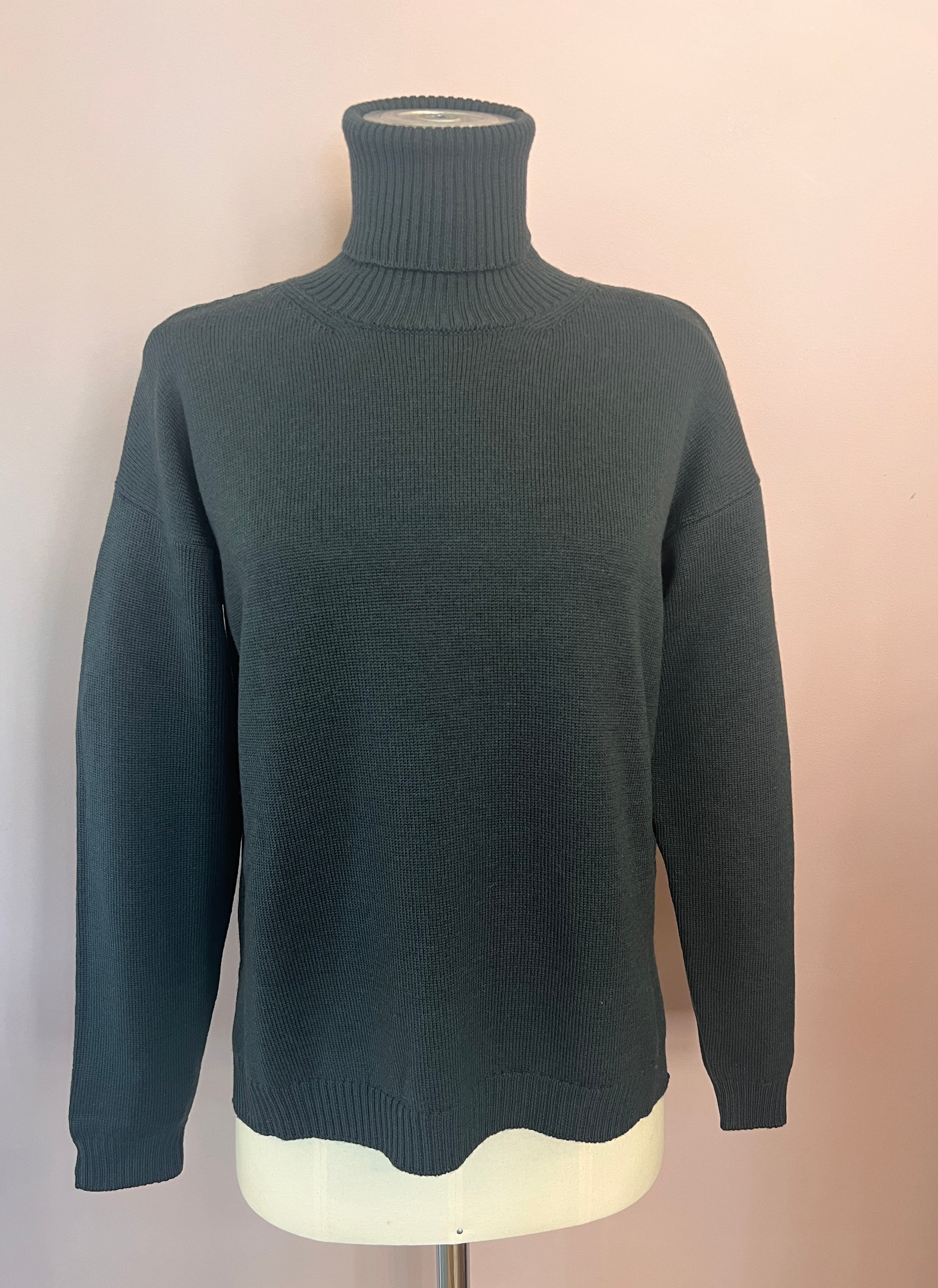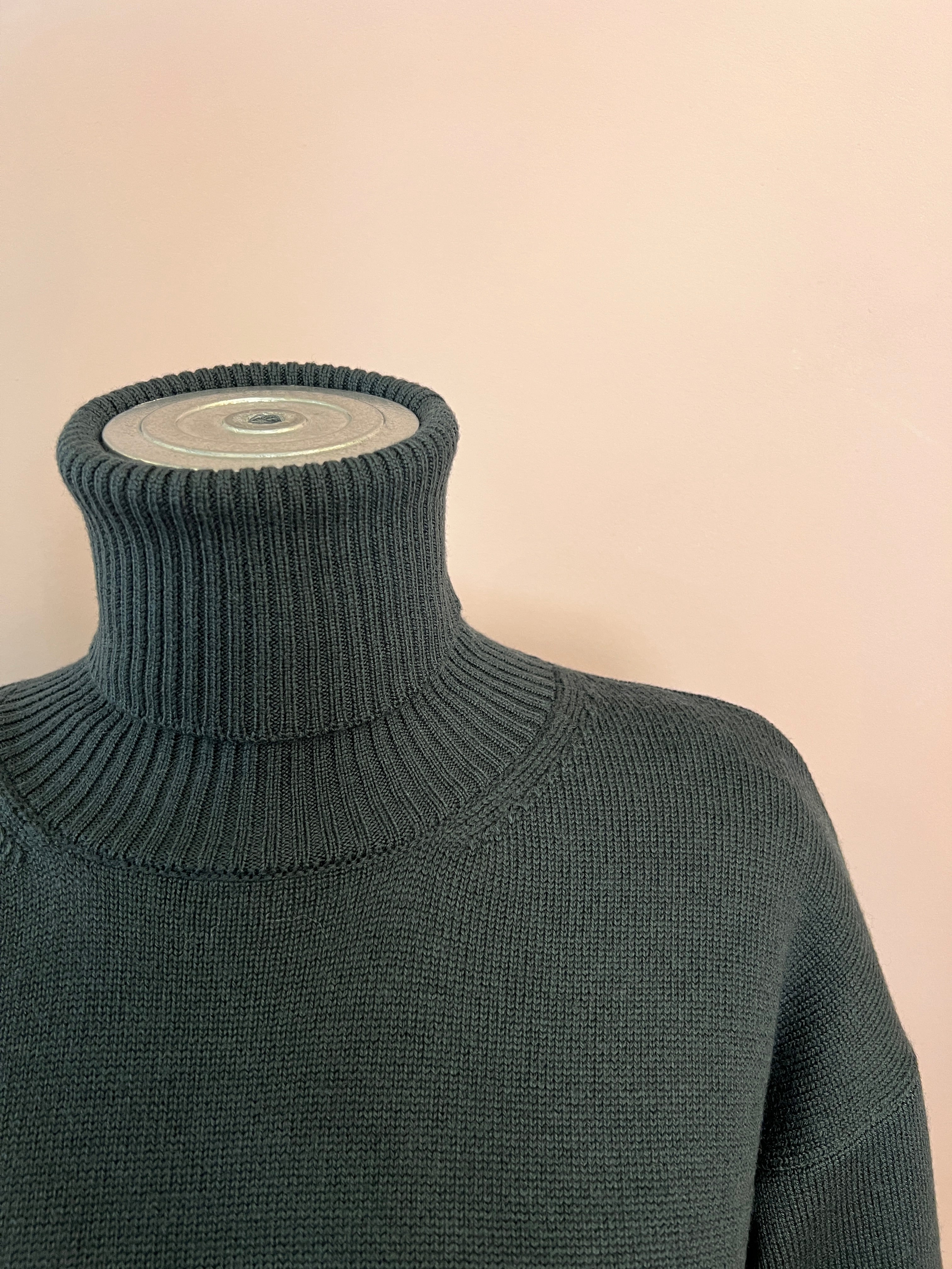 Gerade geschnittener Rollkragen-Pullover in einem dunklen Waldgrün von Crossley. Mit schönen Rippstrick-Details an den Abschlüssen und seitlichen Cut-outs. Ein feiner Klassiker mit zeitlosem Schnitt.