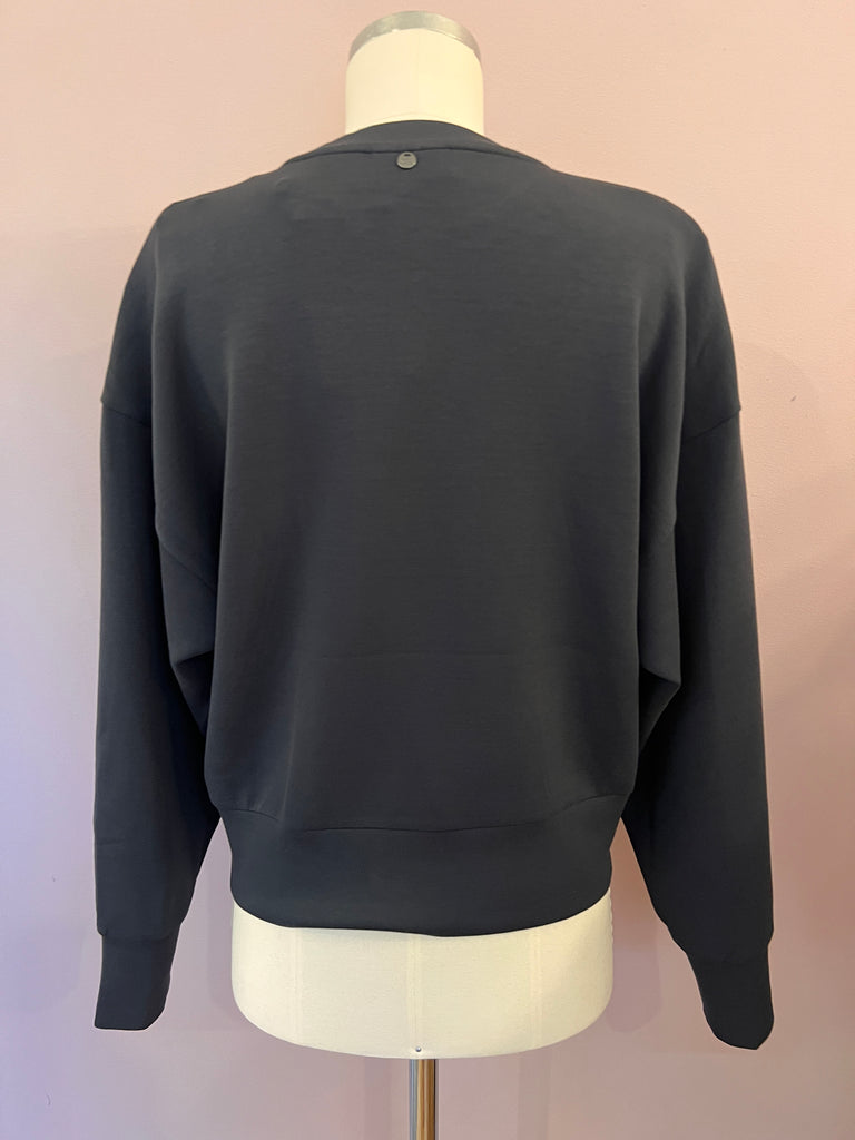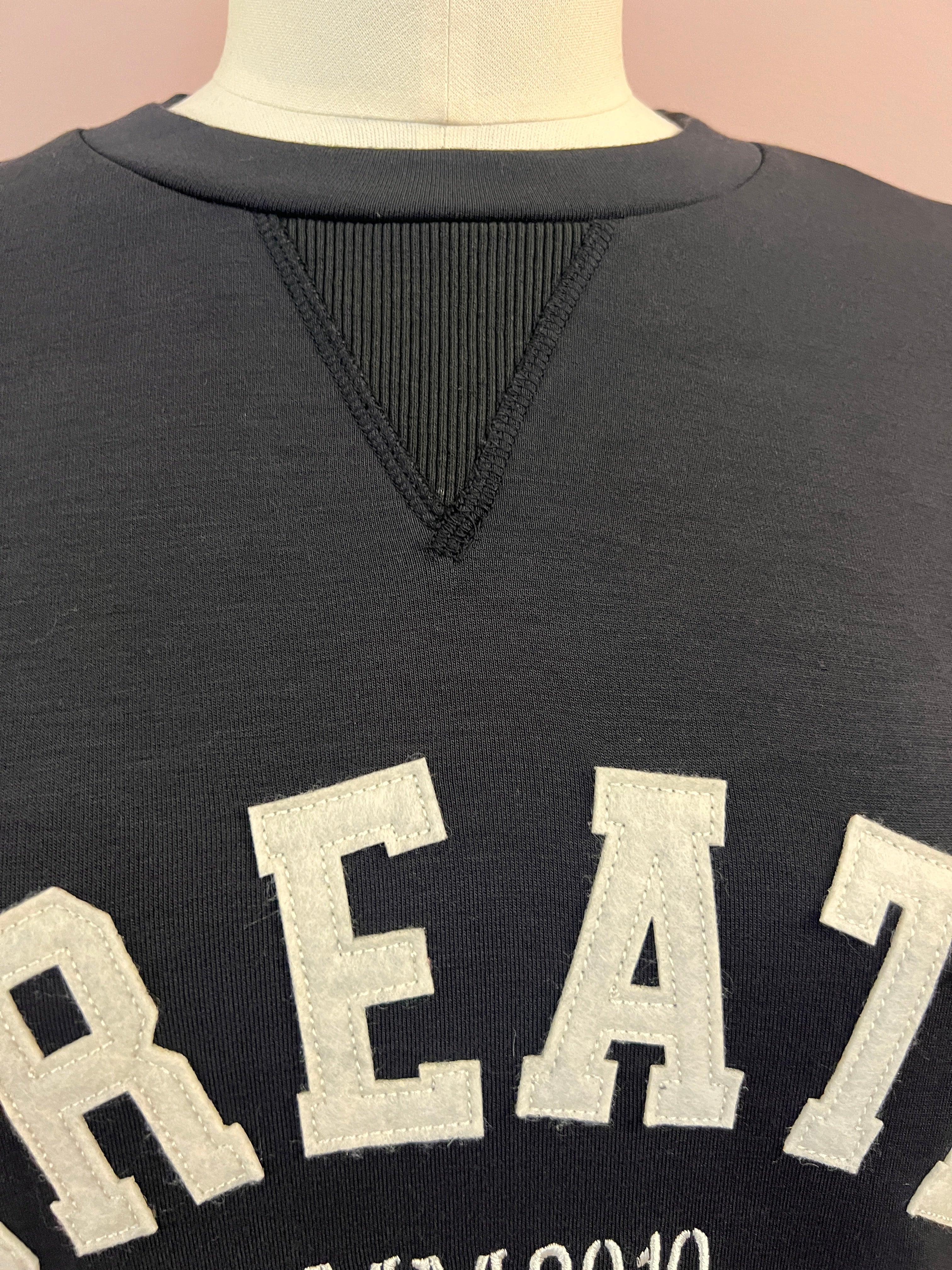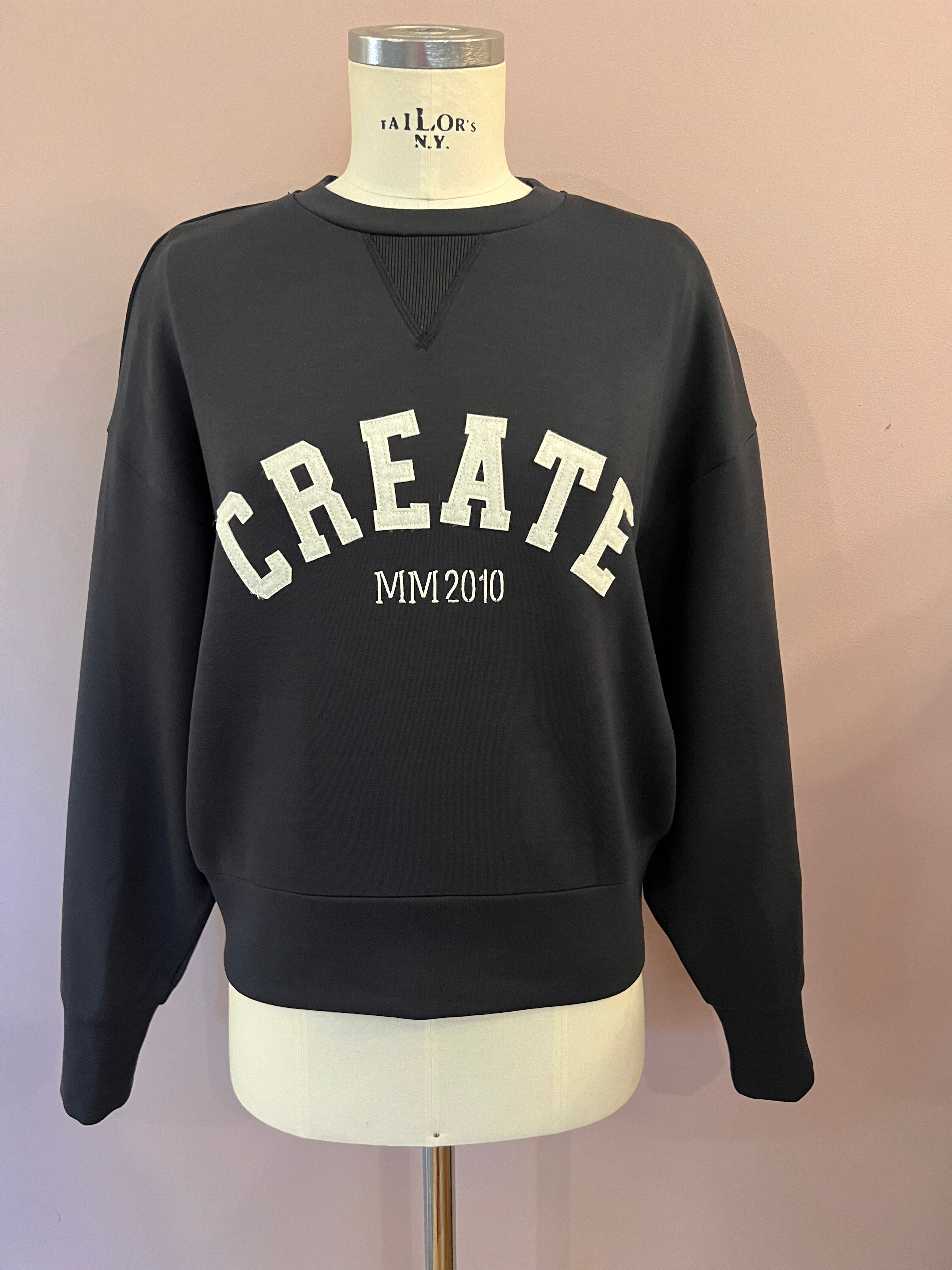 Kuschelsuchtgefahr! Supersofter Sweater in Phantomschwarz von Mos Mosh. Der feine Materialmix mit umweltfreundlicher EcoVero-Viscose aus Österreich macht das kastig geschnittene Sweatshirt absolut lieblingsteilverdächtig. Mit breiten Rippbündchen als Abschluss von Ärmeln und Bund. Der in Weiß applizierte Schriftzug "Create" sorgt für kreative Stimmung - nicht nur bei der Trägerin!