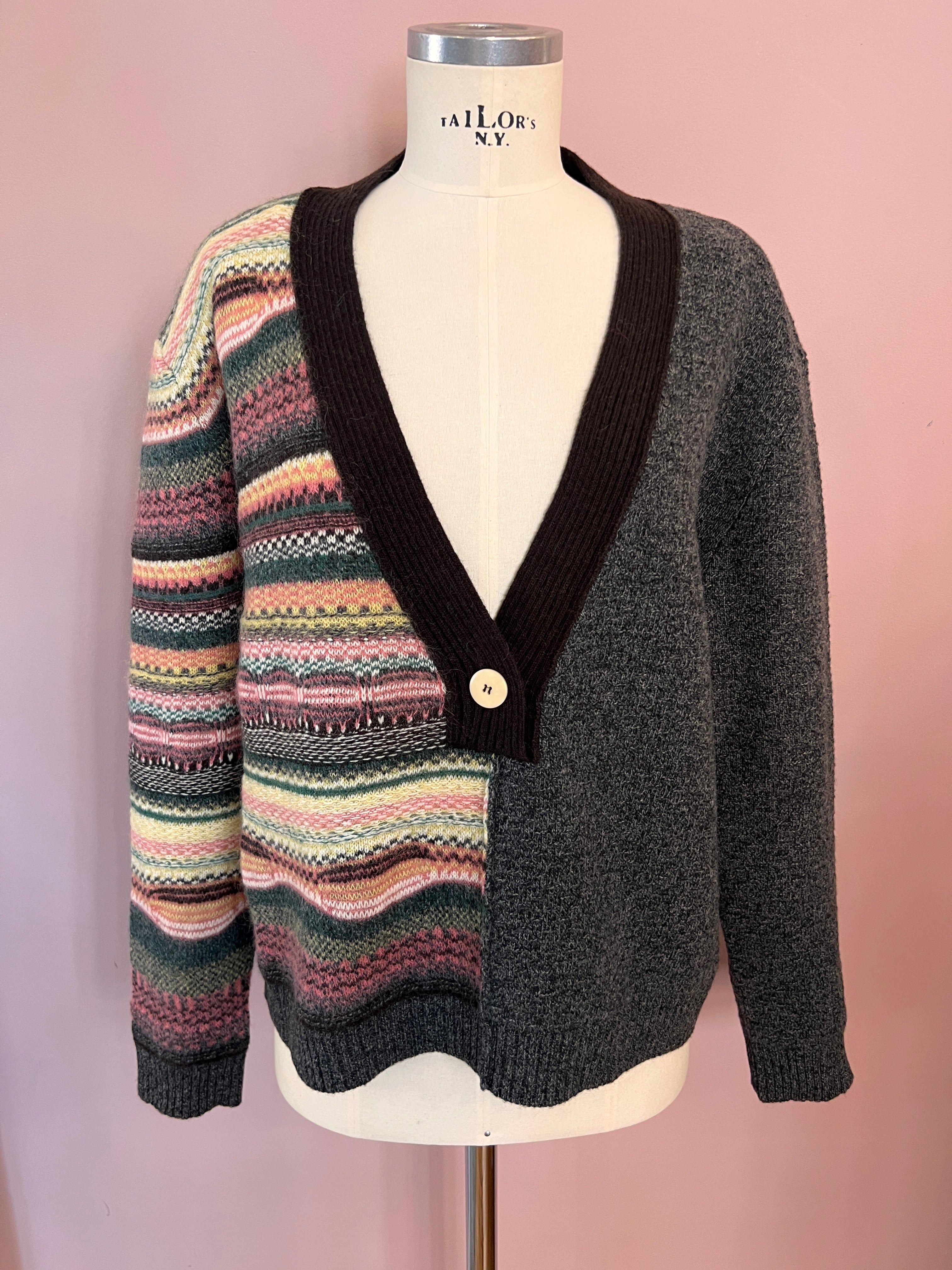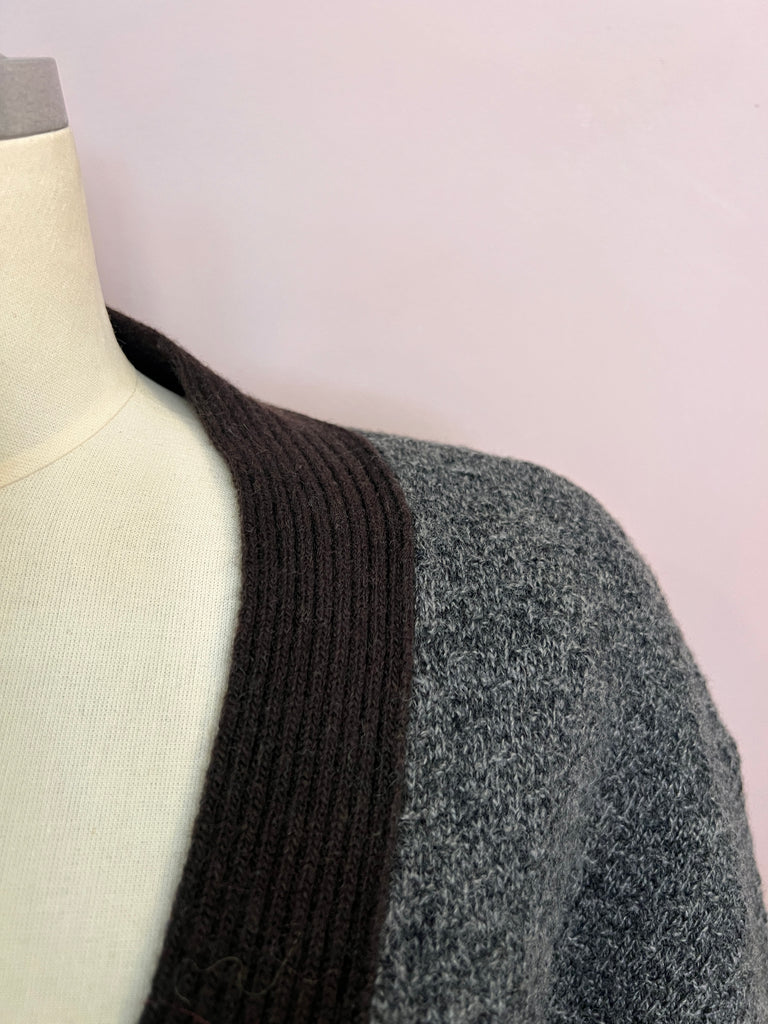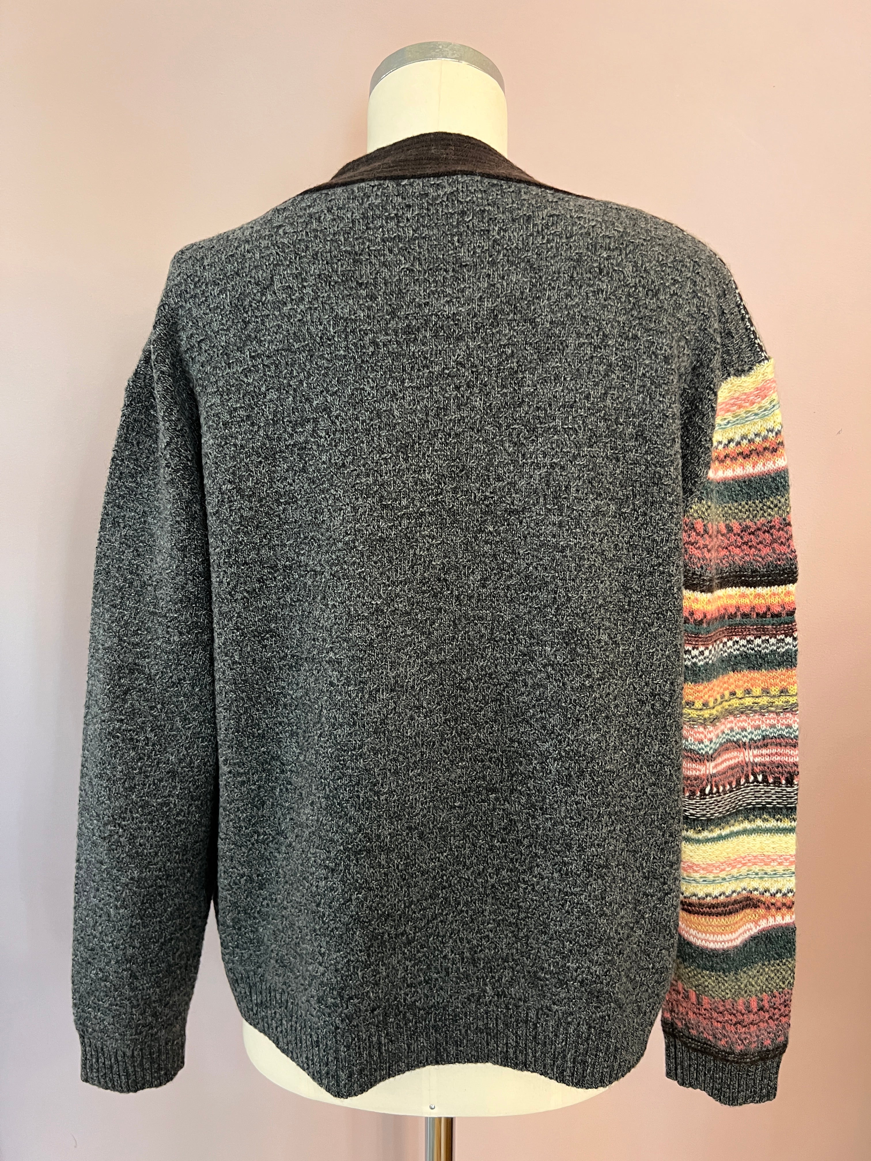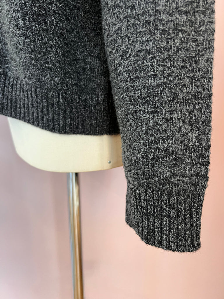Tief ausgeschnittener V-Neck-Pullover in Carbon-Melange von Phisique du Role. Die vordere Hälfte und ein Ärmel des raffinierten, oversized geschnittenen Pullovers sind in "british-mixed-Jacquard" gestrickt. Der tiefe V-Ausschnitt hat einen dunkelbraunen Ripp-Strick-Saum und einen hellen Schließknopf in Hornoptik. Der feine Materialmix aus Schurwolle mit Mohair und Cashmere sorgt für eine angenehme Haptik und hohen Tragekomfort.