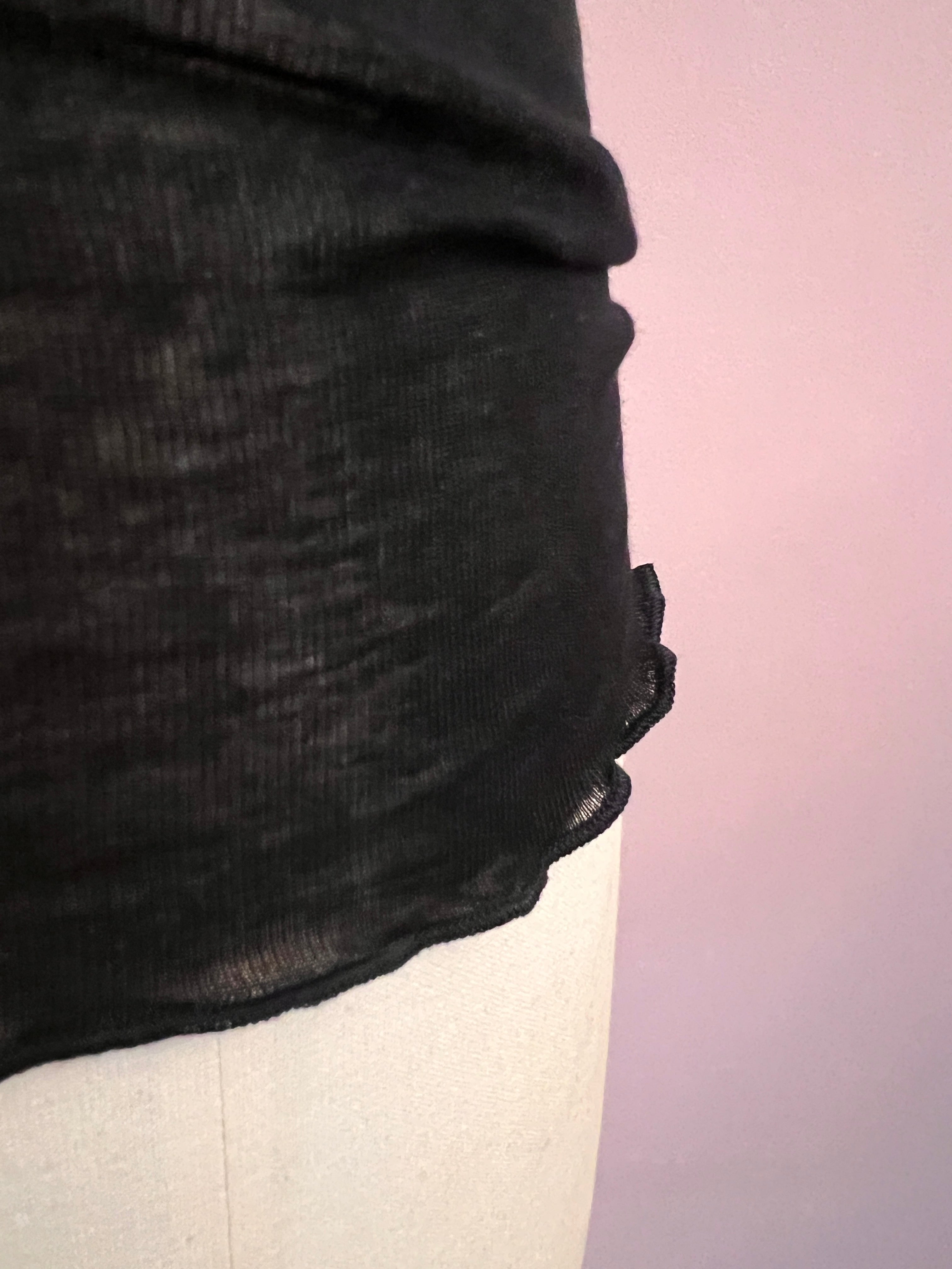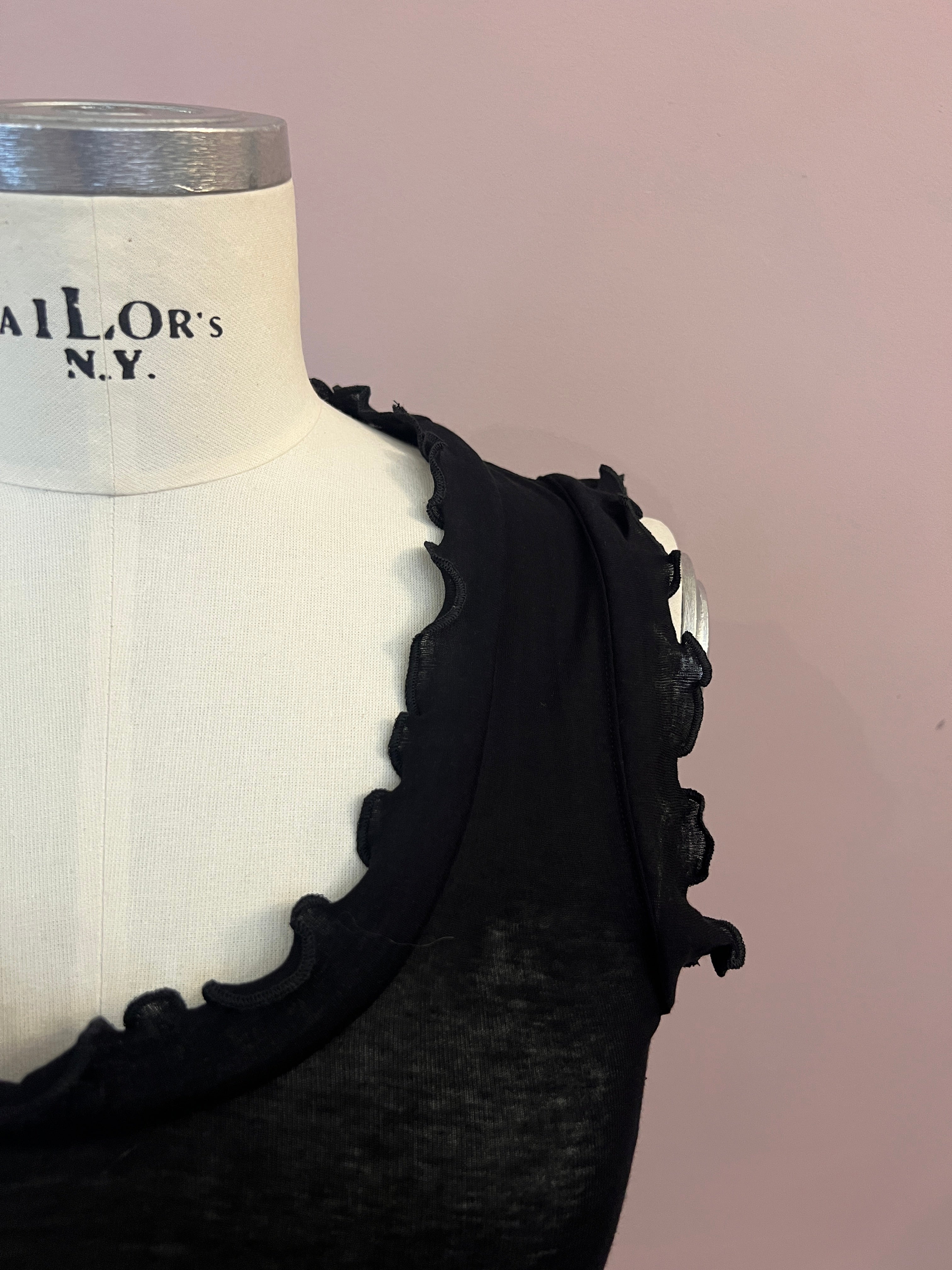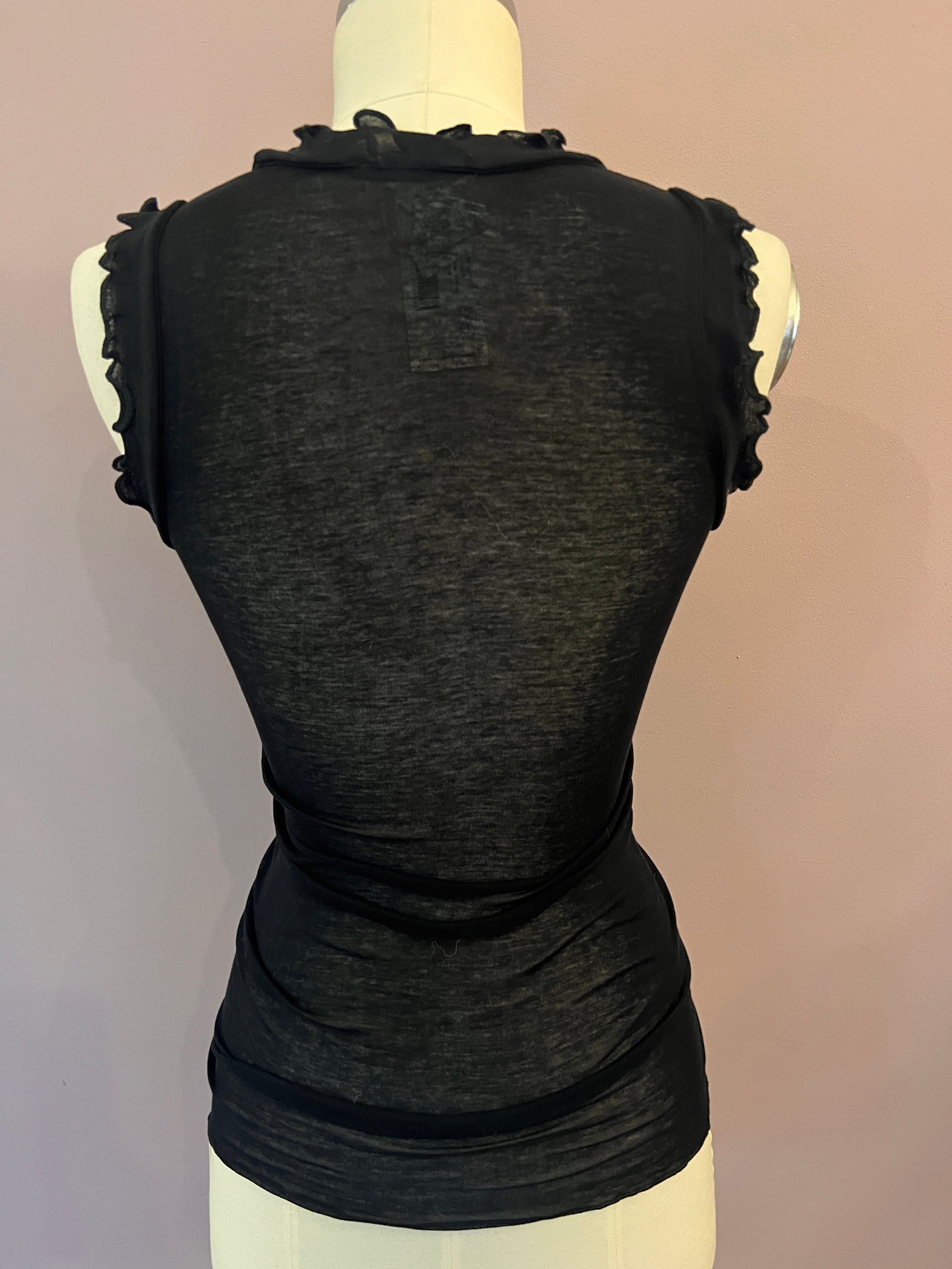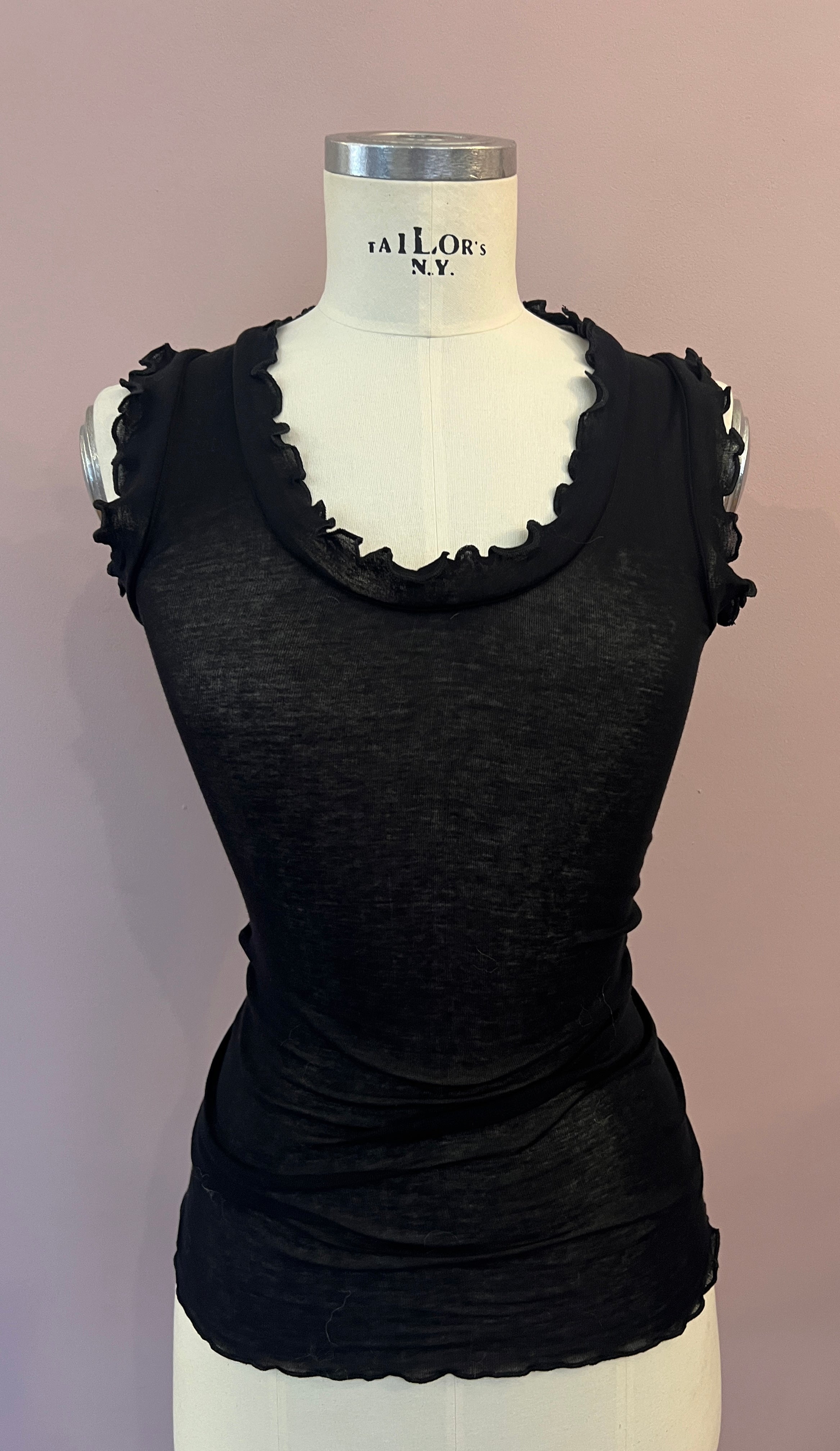 Wunderschönes Baumwolltop "Flounce" in Schwarz von Seamless Basic. Das hauchzarte Top hat einen halbtiefem Rundhalsausschnitt, der ebenso wie die Armausschnitte von einem feinen Volant mit Wellenkante umsäumt ist. Das Top hat eine weiche, anschmiegsame und zugleich flexible Passform, ganz ohne Seitennähte.