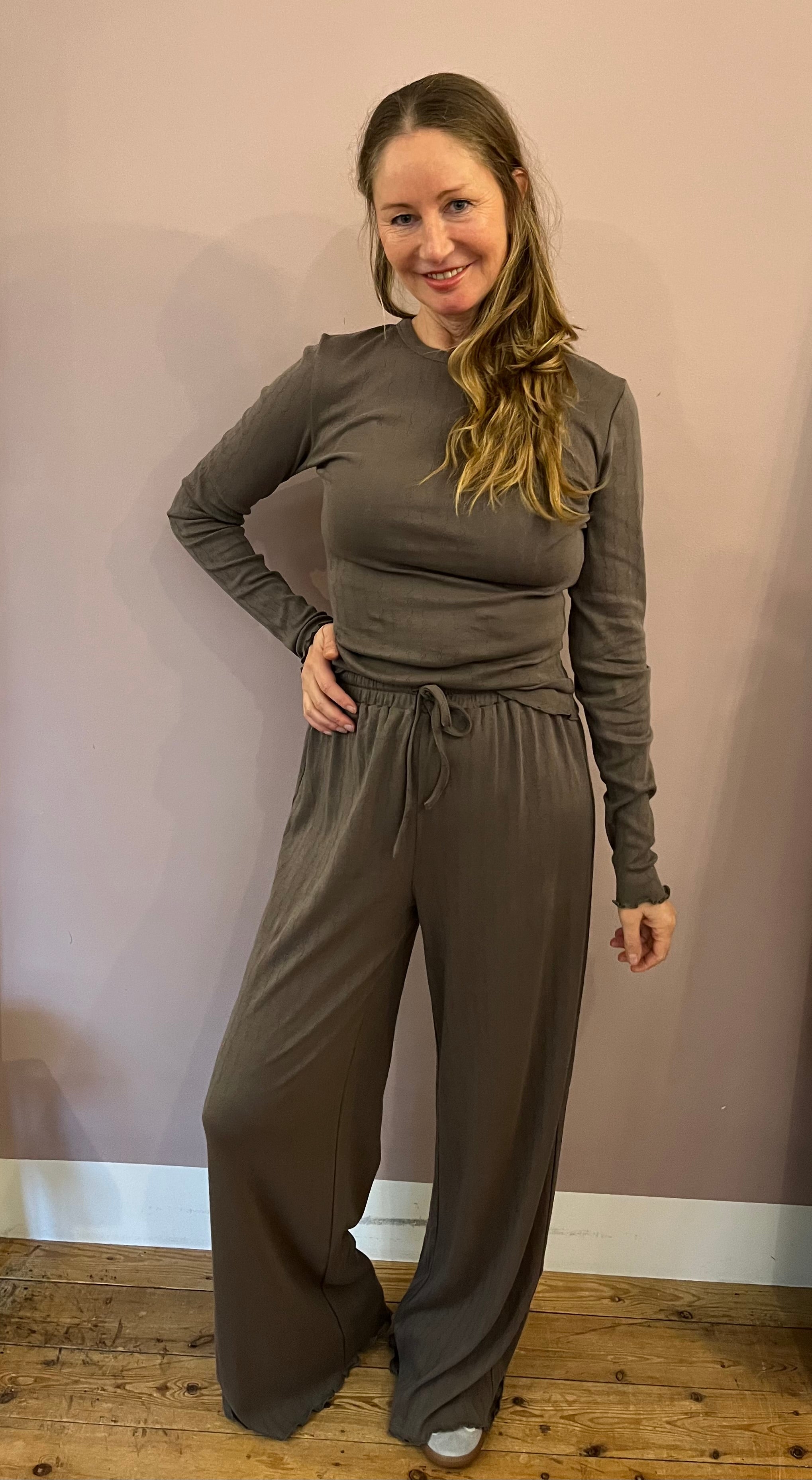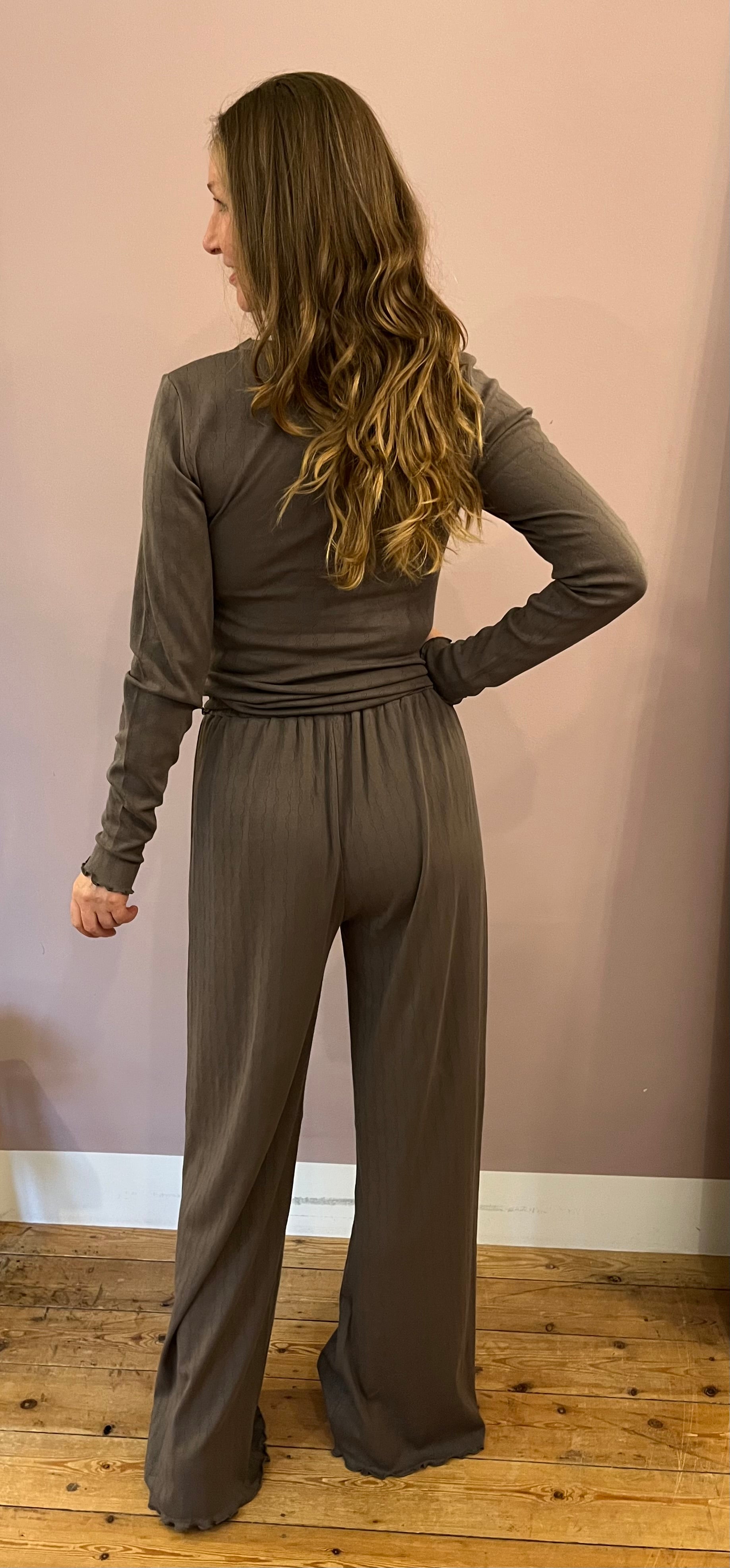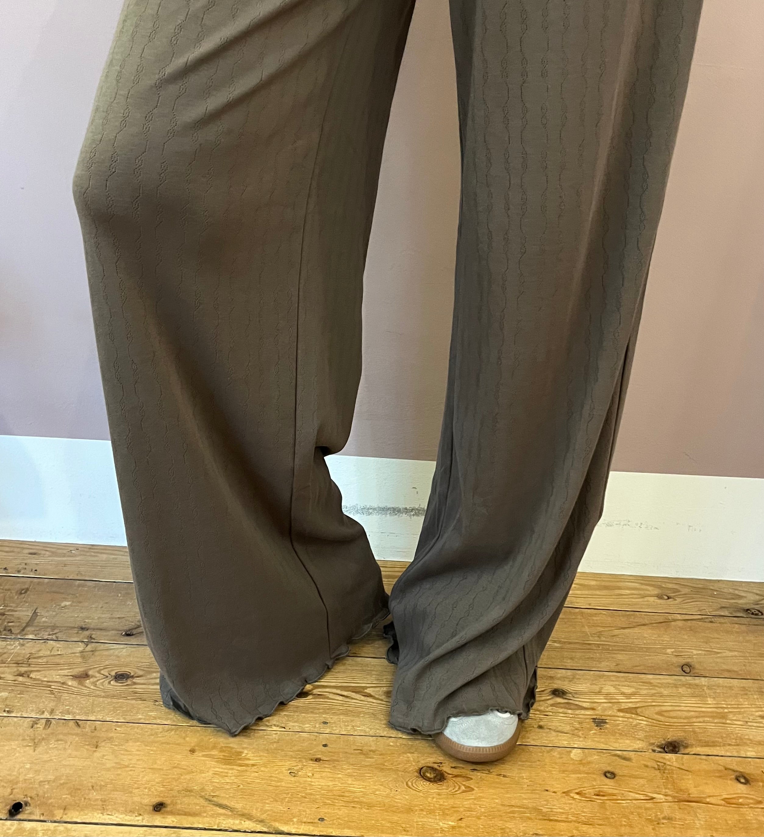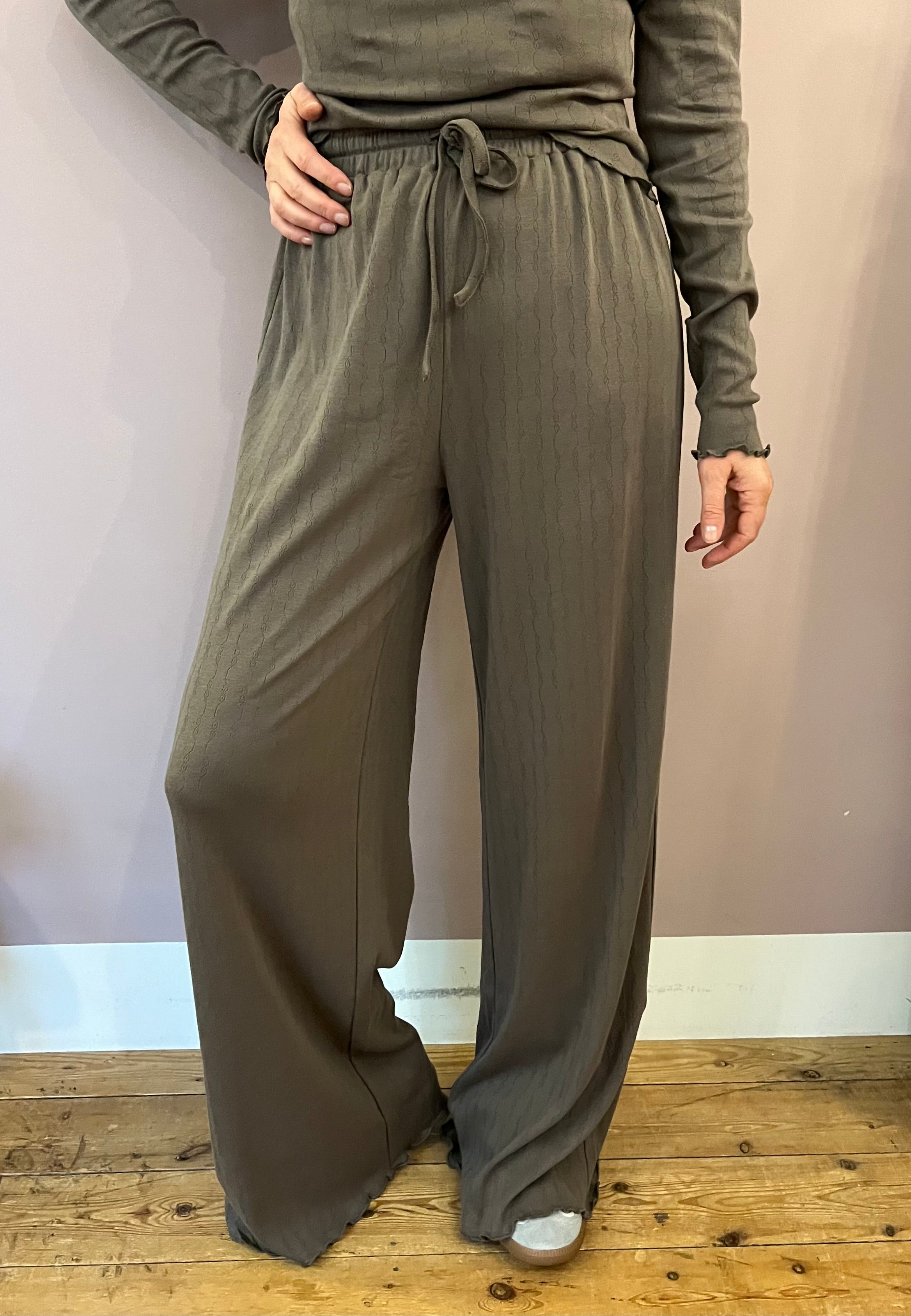 Pointelle-Joggpant im Marlene-Style mit flexiblem Bund in Portobello-Braun von Seamless Basic. Mit Tunnelzug in der Taille und zartem Lochmuster im Rankenoptik für einen femininen Look. Der Saum schließt mit einer feinen Wellenkante ab. Das weiche Baumwoll-Material sorgt für eine flexible, angenehme Passform.