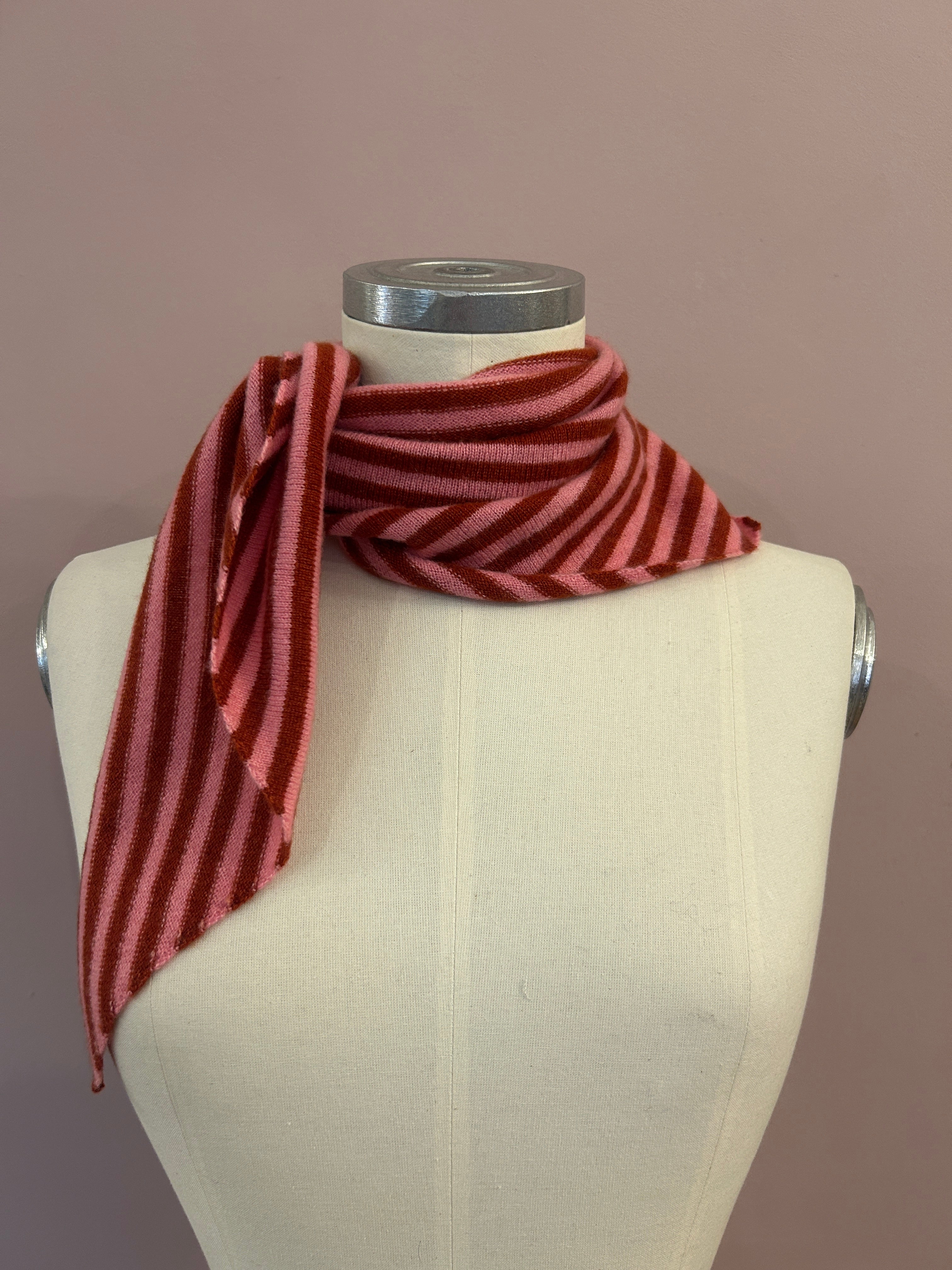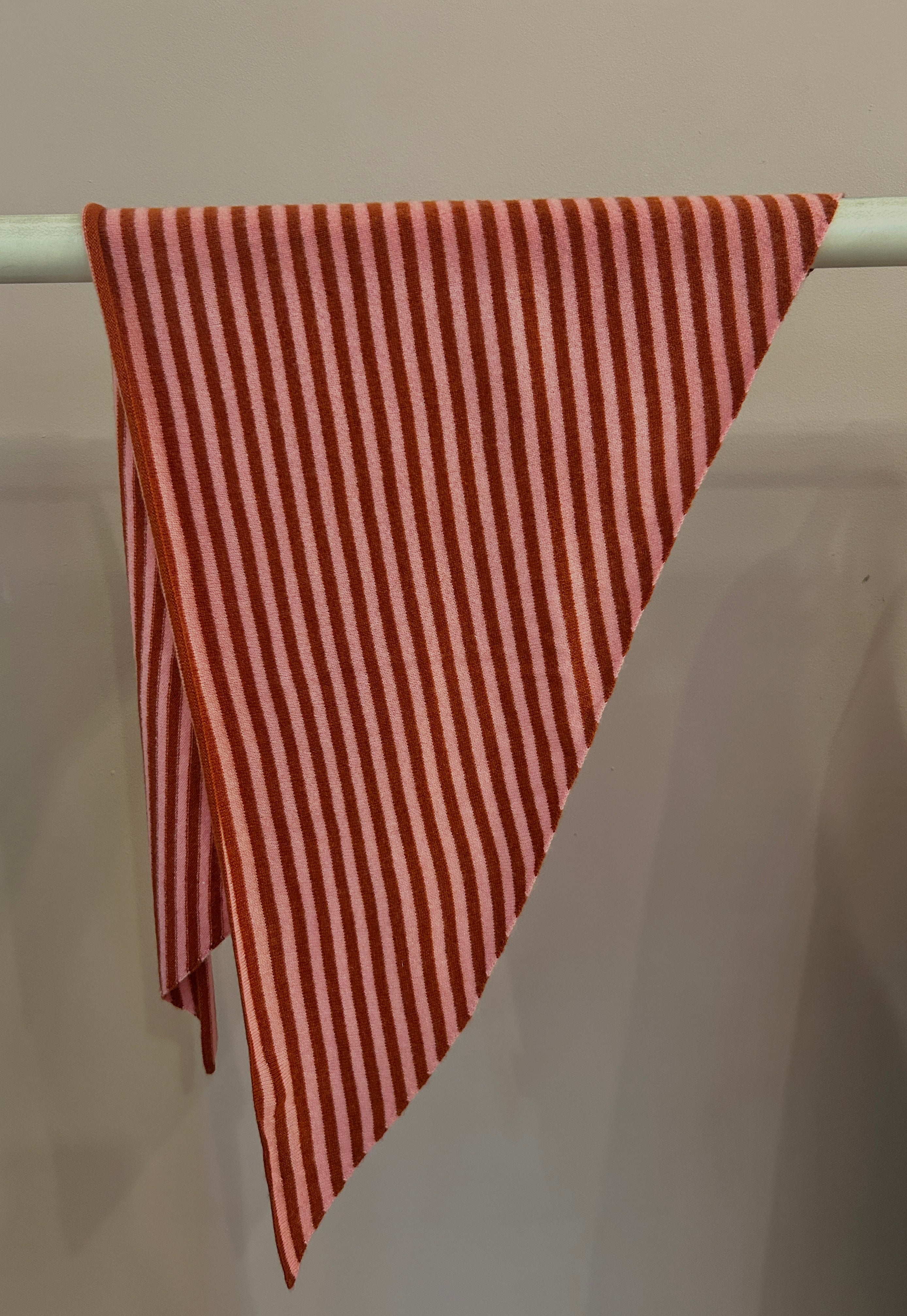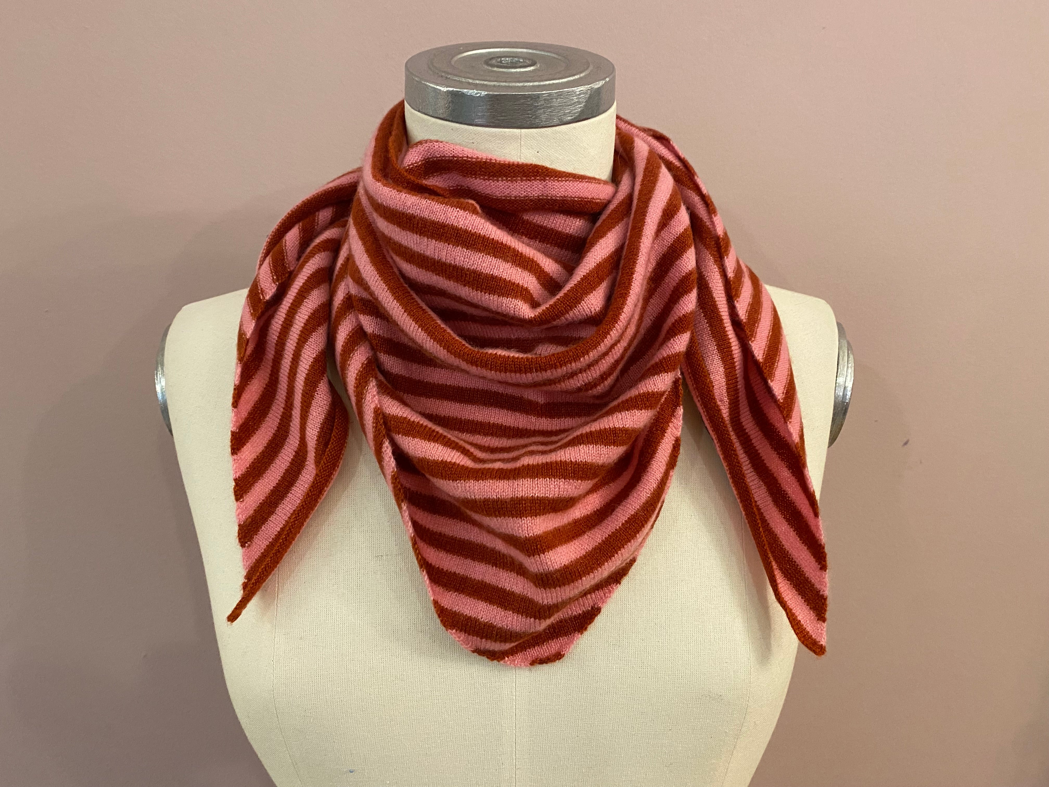 Kleines Dreieckstuch aus Cashmere mit Streifen in Orangerot und Rosé von Mouleta. Ein herrlicher Halswärmer, der in der Garderobe attraktive Kontraste setzt. Der hochwertige Strick aus 100% nepalesischem Cashmere macht den kleinen Dreiecksschal besonders leicht und kuschelig.