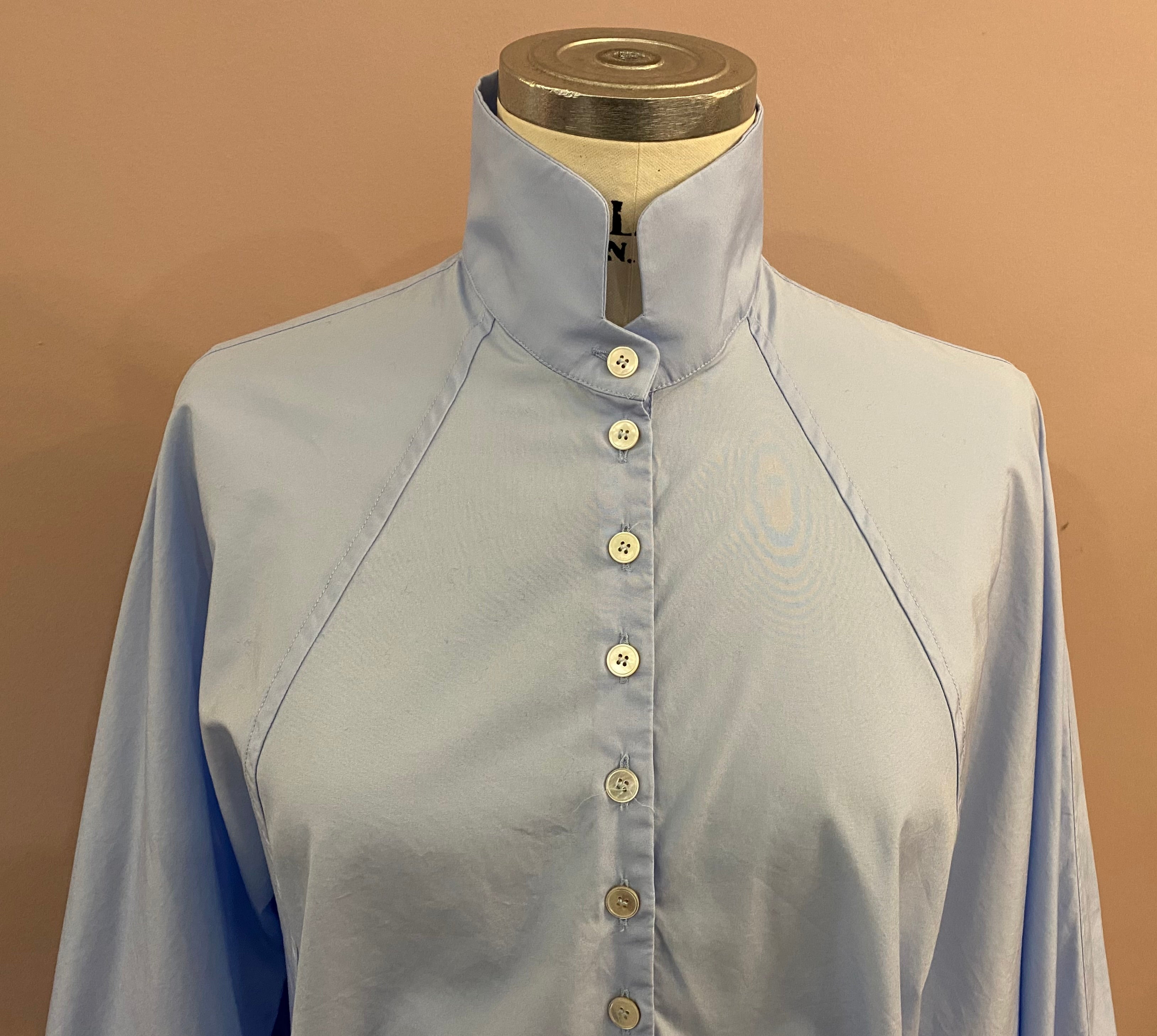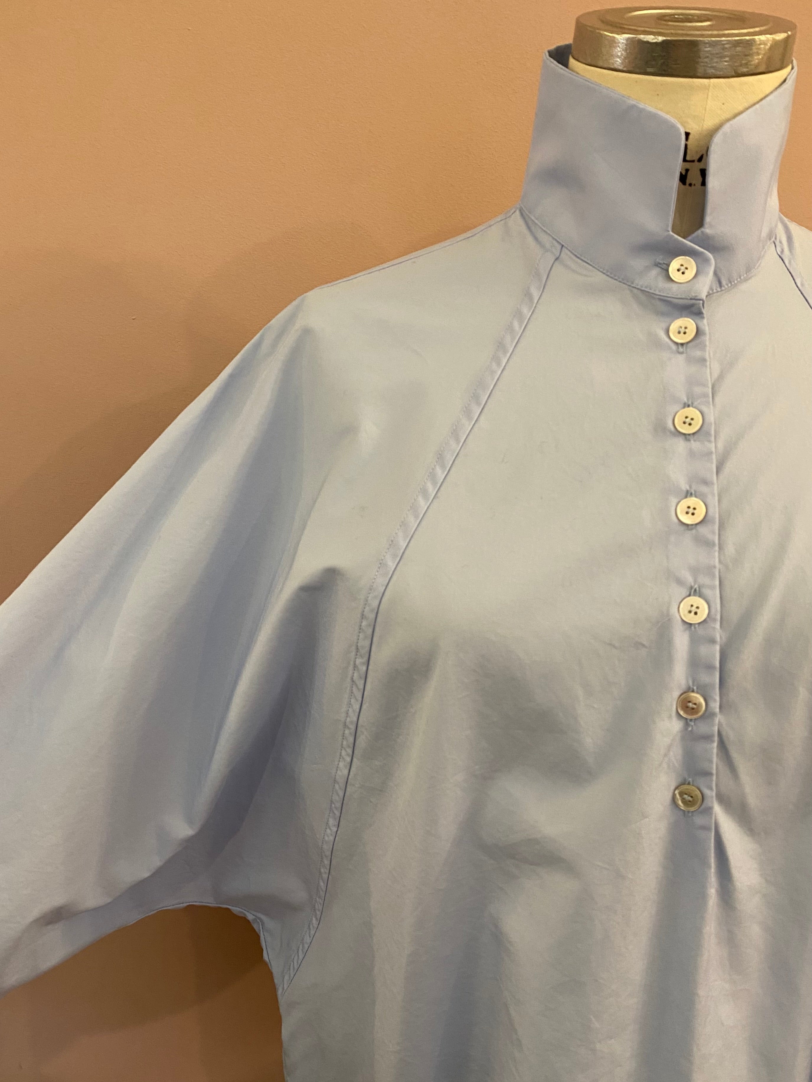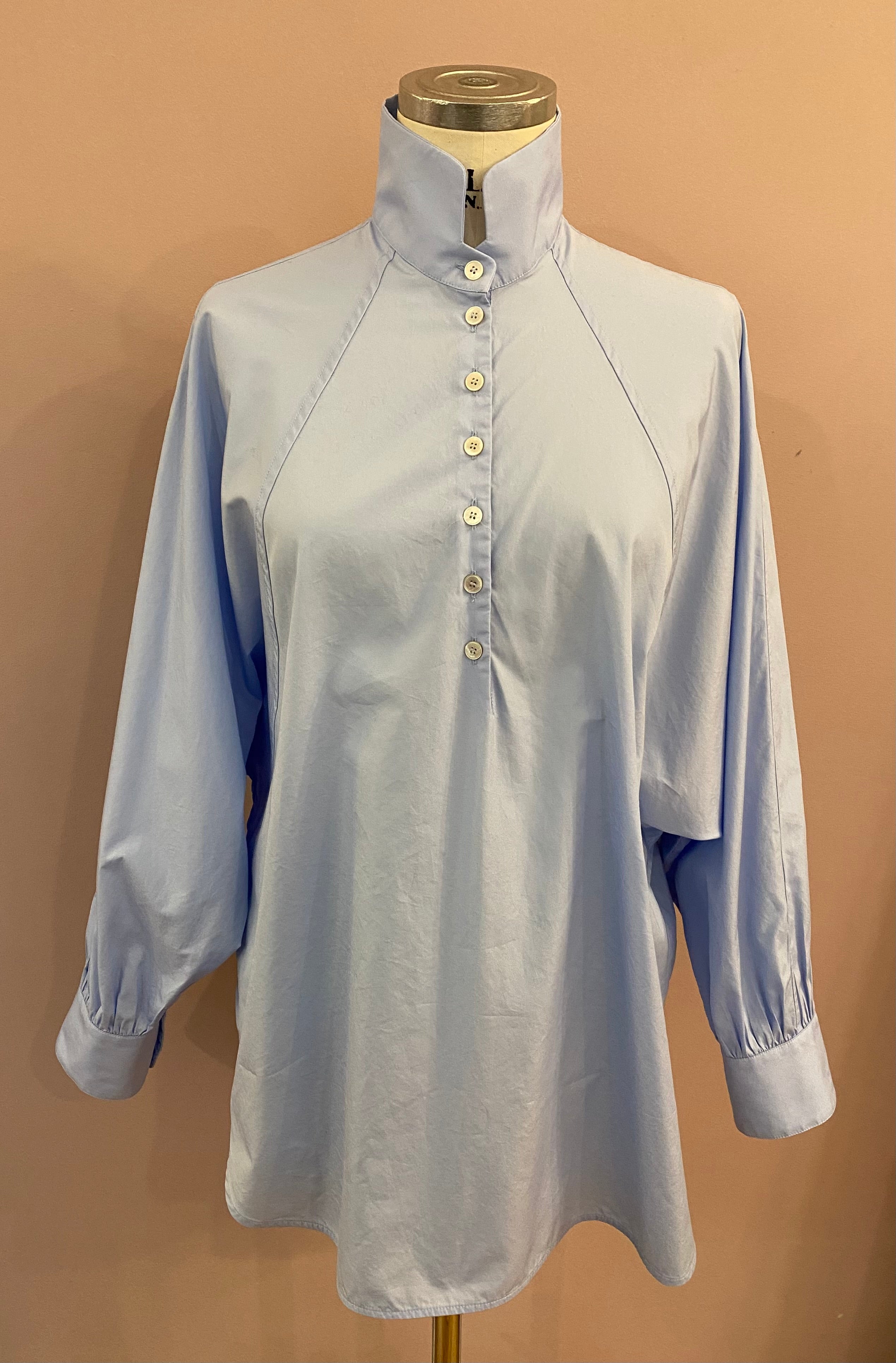 Die feine Bluse hat weite Fledermausärmel, die mit einer Raglannaht eingepasst sind. Ein eleganter Stehkragen mit verkürzter Knopfleiste und breite Manschetten mit Raffungen und vier Schließknöpfen vervollkommnen den lässigen Look. Die Abschlüsse sind gebogt und haben seitliche Cut-outs.