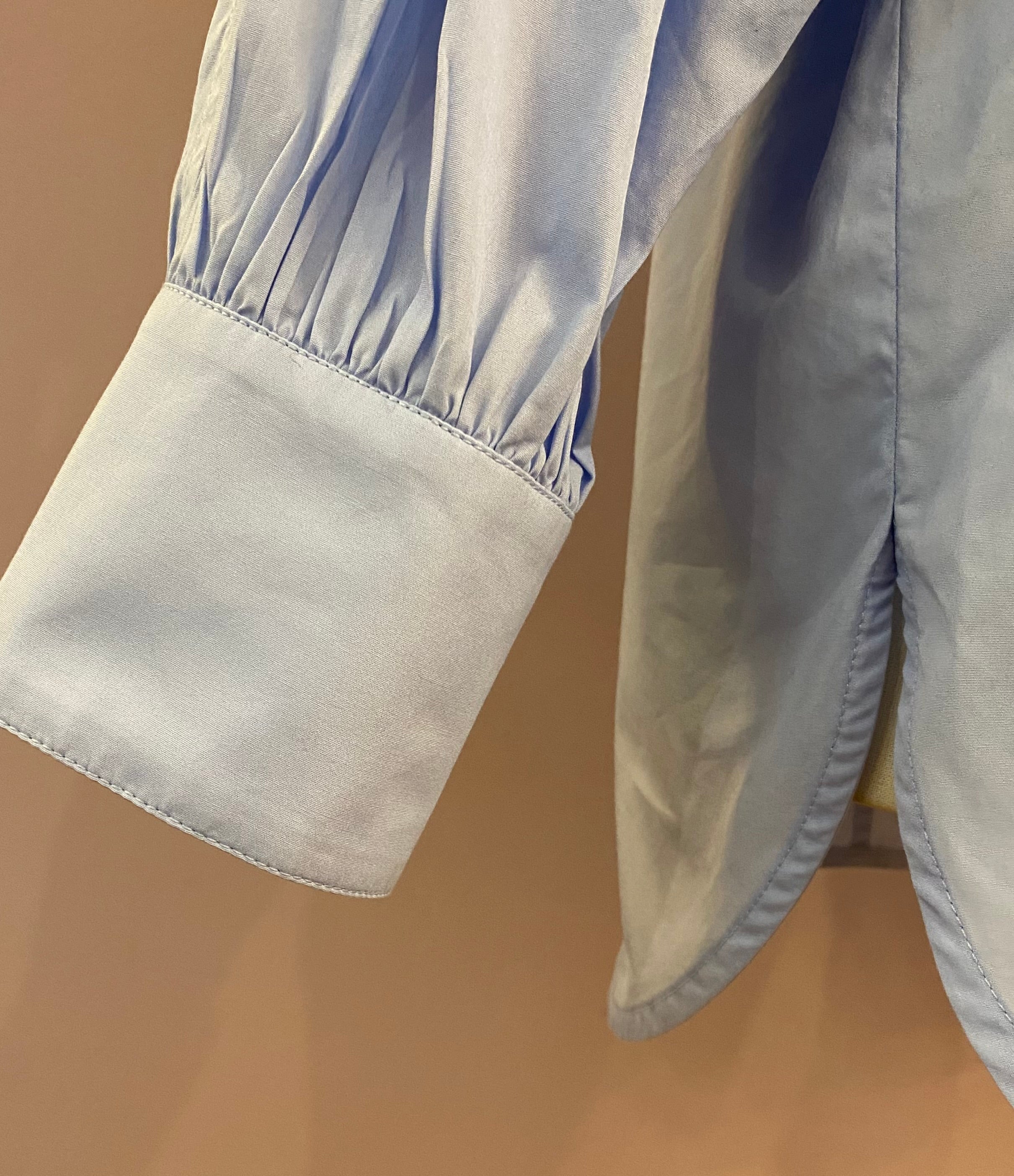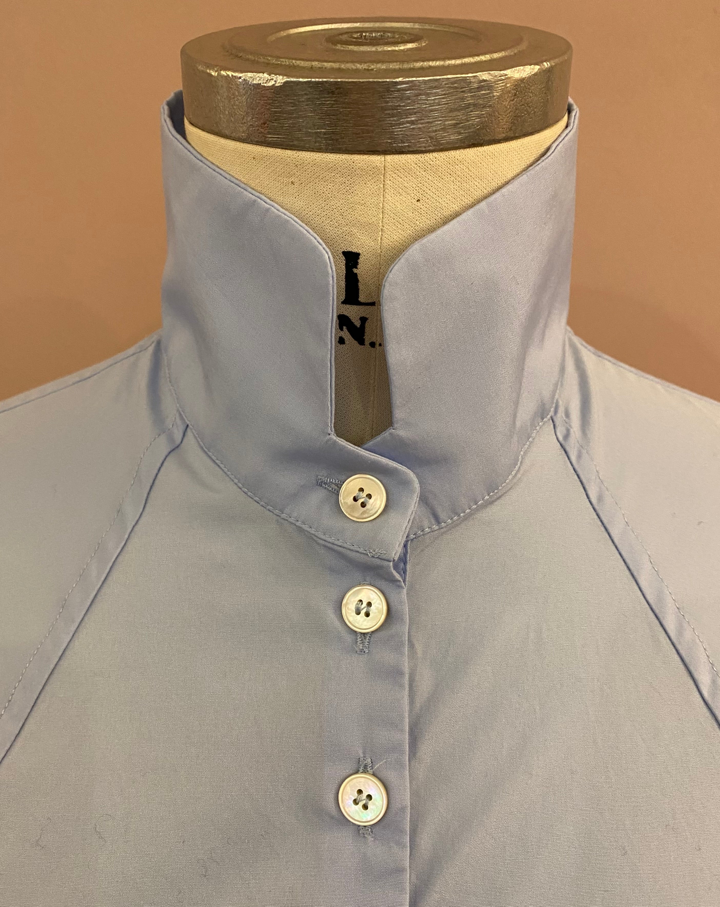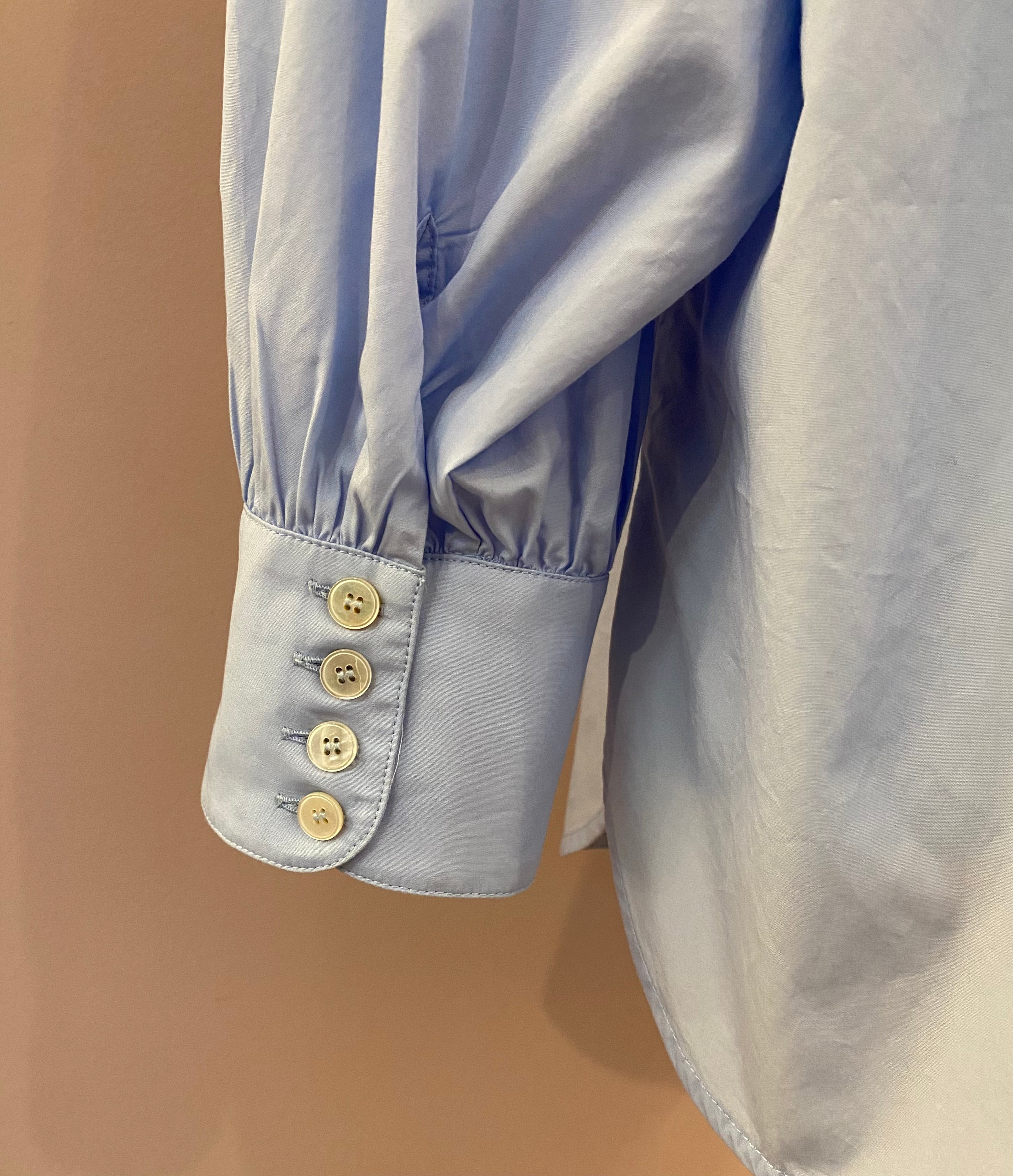 Die feine Bluse hat weite Fledermausärmel, die mit einer Raglannaht eingepasst sind. Ein eleganter Stehkragen mit verkürzter Knopfleiste und breite Manschetten mit Raffungen und vier Schließknöpfen vervollkommnen den lässigen Look. Die Abschlüsse sind gebogt und haben seitliche Cut-outs.