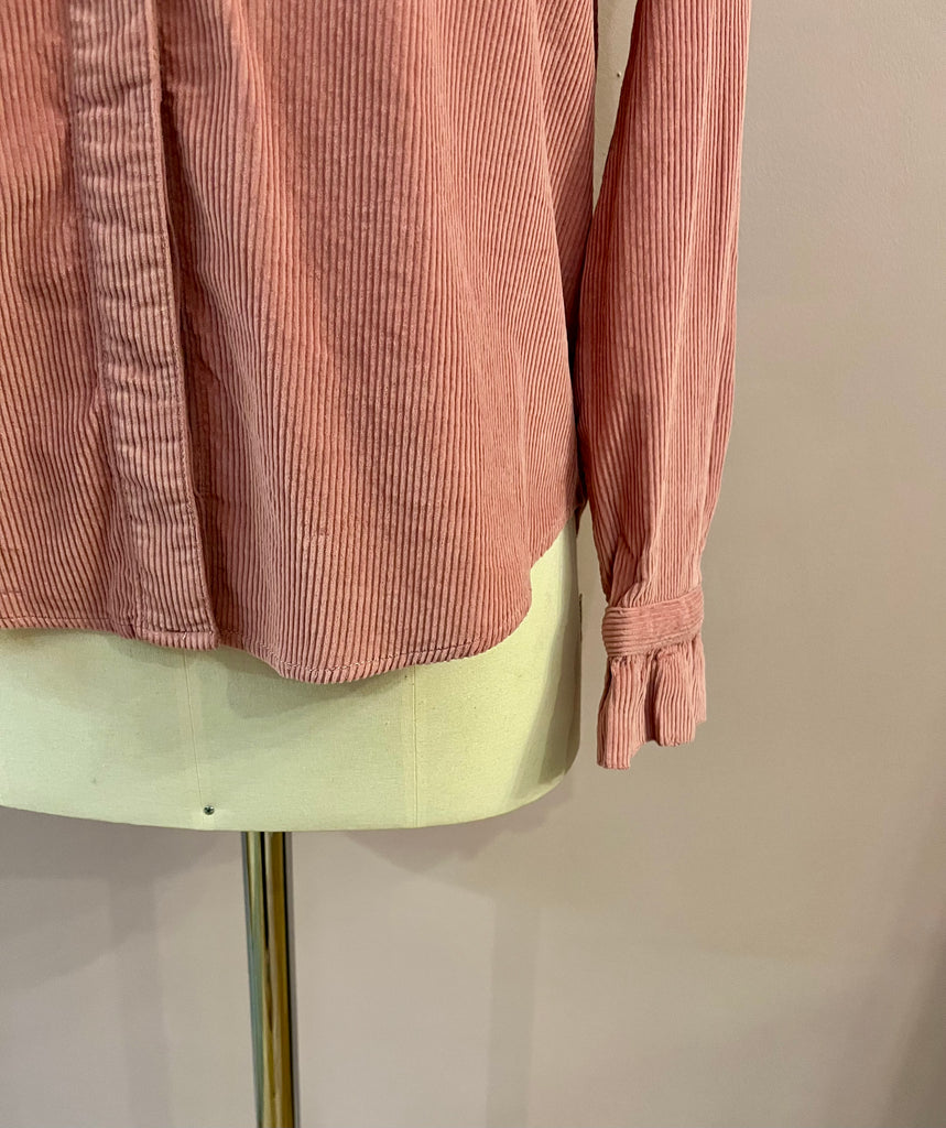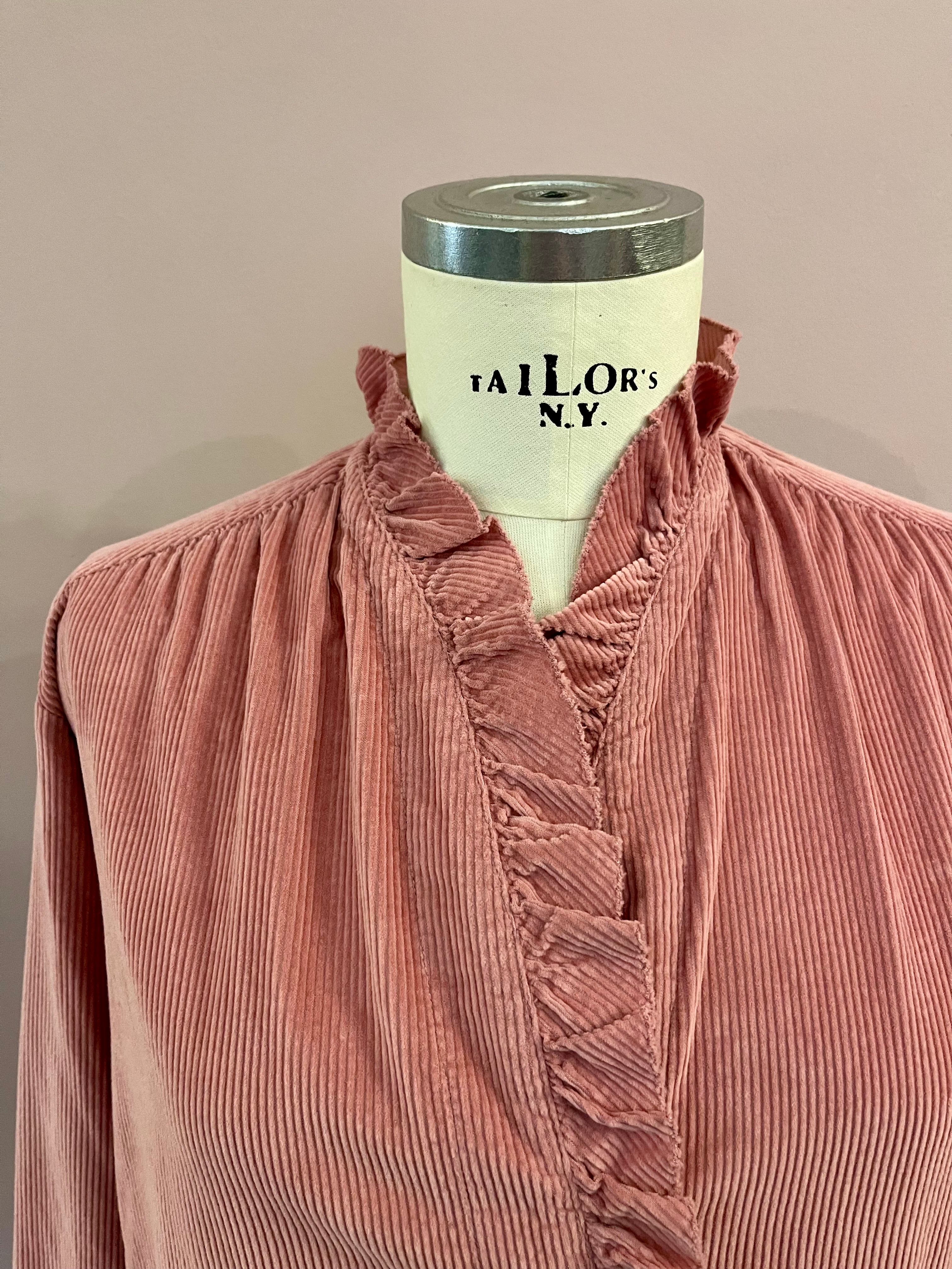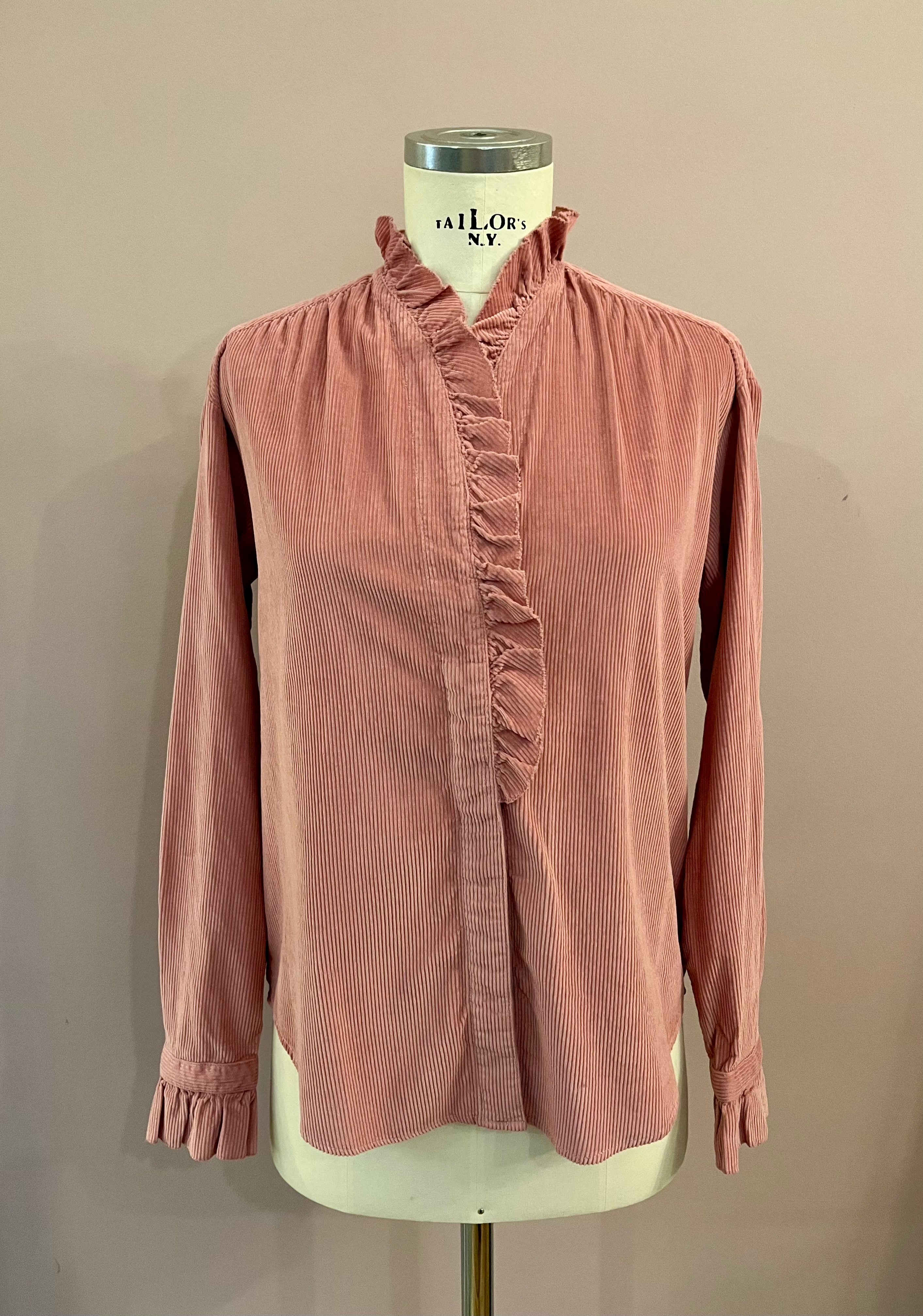 Bluse "Carmela" aus Cord in Old-Pink mit V-Ausschnitt von Hartford. Der aparte Ausschnitt der leichten Cordbluse ist mit einer zarten Rüsche eingefasst, die sich auch an den Armabschlüssen wiederfindet. Unterhalb des Ausschnitts beginnt eine halbe, verdeckte Knopfleiste. Die mittlere Rückenpartie ist unterhalb der Schulterpasse in kleine Fältchen gelegt. Eine angenehm weiche Cordqualität aus reiner Baumwolle sorgt für hohen Tragekomfort. Typisch Hartford.