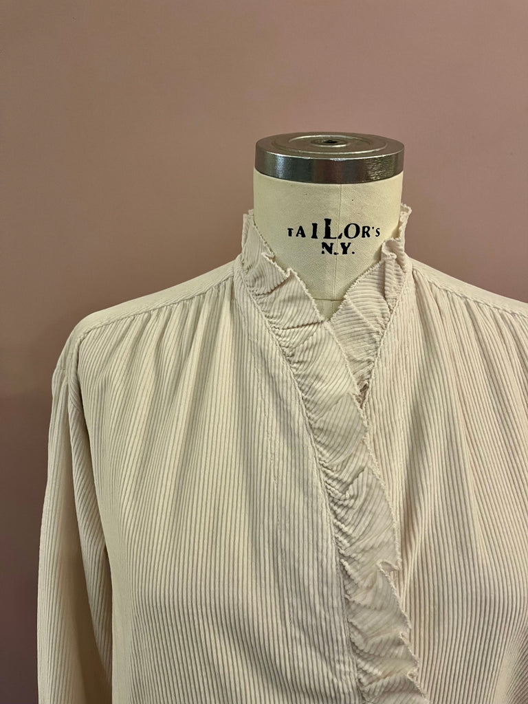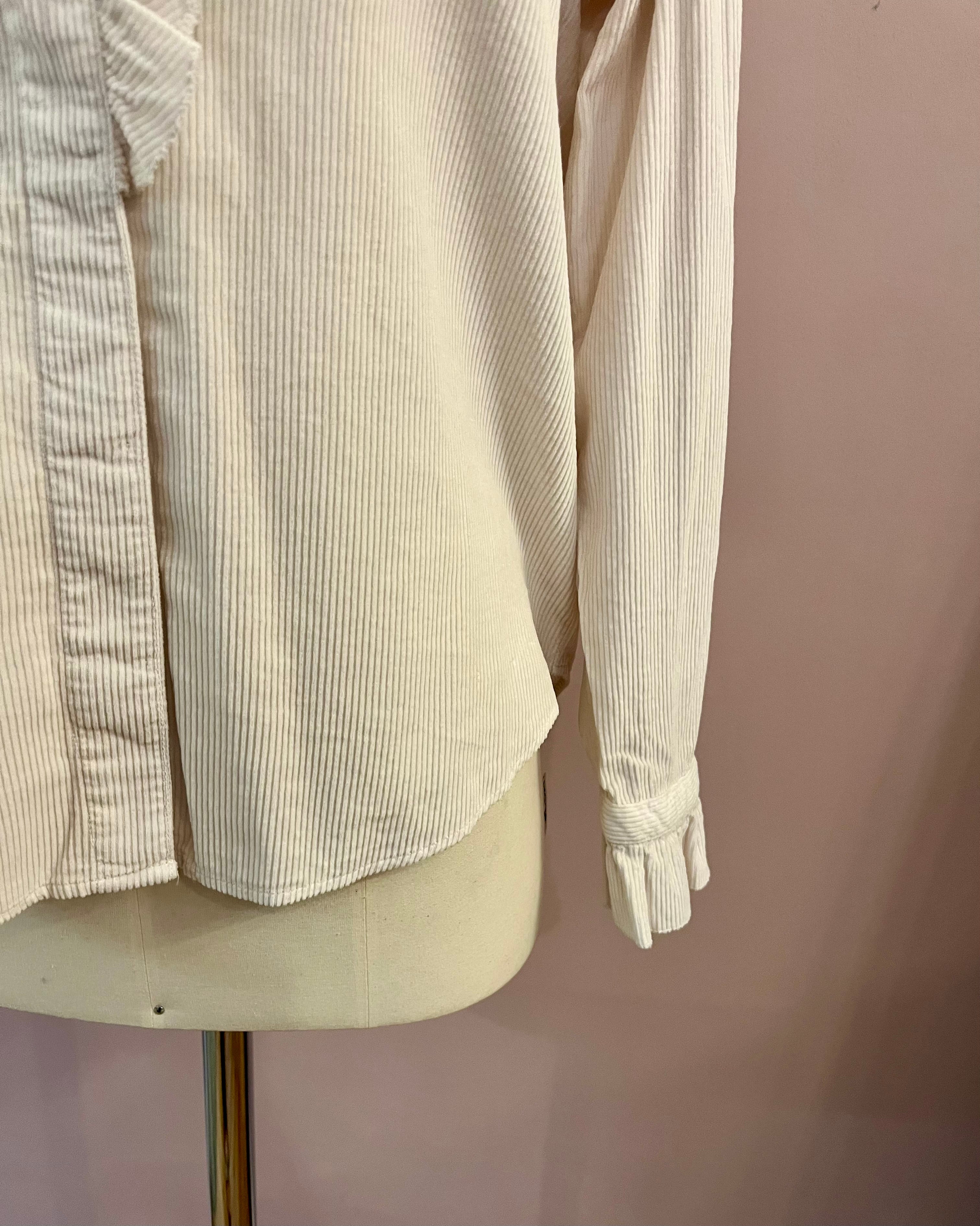 Bluse "Carmela" aus Cord in Elfenbeinweiß mit V-Ausschnitt von Hartford. Der aparte Ausschnitt der leichten Cordbluse ist mit einer zarten Rüsche eingefasst, die sich auch an den Armabschlüssen wiederfindet. Unterhalb des Ausschnitts beginnt eine halbe, verdeckte Knopfleiste. Die mittlere Rückenpartie ist unterhalb der Schulterpasse in kleine Fältchen gelegt. Eine angenehm weiche Cordqualität aus reiner Baumwolle sorgt für hohen Tragekomfort. Typisch Hartford.