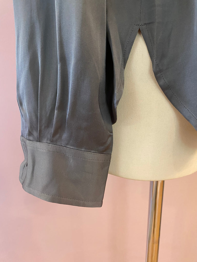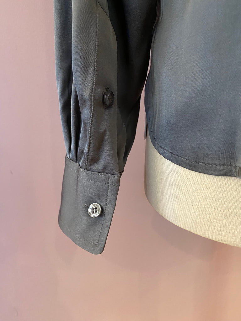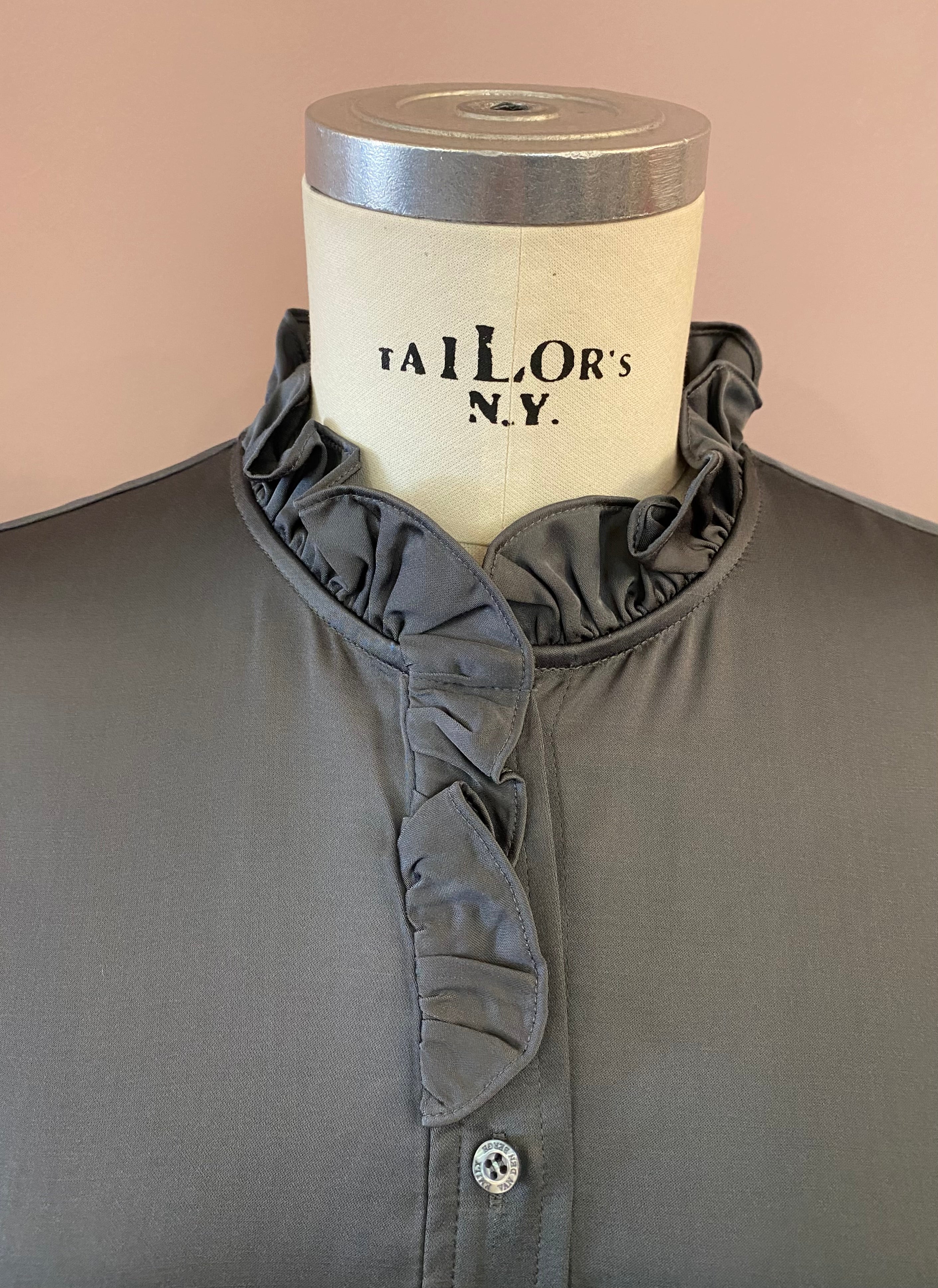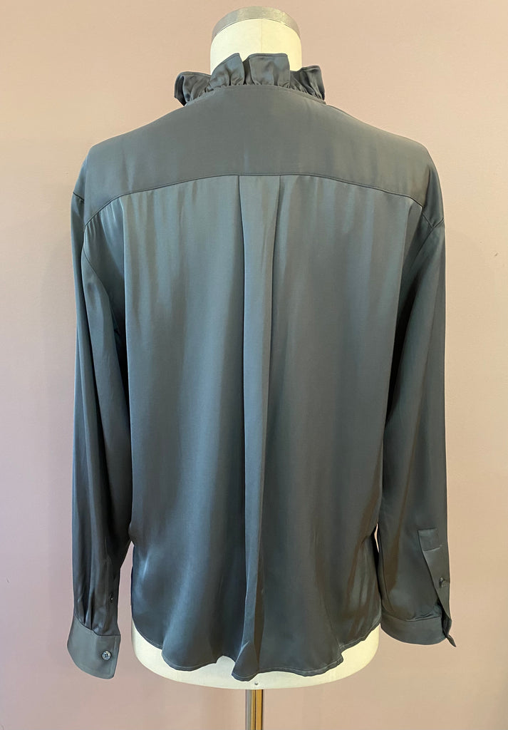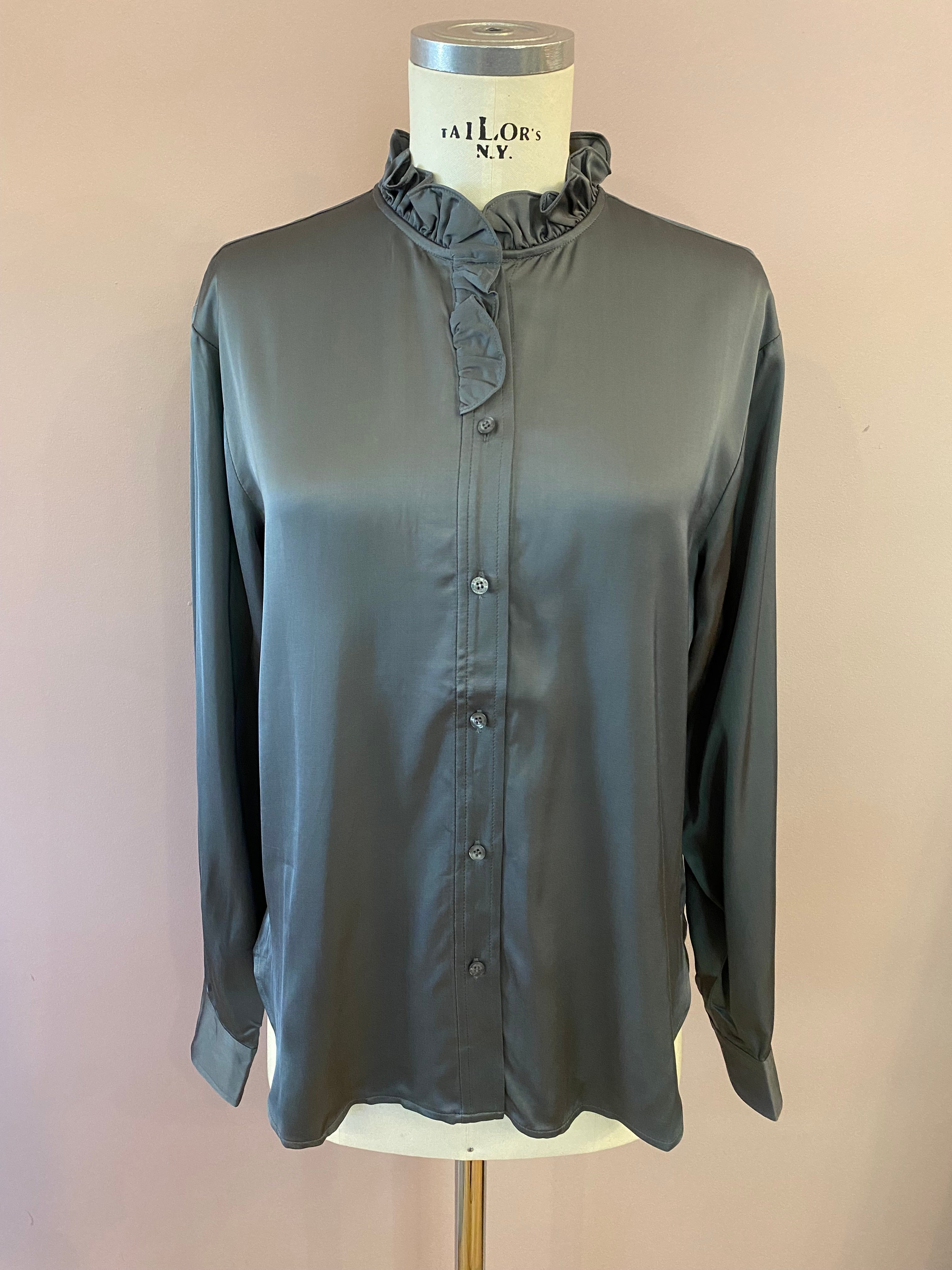 Elegante Bluse mit Rundhals-Ausschnitt aus fließender Viskosesatinware in einem soften Wintergrau (gunmetal). Die feine Rüschenverzierung am Ausschnitt, die sich bis ins Vorderteil zieht, verleiht der Bluse eine elegante, feminie Leichtigkeit.