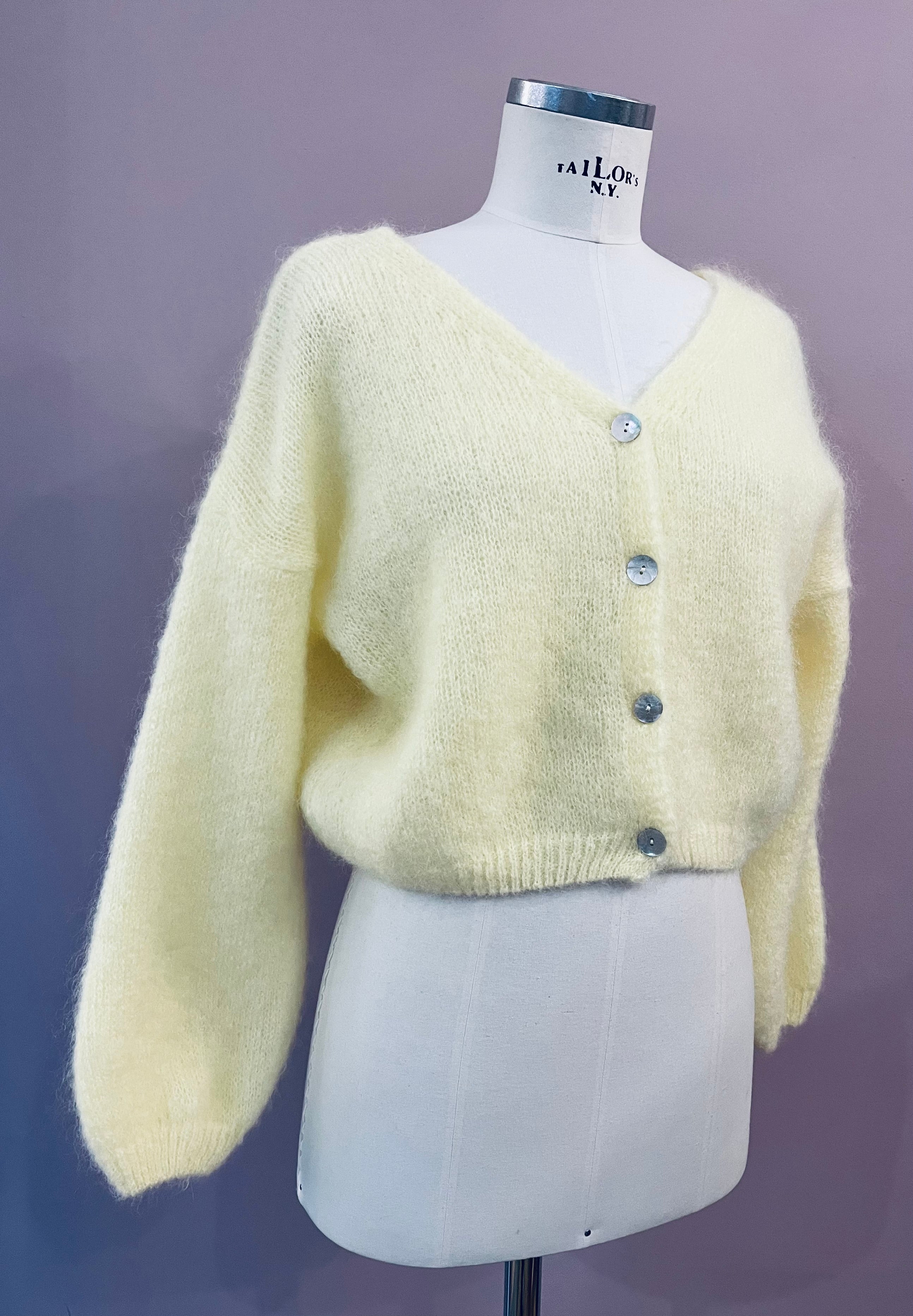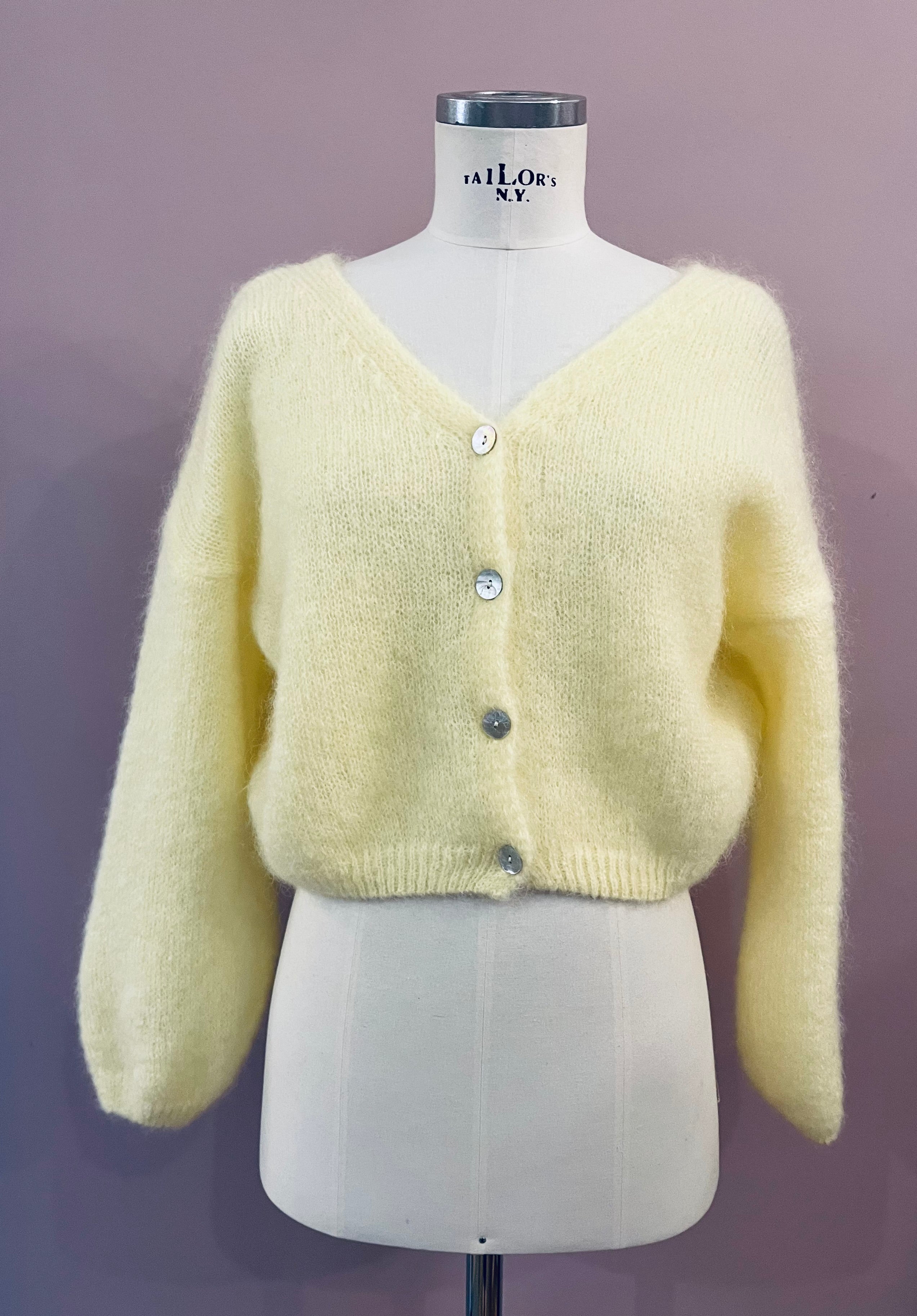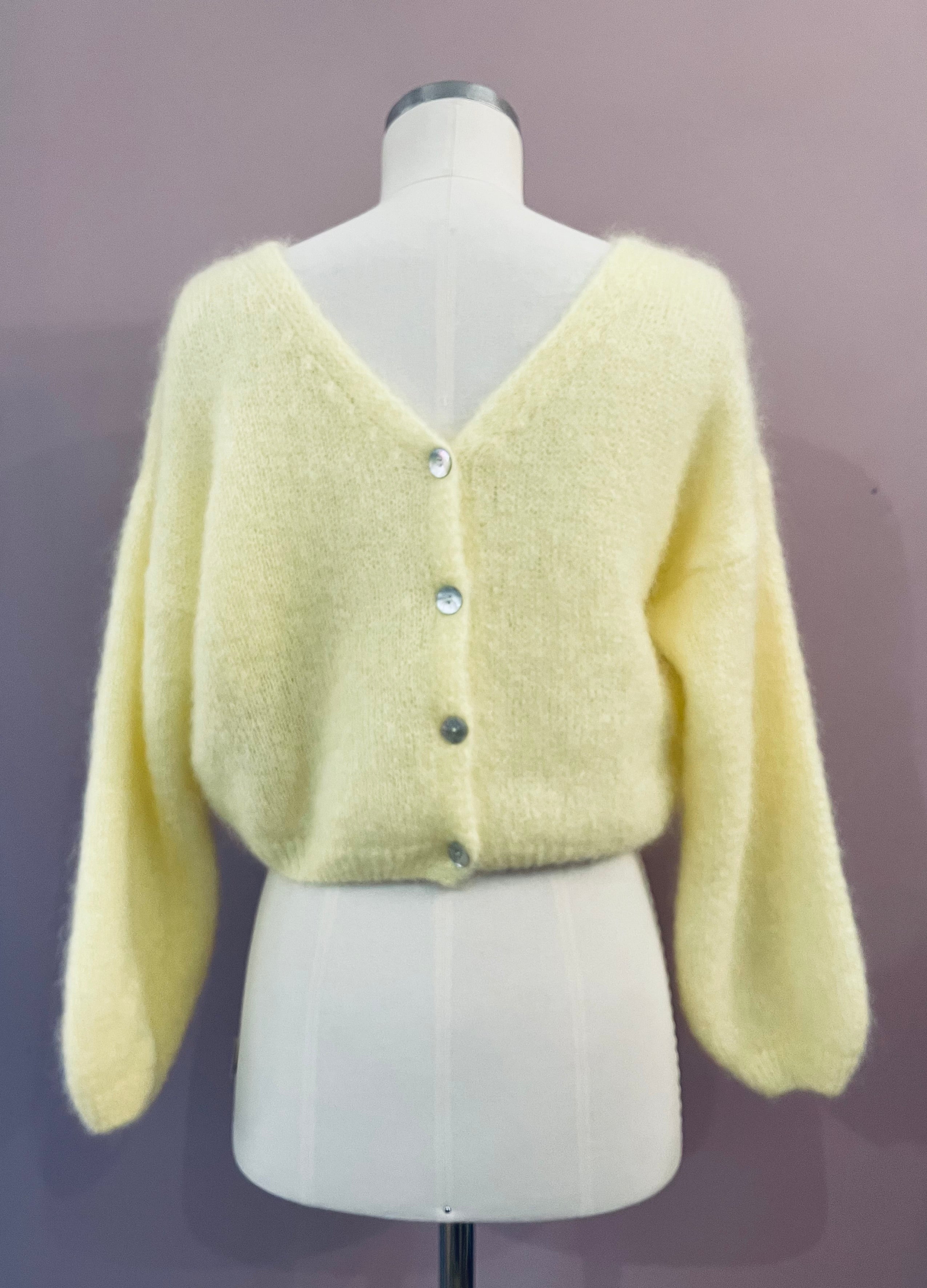 Leichter Strick-Cardigan aus Mohair in Lichtgelb von Americandreams. Der verkürzt geschnittene Cardigan hat einen großen V-Ausschnitt und überschnittene Schultern. Die angesetzten, langen Ärmel sind leger geschnitten und enden mit einem elastischen Rippstrick-Bündchen, wie es auch am unteren Abschluss zu finden ist. Rippstrick-Details am Ausschnitt und vier schillernde Schließknöpfe aus Perlmutt vervollkommnen den femininen Look.