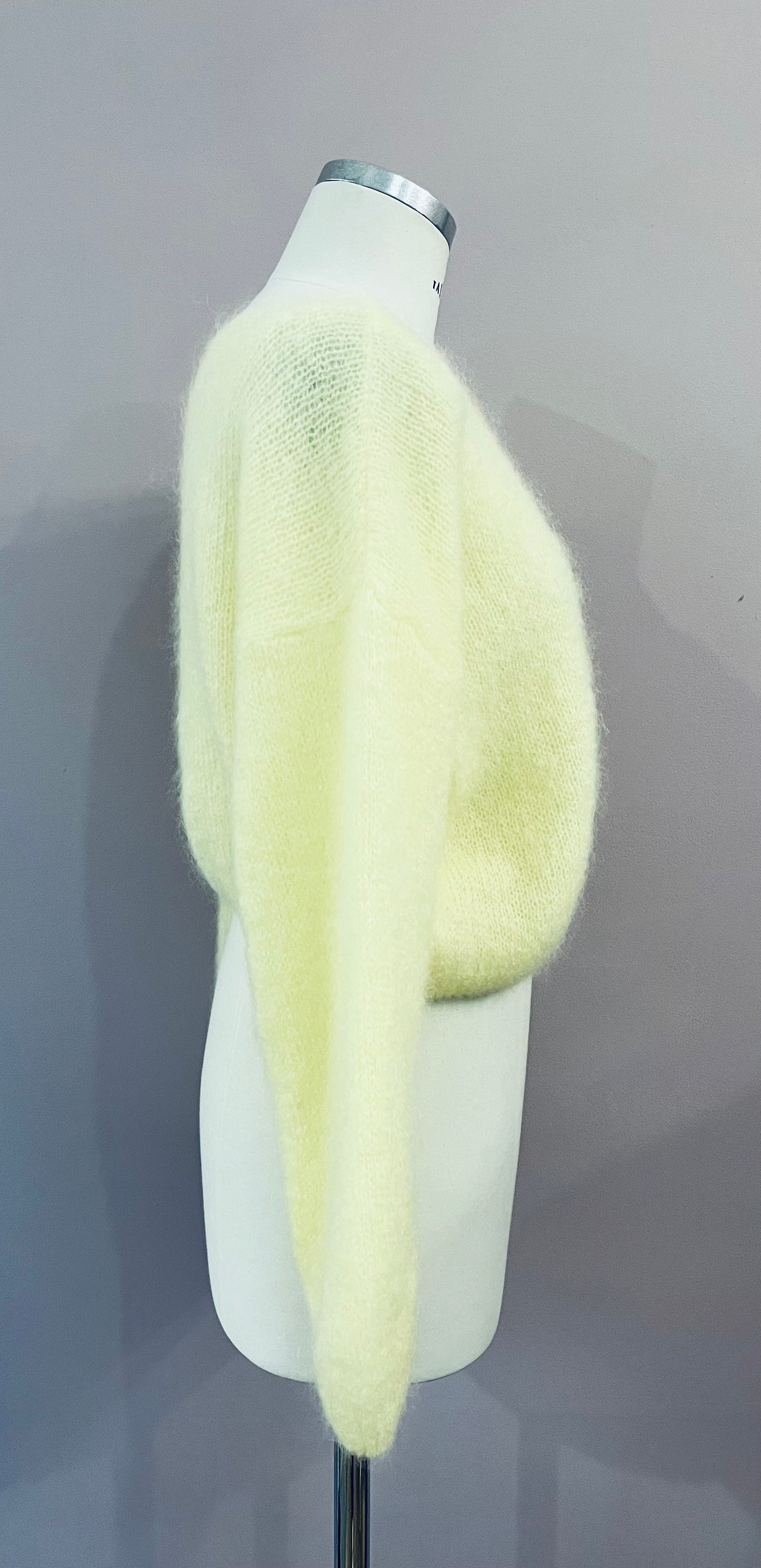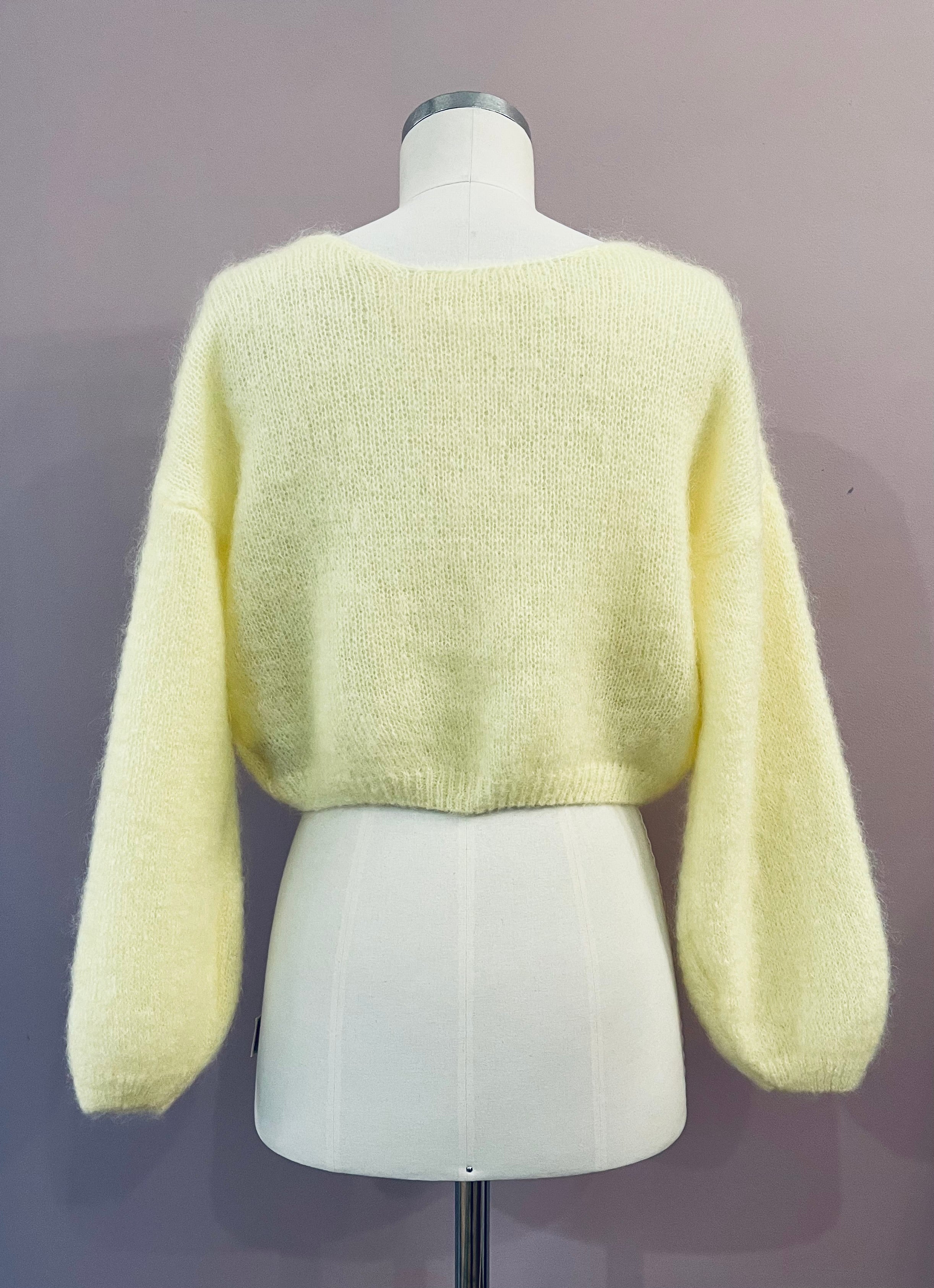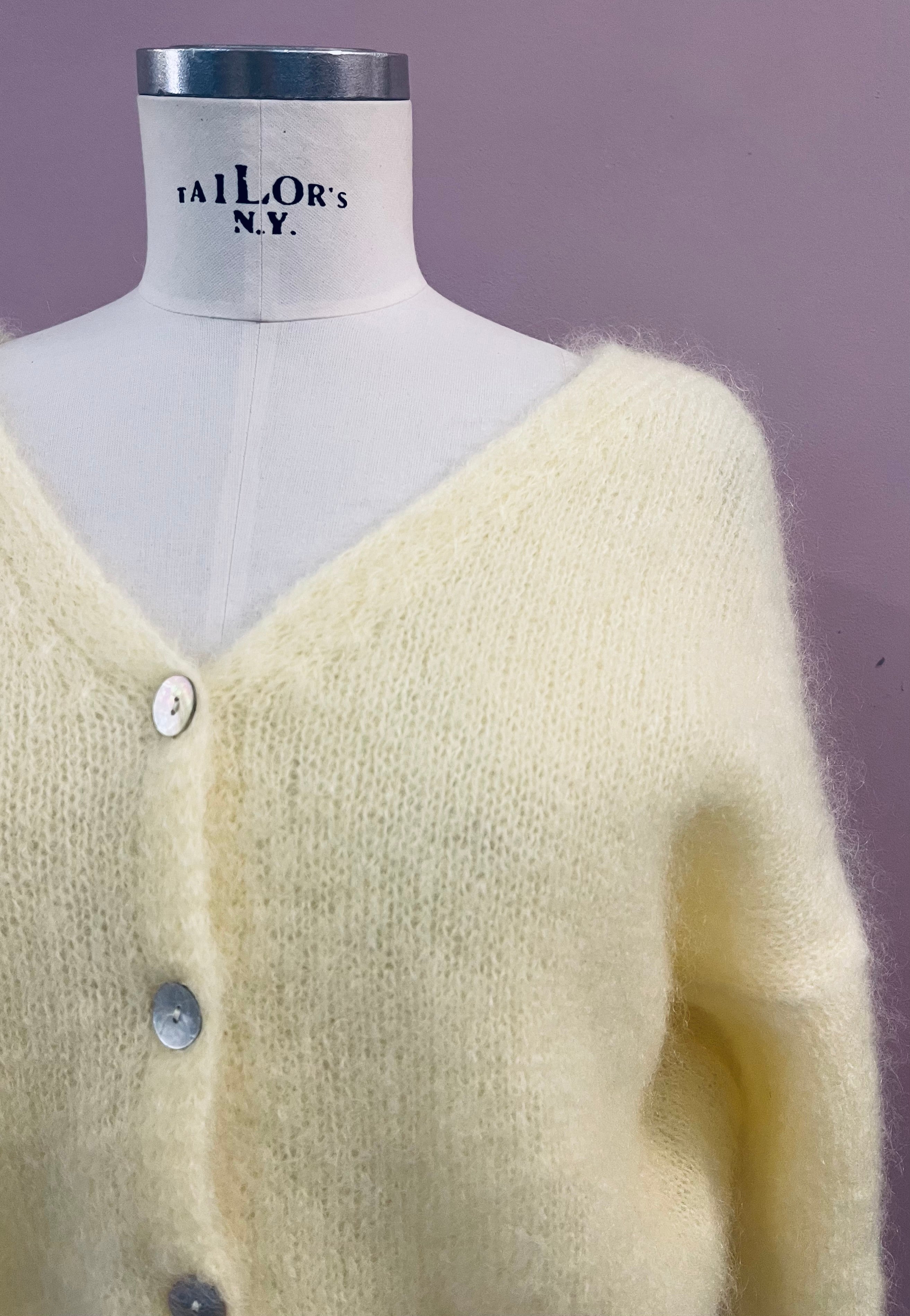 Leichter Strick-Cardigan aus Mohair in Lichtgelb von Americandreams. Der verkürzt geschnittene Cardigan hat einen großen V-Ausschnitt und überschnittene Schultern. Die angesetzten, langen Ärmel sind leger geschnitten und enden mit einem elastischen Rippstrick-Bündchen, wie es auch am unteren Abschluss zu finden ist. Rippstrick-Details am Ausschnitt und vier schillernde Schließknöpfe aus Perlmutt vervollkommnen den femininen Look.