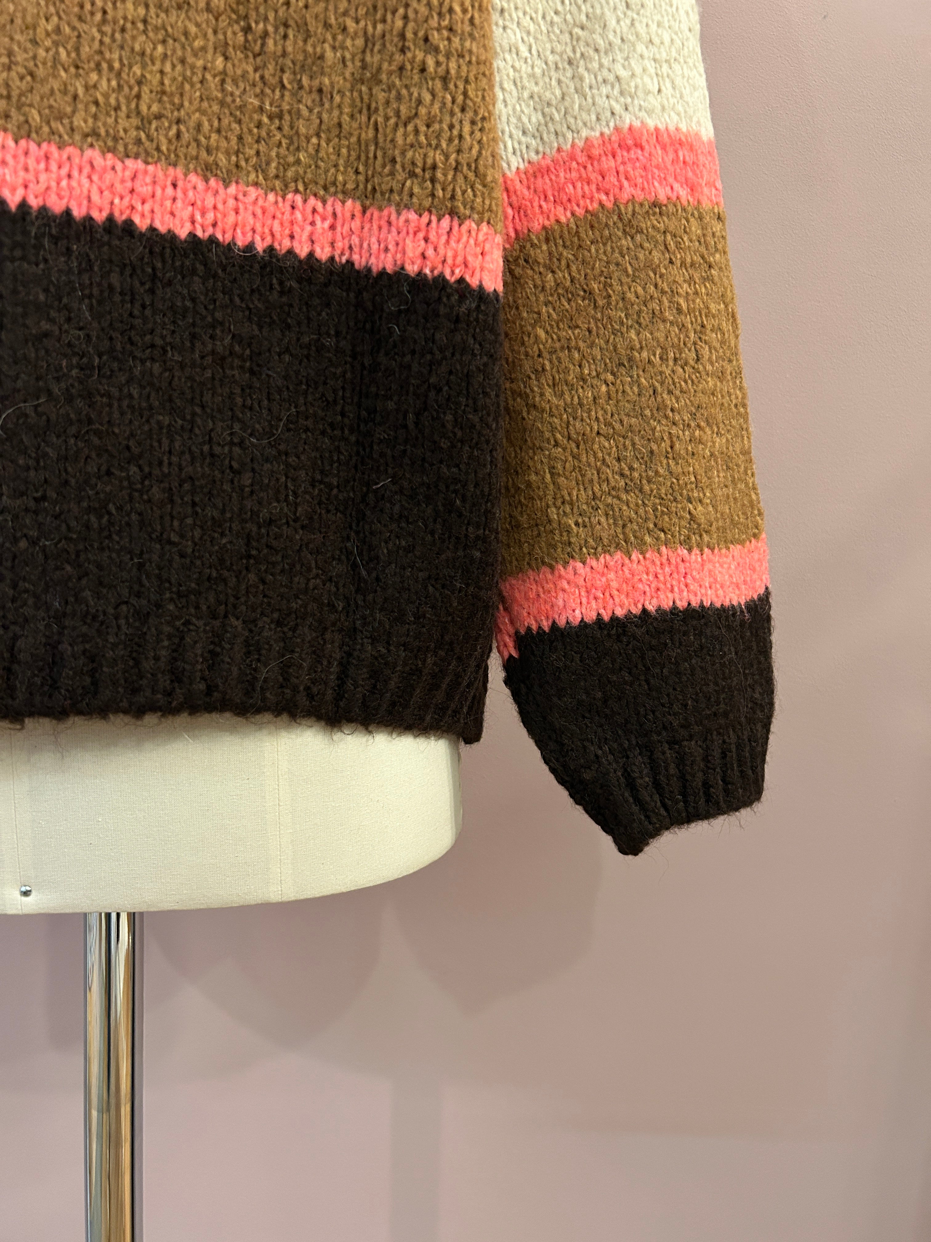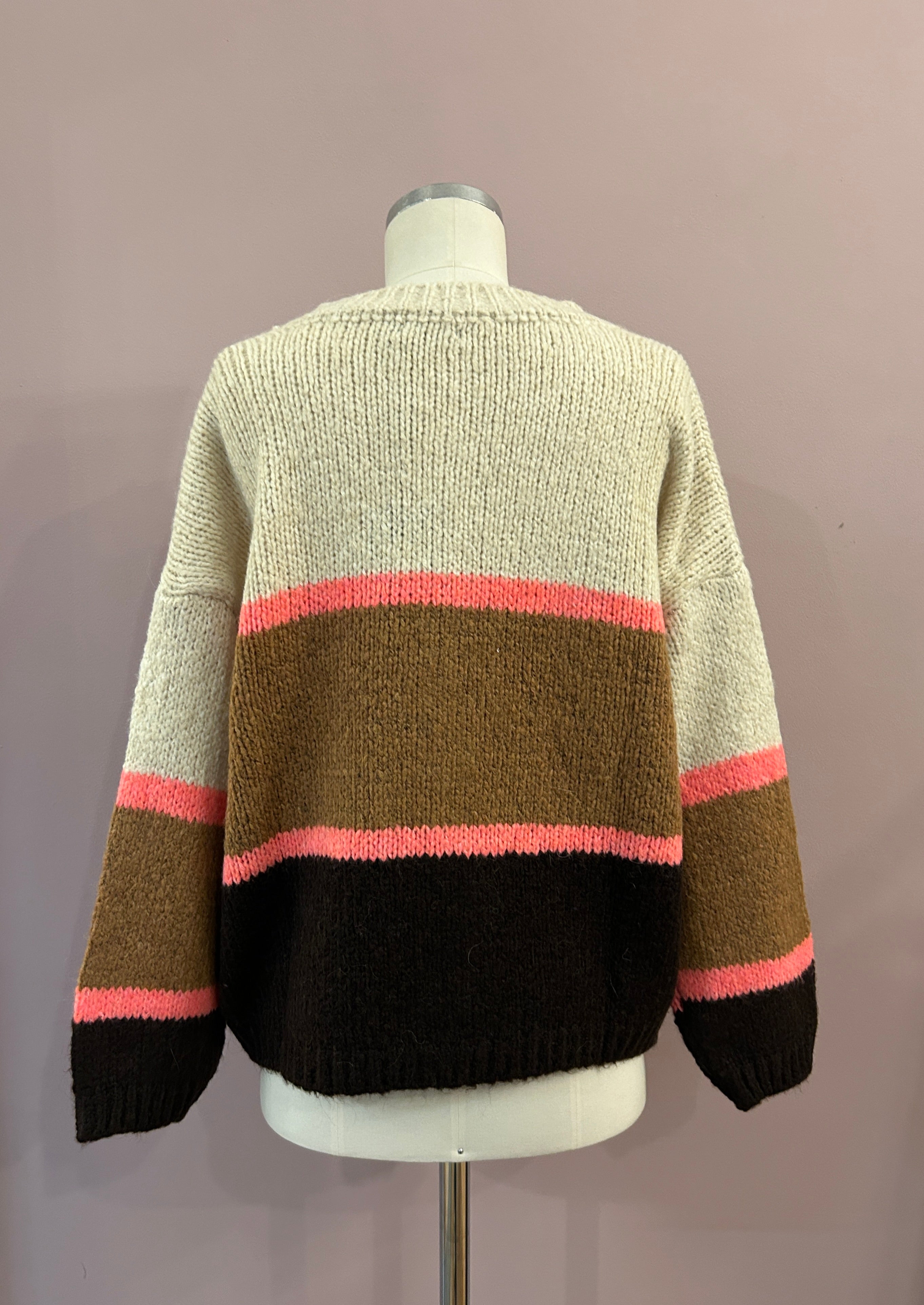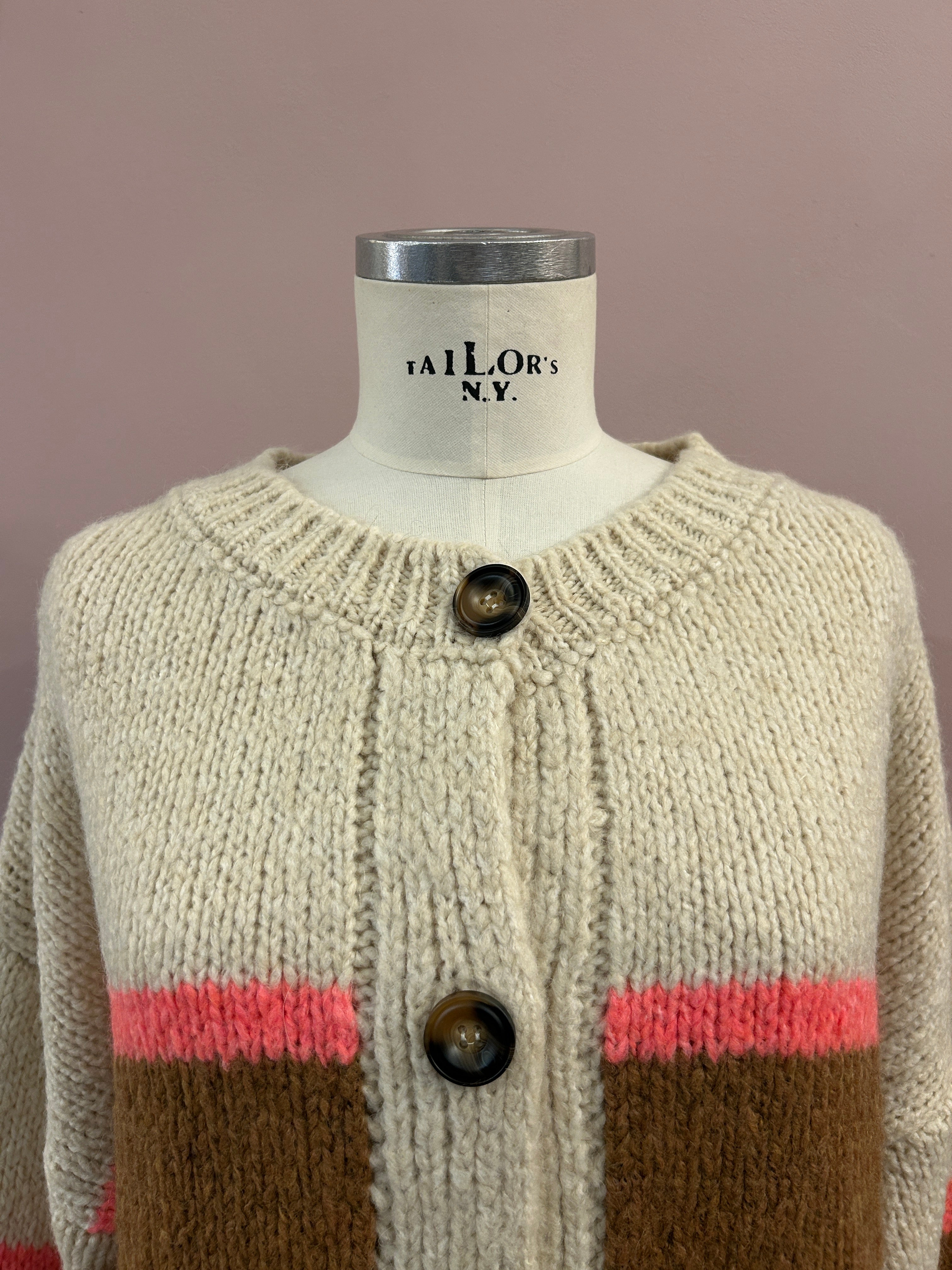 Dieser Chunky Knit Cardigan besticht durch seinen modernen Colour-Block-Look. Die harmonische Farbkombination aus Creme, warmem Camelton, tiefem Braun und leuchtenden Korallstreifen verleiht dem Design eine besondere Dynamik und setzt stilvolle Akzente.