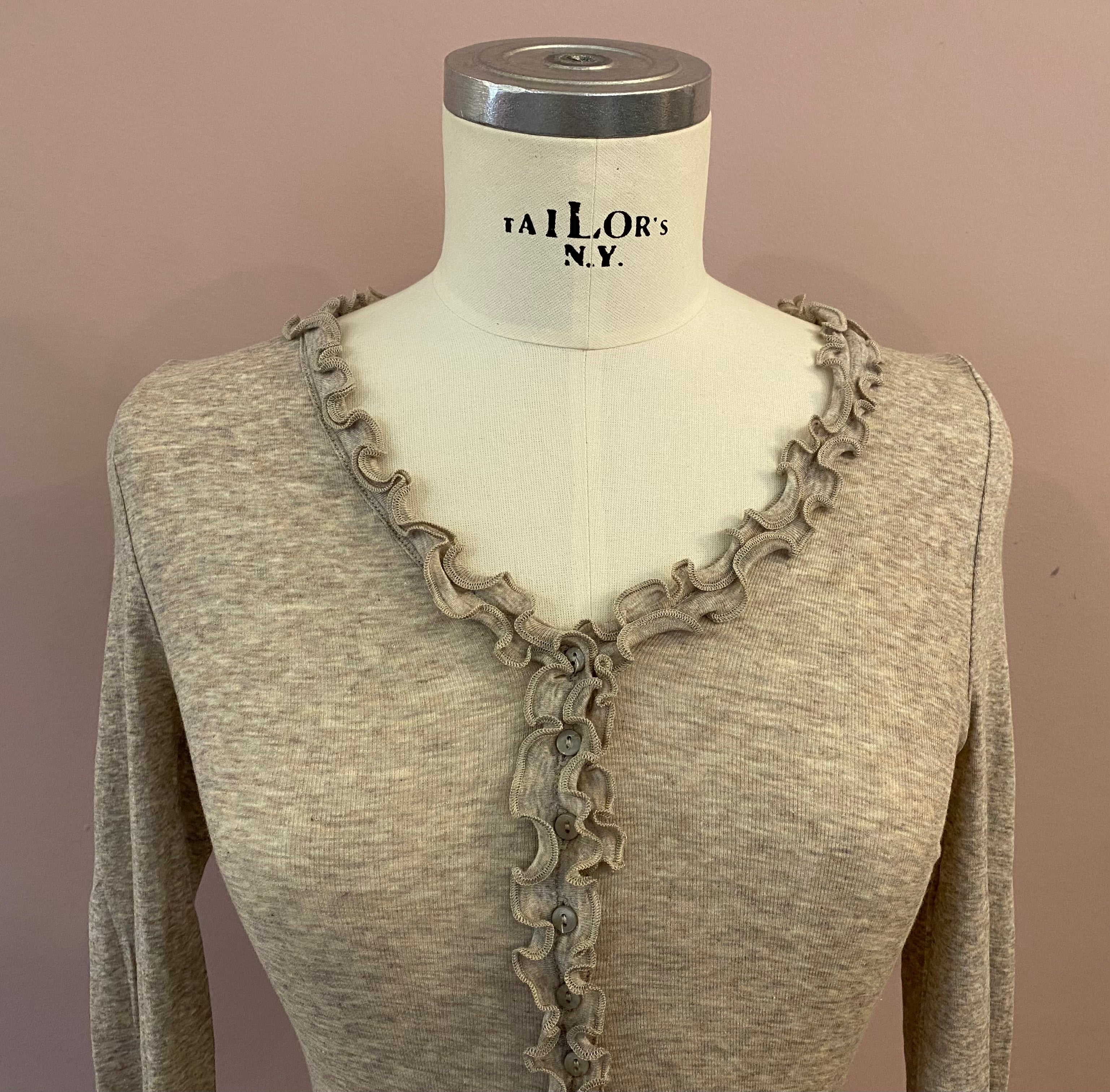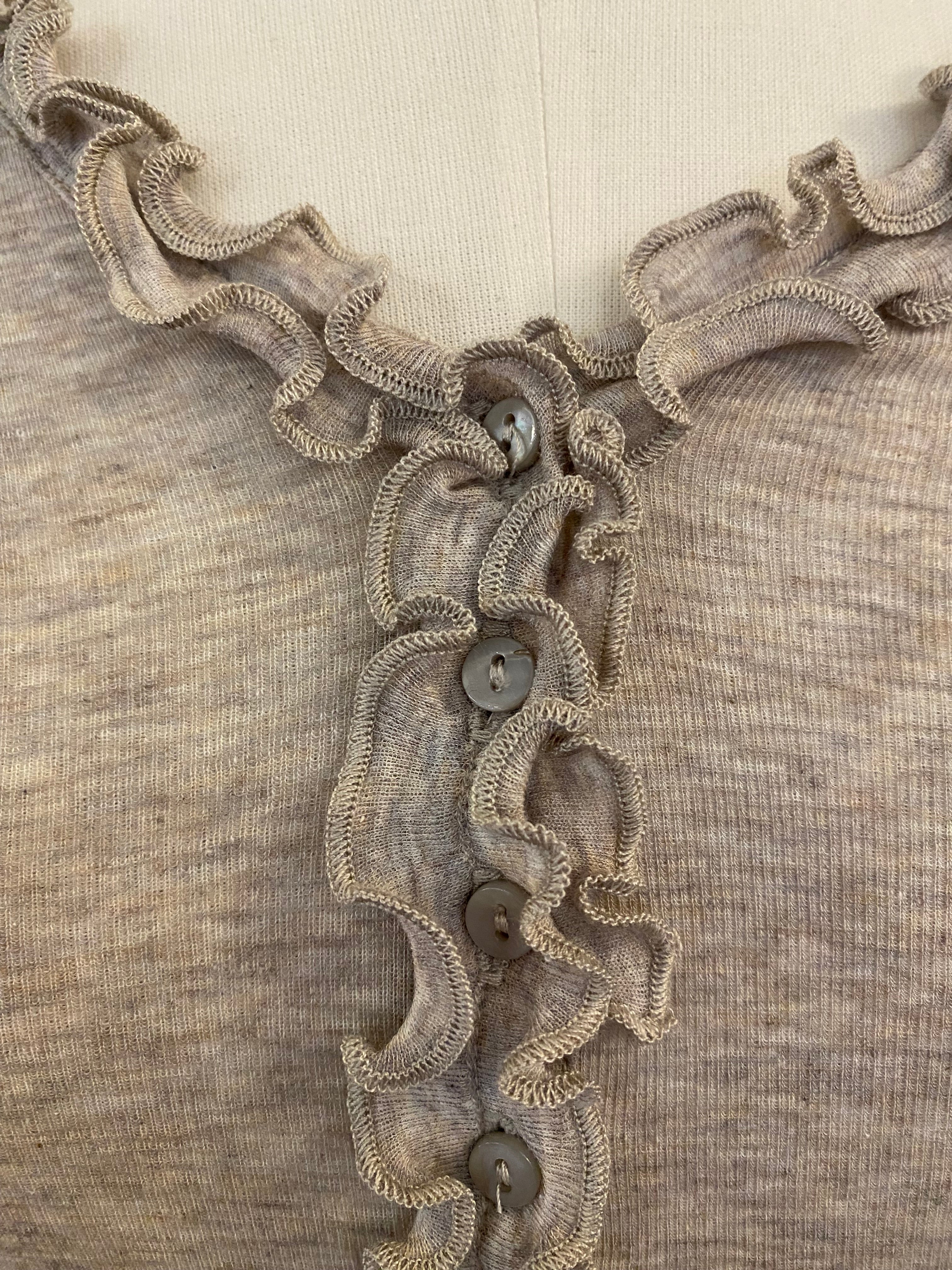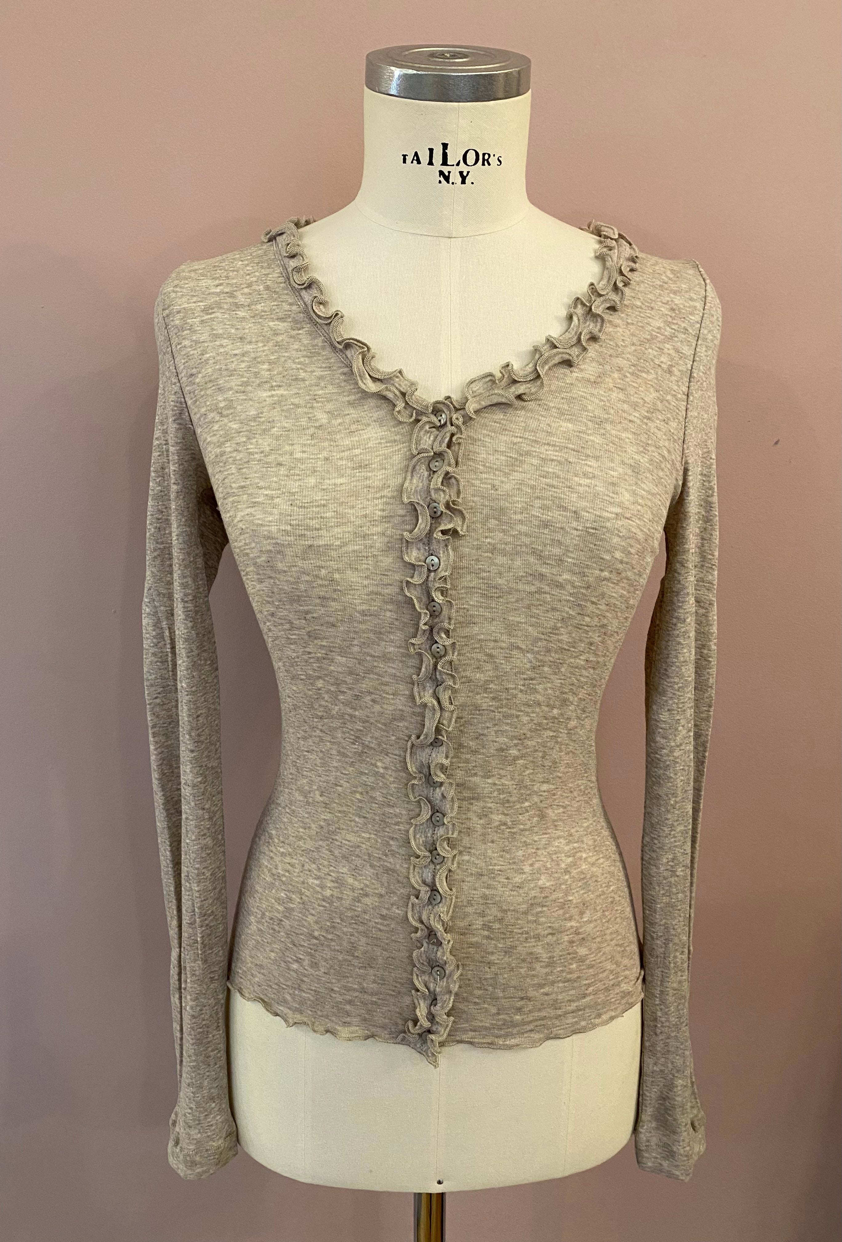 Großartiger Unterzieh-Cardigan mit langem Arm und durchgehender Knopfleiste mit Rüschenkante. Die Farbe ist ein zeitloses Taupe-Melange. Die feine Baumwolle passt sich der Körperform an. Perfekt für Drunter!