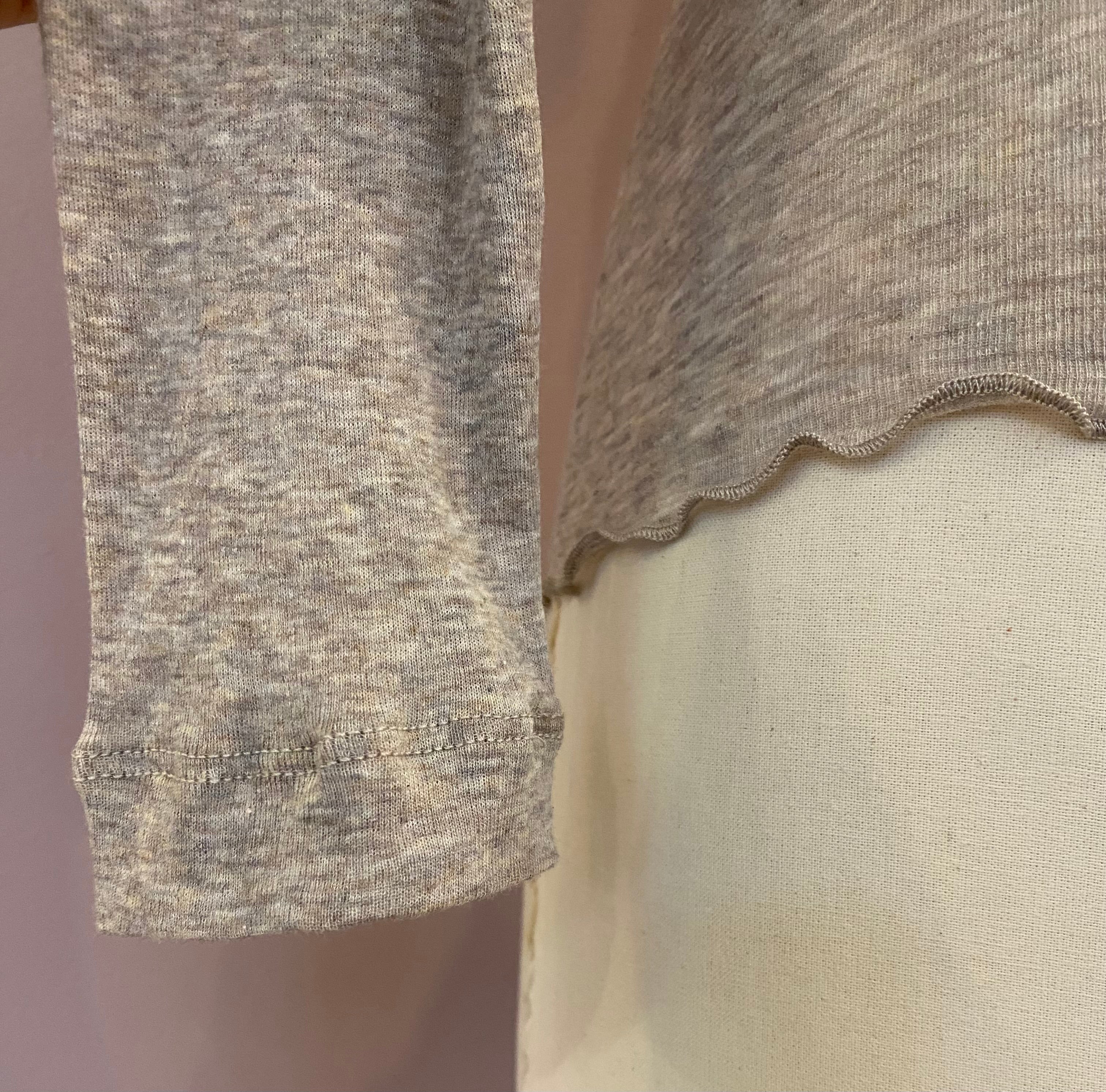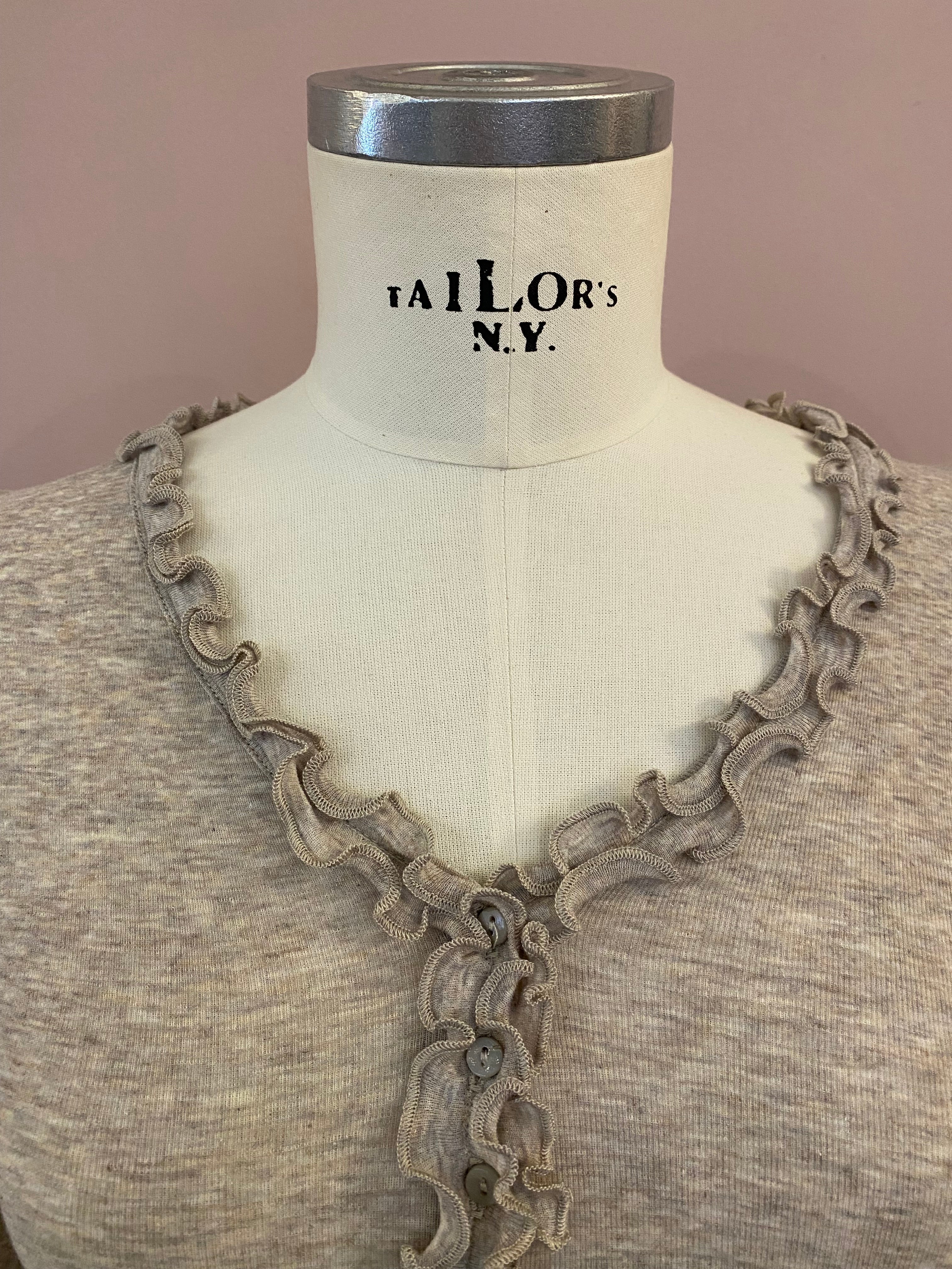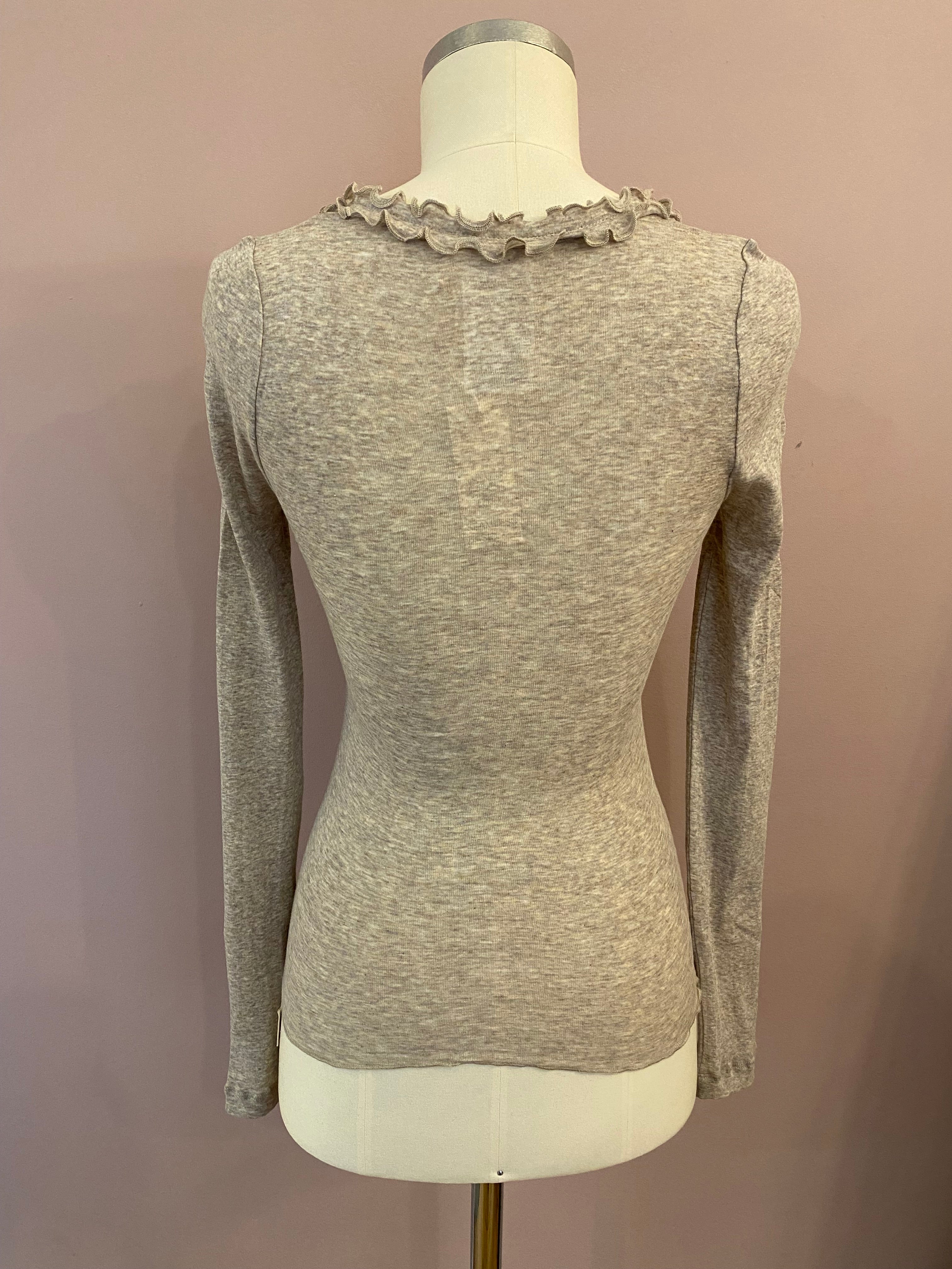 Großartiger Unterzieh-Cardigan mit langem Arm und durchgehender Knopfleiste mit Rüschenkante. Die Farbe ist ein zeitloses Taupe-Melange. Die feine Baumwolle passt sich der Körperform an. Perfekt für Drunter!