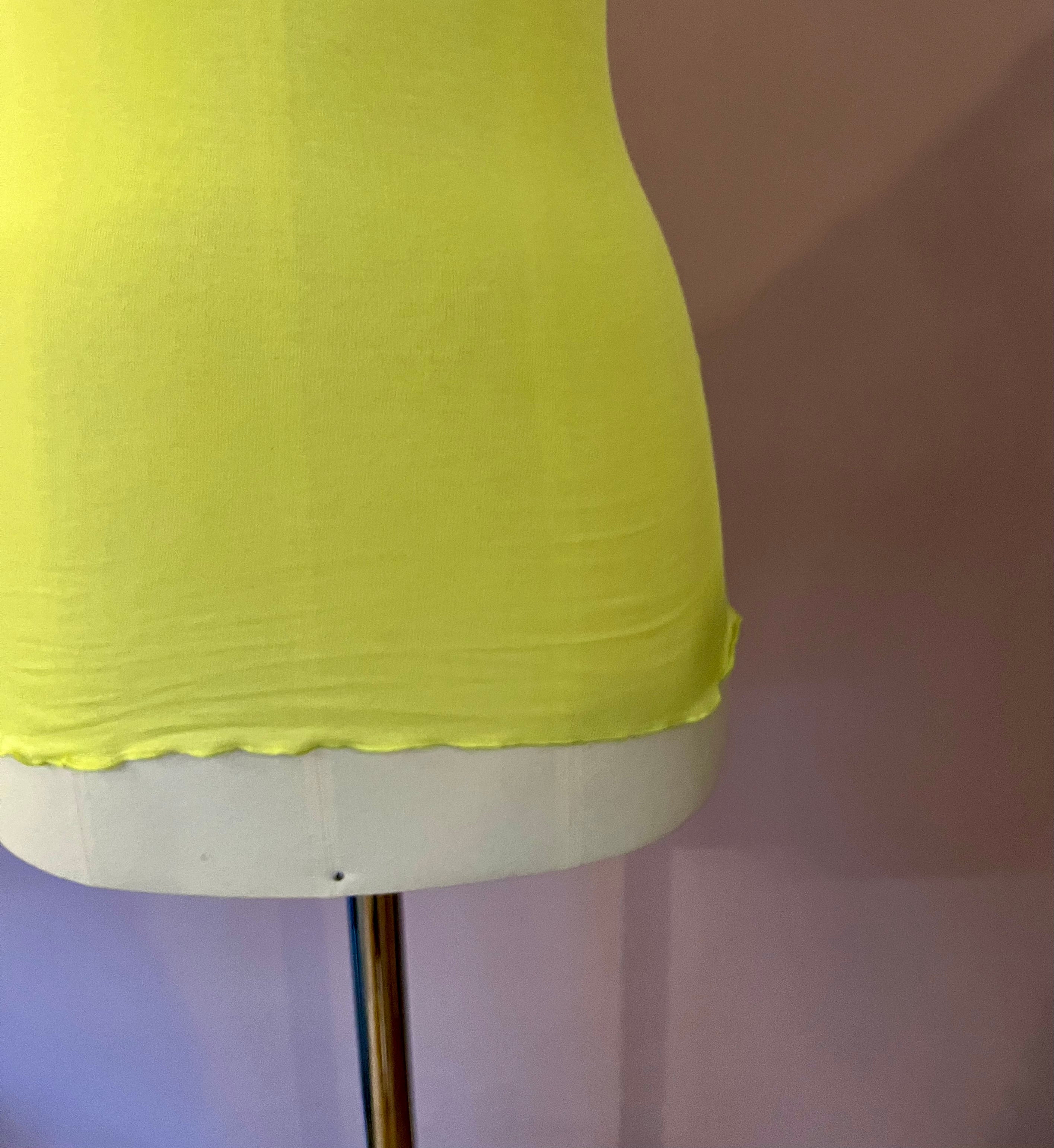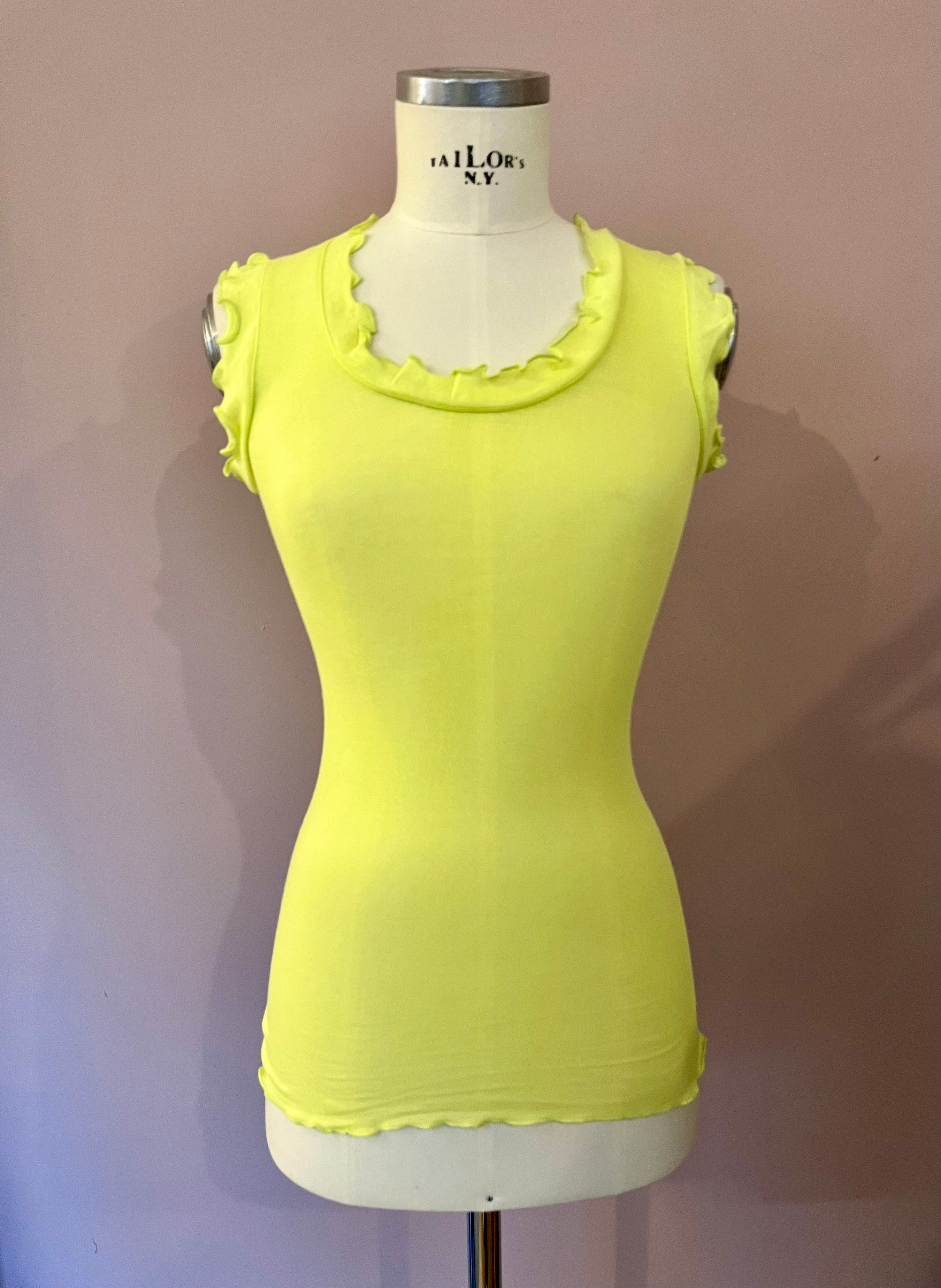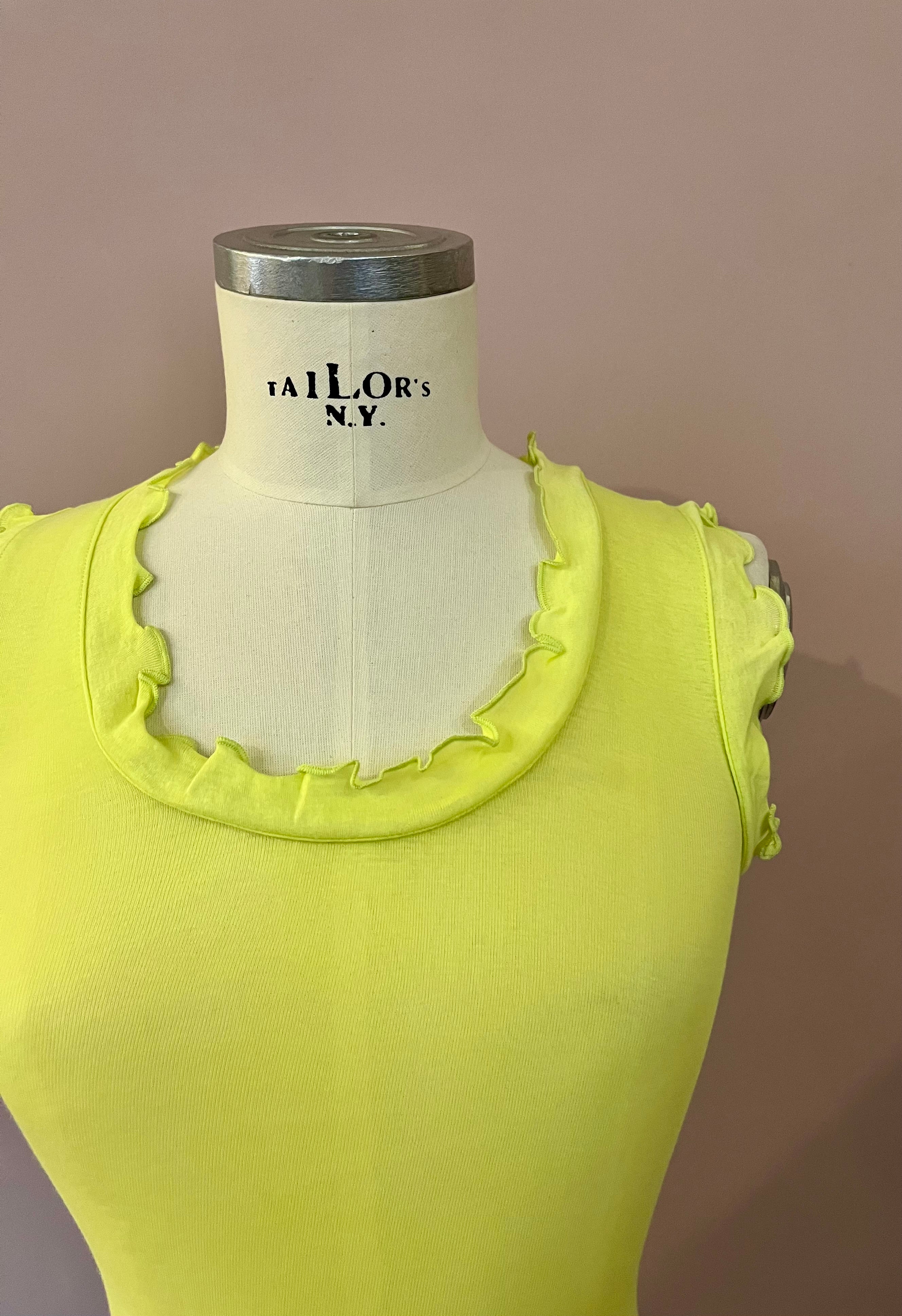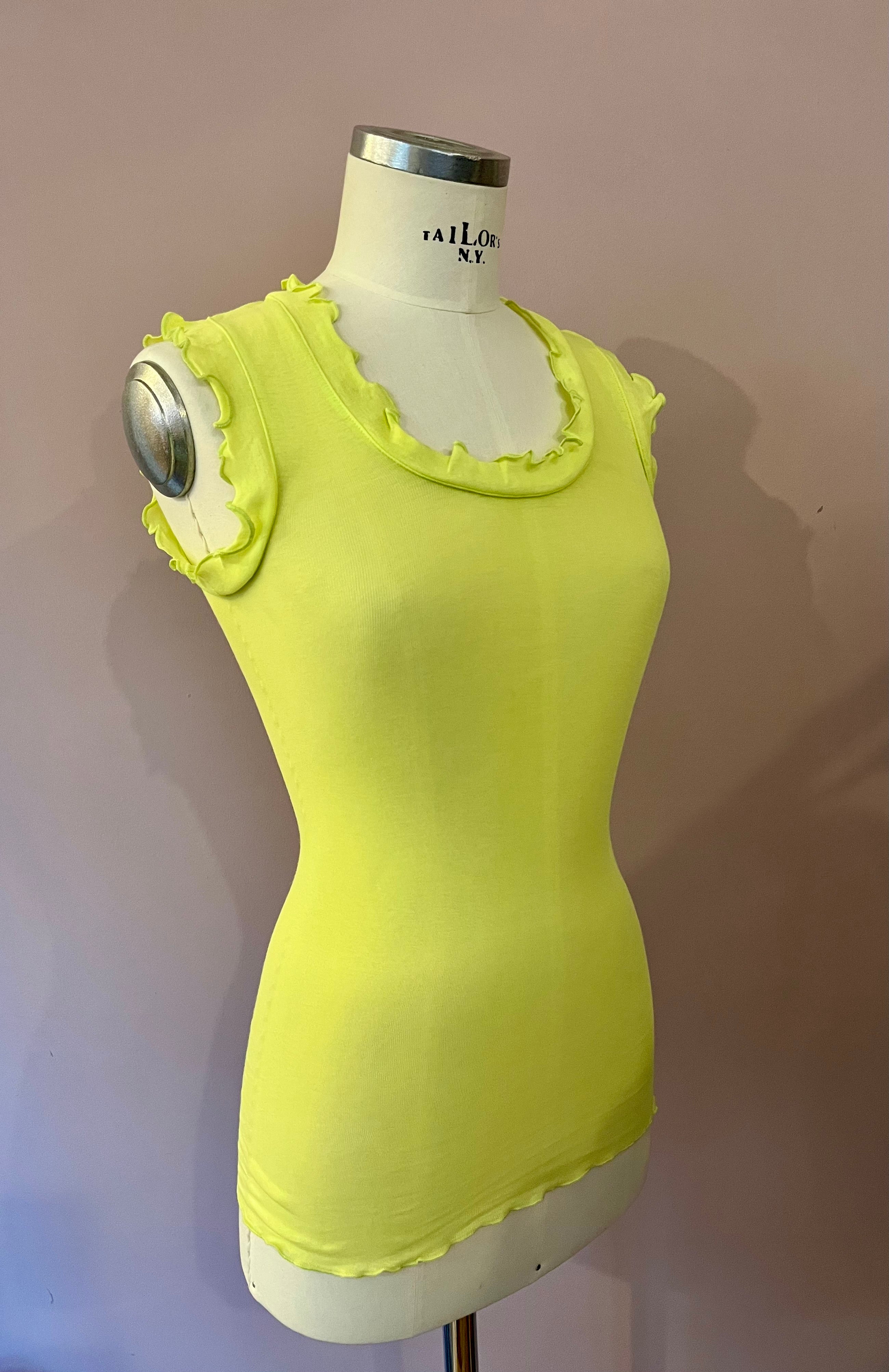 Wunderschönes Baumwolltop "Founce" in Neon-Gelb von Seamless Basic. Das hauchzarte Top hat einen halbtiefem Rundhalsausschnitt, der ebenso wie die Armausschnitte von einem feinen Volant mit Wellenkante umsäumt ist. Das Top hat eine weiche, anschmiegsame und zugleich flexible Passform, ganz ohne Seitennähte.