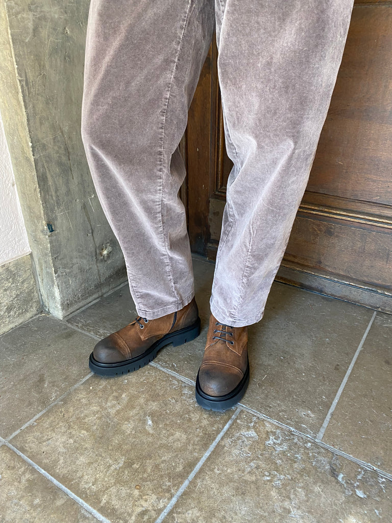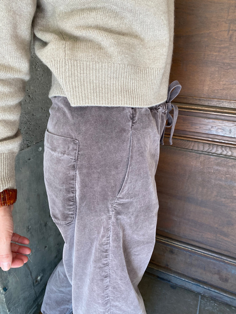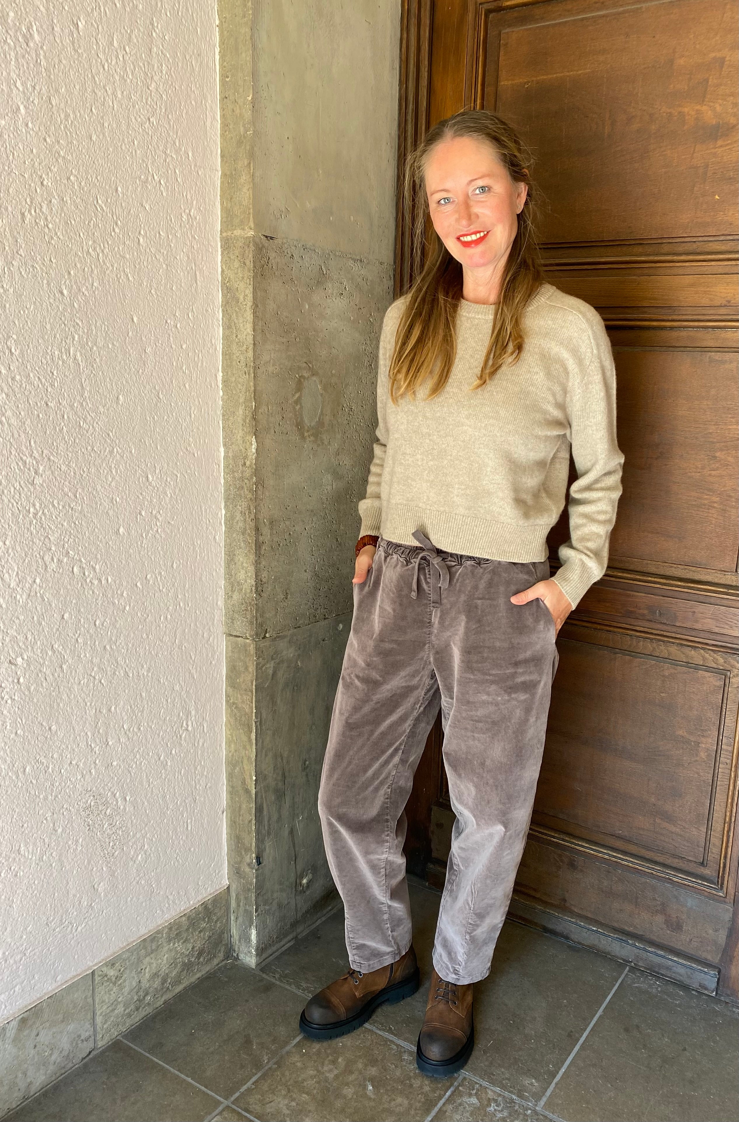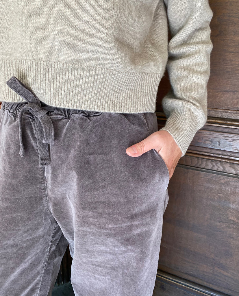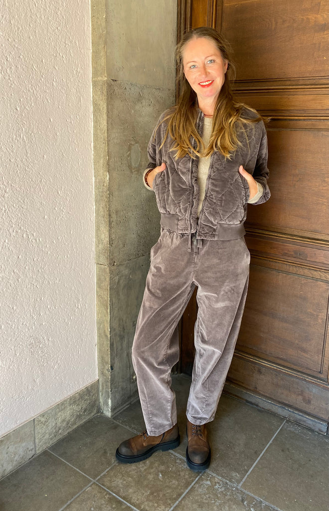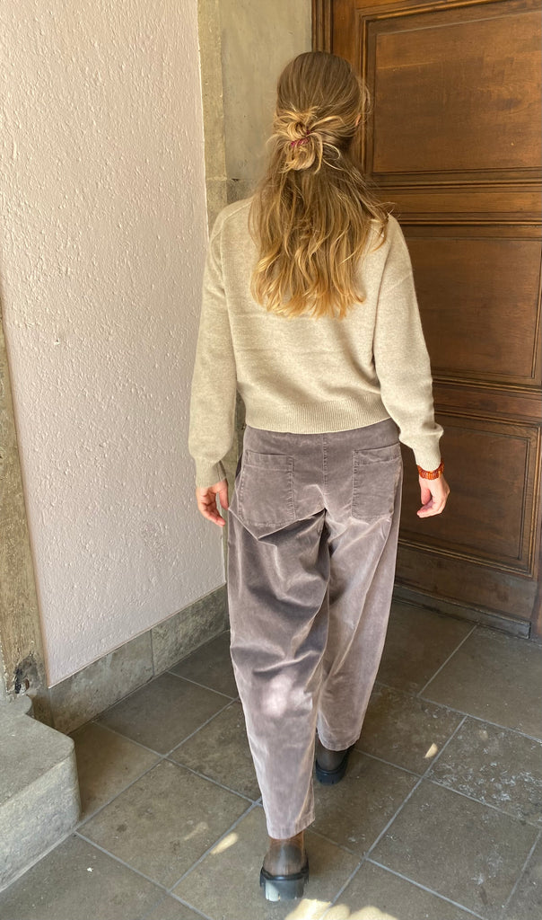 Lässig weite Schlupfhose aus Samt in Stone-washed-Chocolate von Crossley. Mit flexiblem Gummibund und breitem Bindeband im Tunnelzug. Zum legeren Look der Hose gehören auch zwei seitliche Eingrifftaschen sowie zwei aufgesetzte Backpockets. Die Weite des Beins wird zum Abschluss hin von einem mittig eingesetzten Abnäher reduziert.
