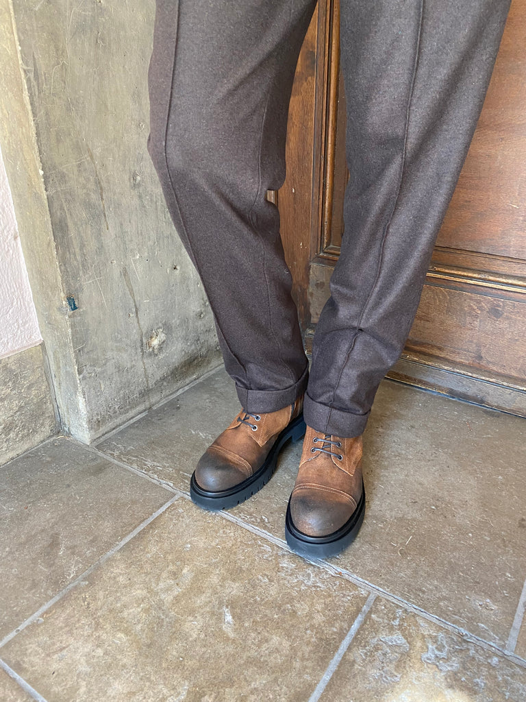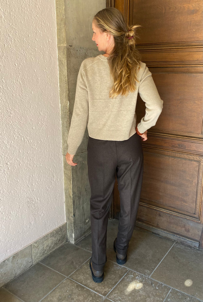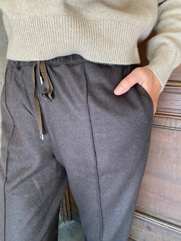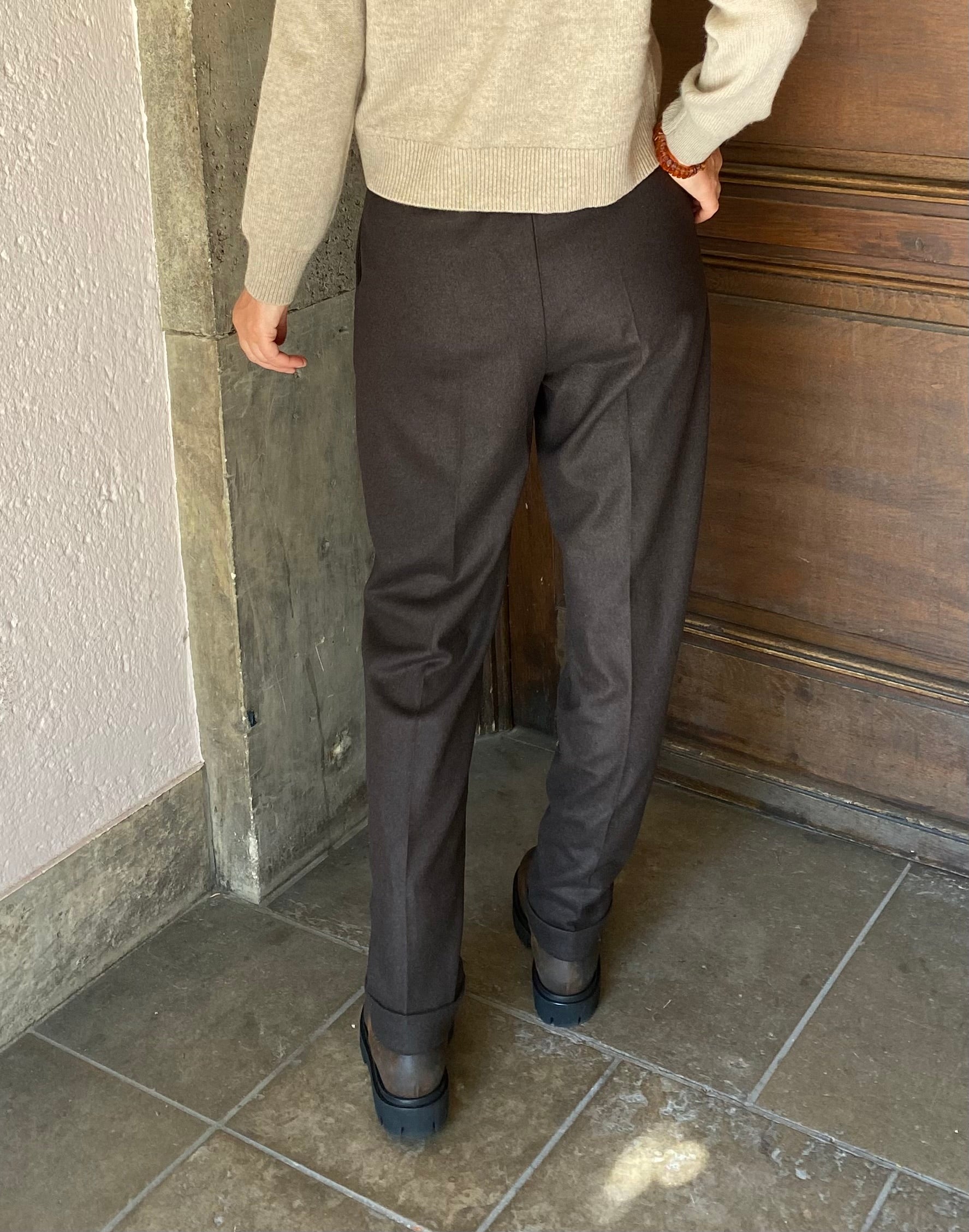 Wunderbare Wollhose mit fixierter Bügelfalte und Komfortbund in Dunkelbraun von Liviana Conti. Der feine Materialmix mit 70 % Cashmere sorgt für ein unglaublich angenehmes Tragegefühl. Die legere Schlupfhose überzeugt mit weiteren, durchdachten Details, wie einem schönen Bindeband aus Ripps mit silberfarbenen Wechselschließen. Seitliche Eingrifftaschen und ein fixer Umschlag am Beinabschluss vervollkommnen den lässigen Look. Das Bein ist figurschmeichelnd geschnitten und verjüngt sich leicht nach unten. Kurz um: Eine Hose, die man gar nicht mehr ausziehen möchte.