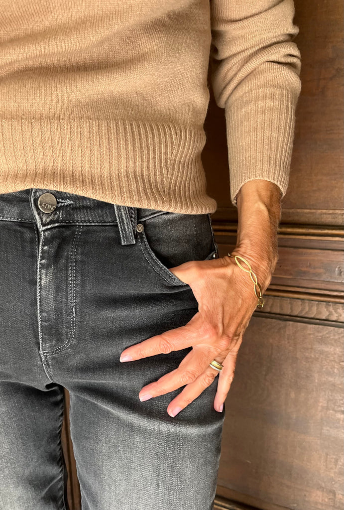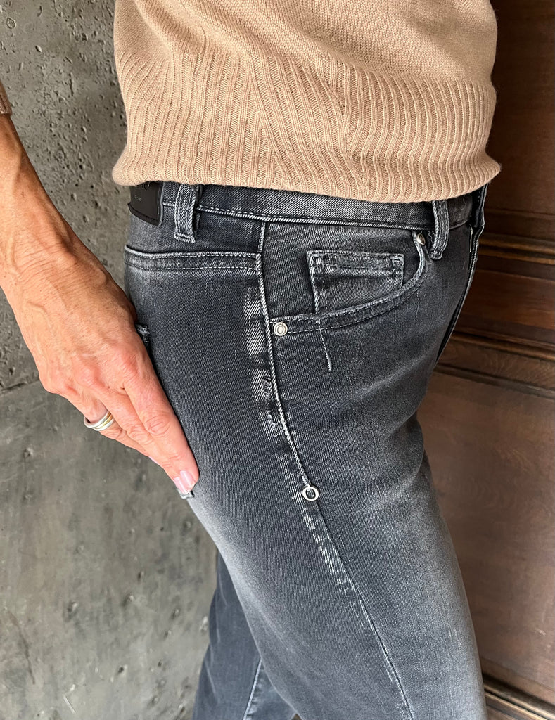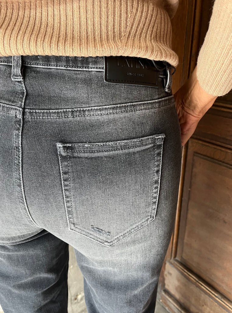 Die Jeans hat eine komfortable Leibhöhe und ist dank des Materialmixes wunderbar soft auf der Haut. Die Hose ist schmal geschnitten, aber nicht zu eng und ist etwa Knöchellang. Die dunkelgraue Waschung hat ein perfektes Bleeching, was die schöne Silhouette zusätzlich unterstreicht. Attraktiver Metall-Knopf mit Latino Prägung. Latino-Logo-Patch in Schwarz. Made in Italy.