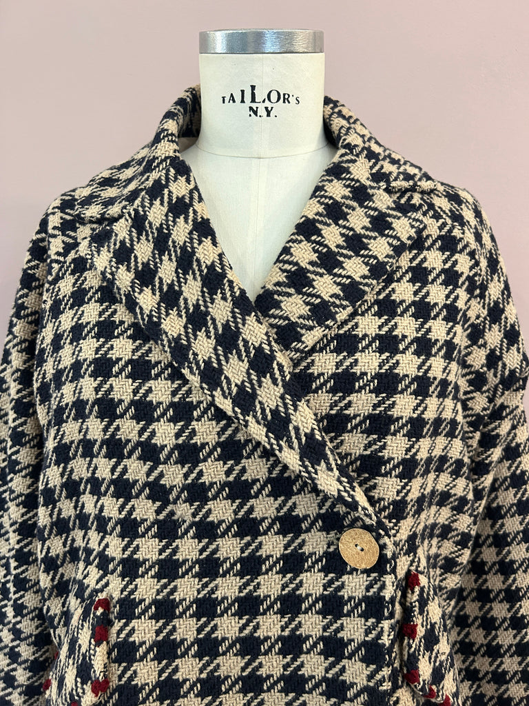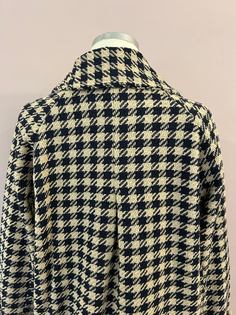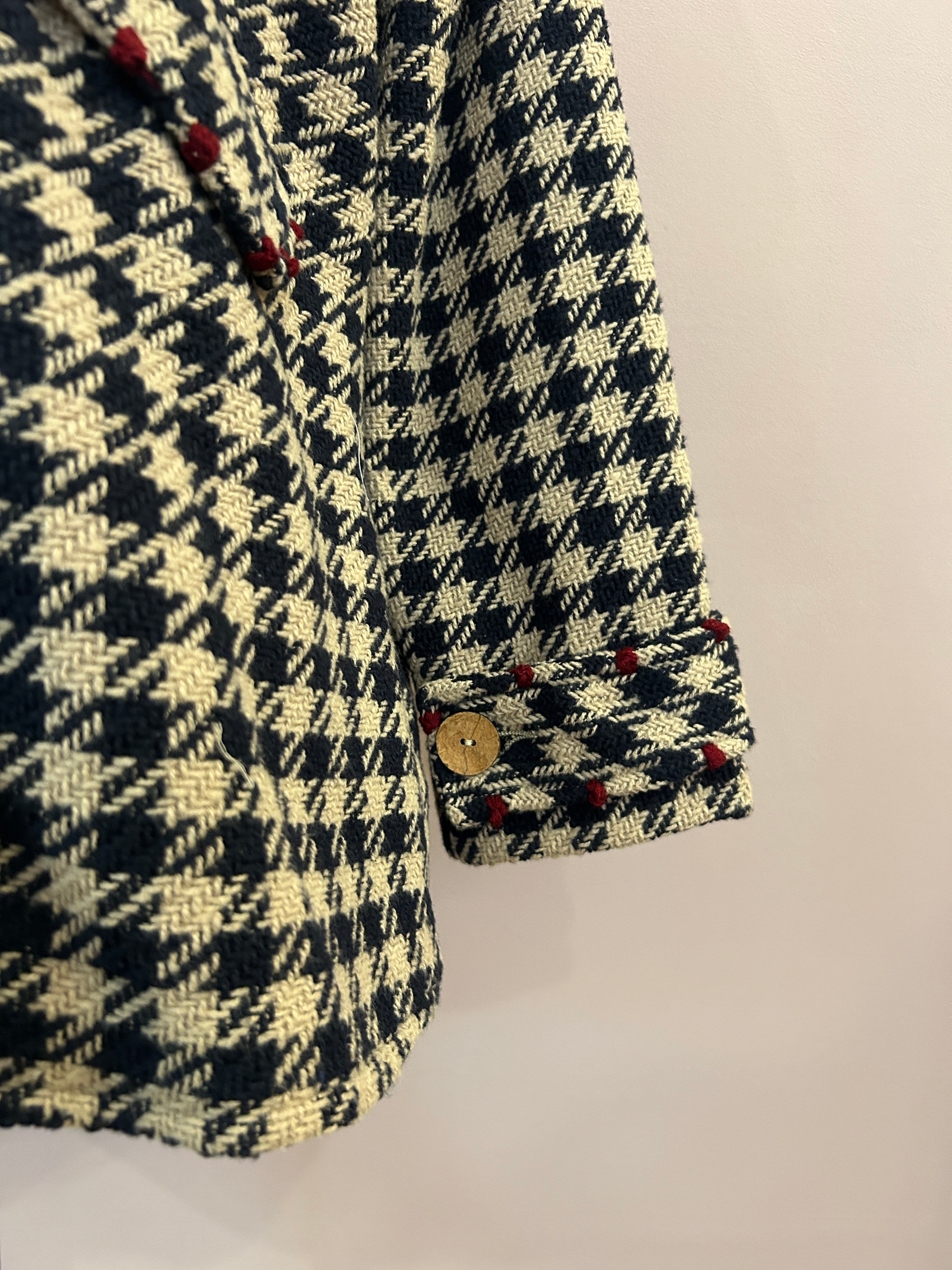 Oversized geschnittener Kurzmantel aus Tweed mit stilisiertem Hahnentritt in Dunkelblau und Sand von Alessia Santi. Der aus einem Baumwollmix mit Schurwolle gefertigte 3/4-Mantel hat schöne Raglanärmeln und eine verlängerte, gebogte Rückenpartie mit einer Kellerfalte für angenehme Weite. Er hat ein steigendes Revers, Pattentaschen und ein Schließknopfpaar, von dem ein Knopf verdeckt ist. Die Patten der Taschen und die Riegel an den Armabschlüssen sind mit kontrastierenden Details in Dunkelrot versehen, die dem zeitlosen Kurzmantel einen modischen Twist verleihen.