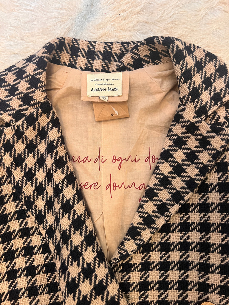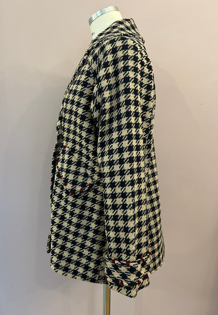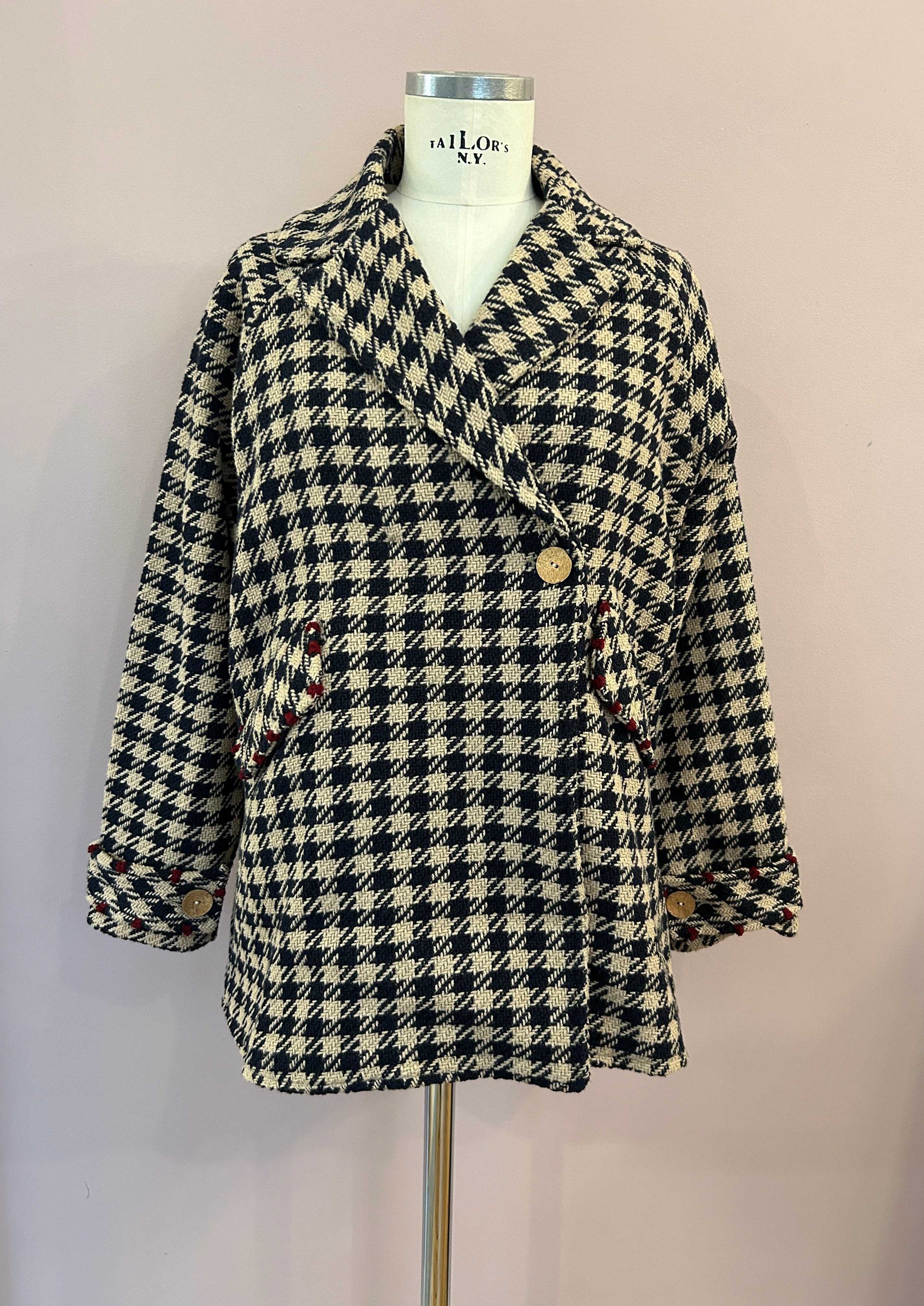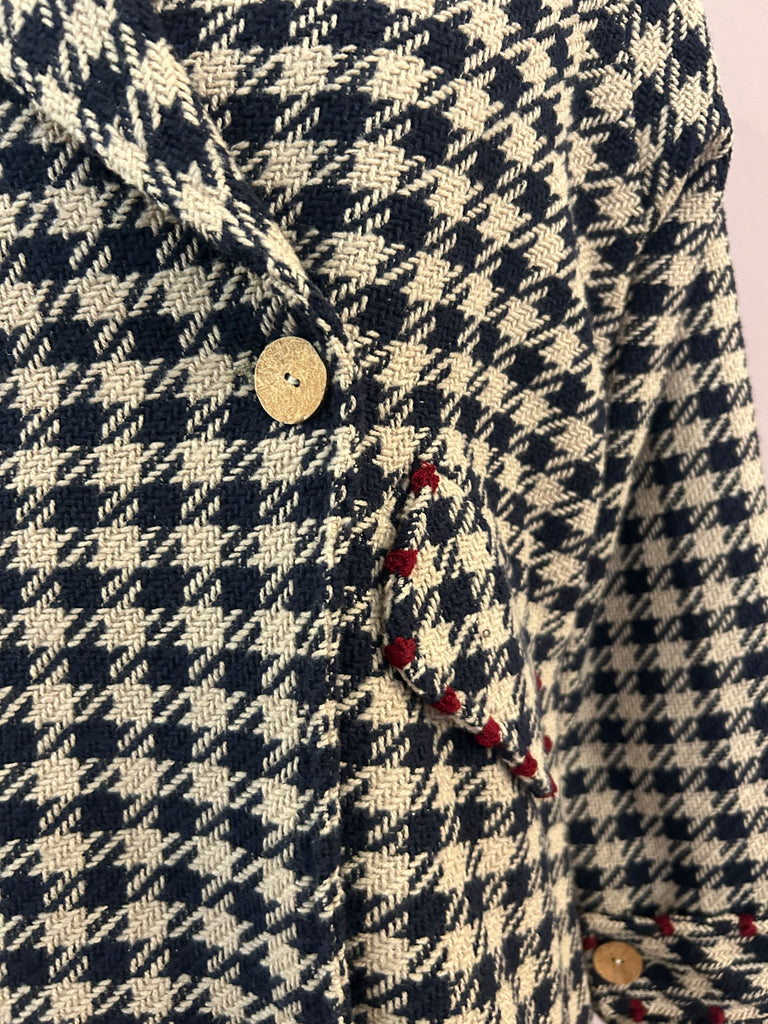 Oversized geschnittener Kurzmantel aus Tweed mit stilisiertem Hahnentritt in Dunkelblau und Sand von Alessia Santi. Der aus einem Baumwollmix mit Schurwolle gefertigte 3/4-Mantel hat schöne Raglanärmeln und eine verlängerte, gebogte Rückenpartie mit einer Kellerfalte für angenehme Weite. Er hat ein steigendes Revers, Pattentaschen und ein Schließknopfpaar, von dem ein Knopf verdeckt ist. Die Patten der Taschen und die Riegel an den Armabschlüssen sind mit kontrastierenden Details in Dunkelrot versehen, die dem zeitlosen Kurzmantel einen modischen Twist verleihen.