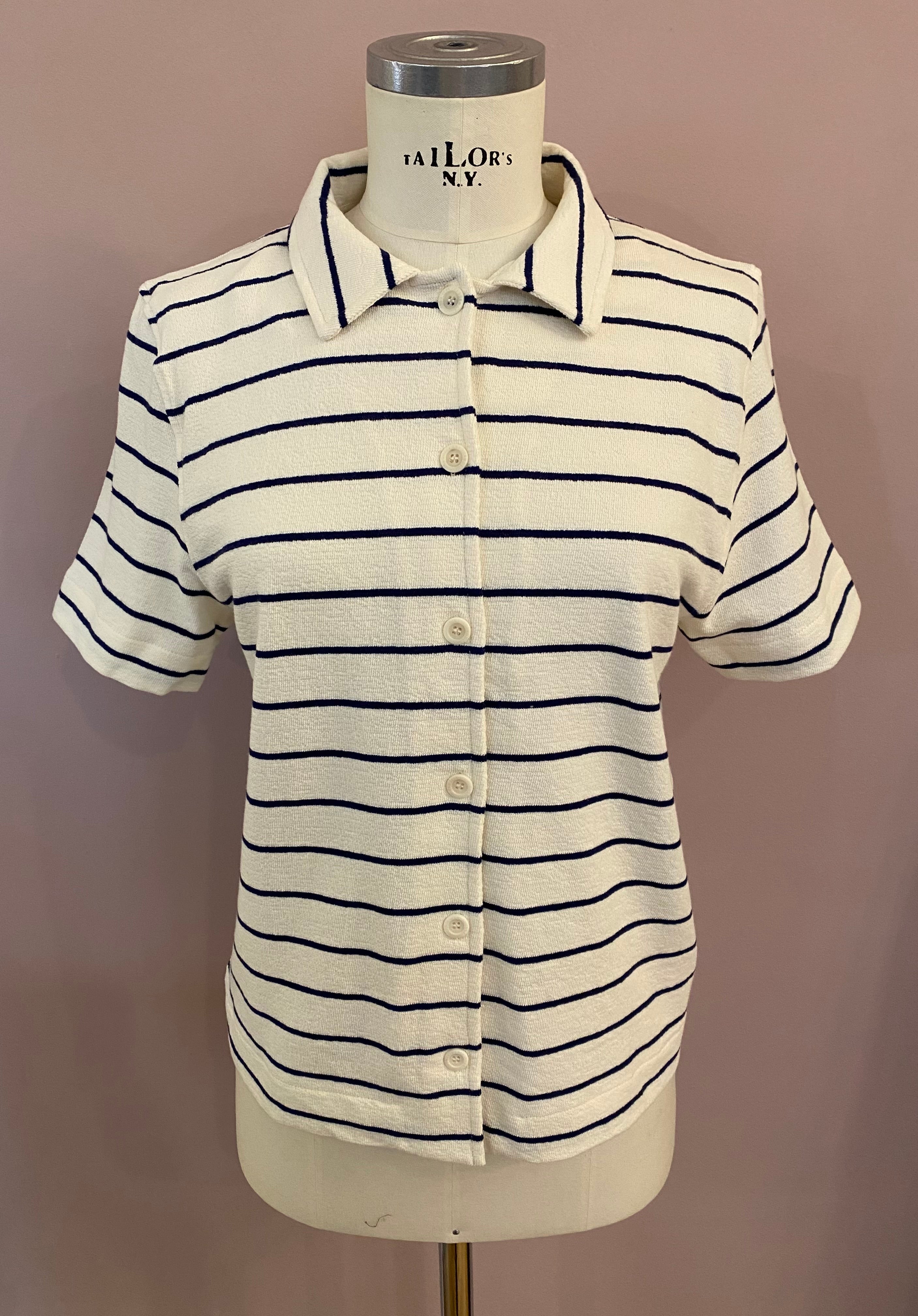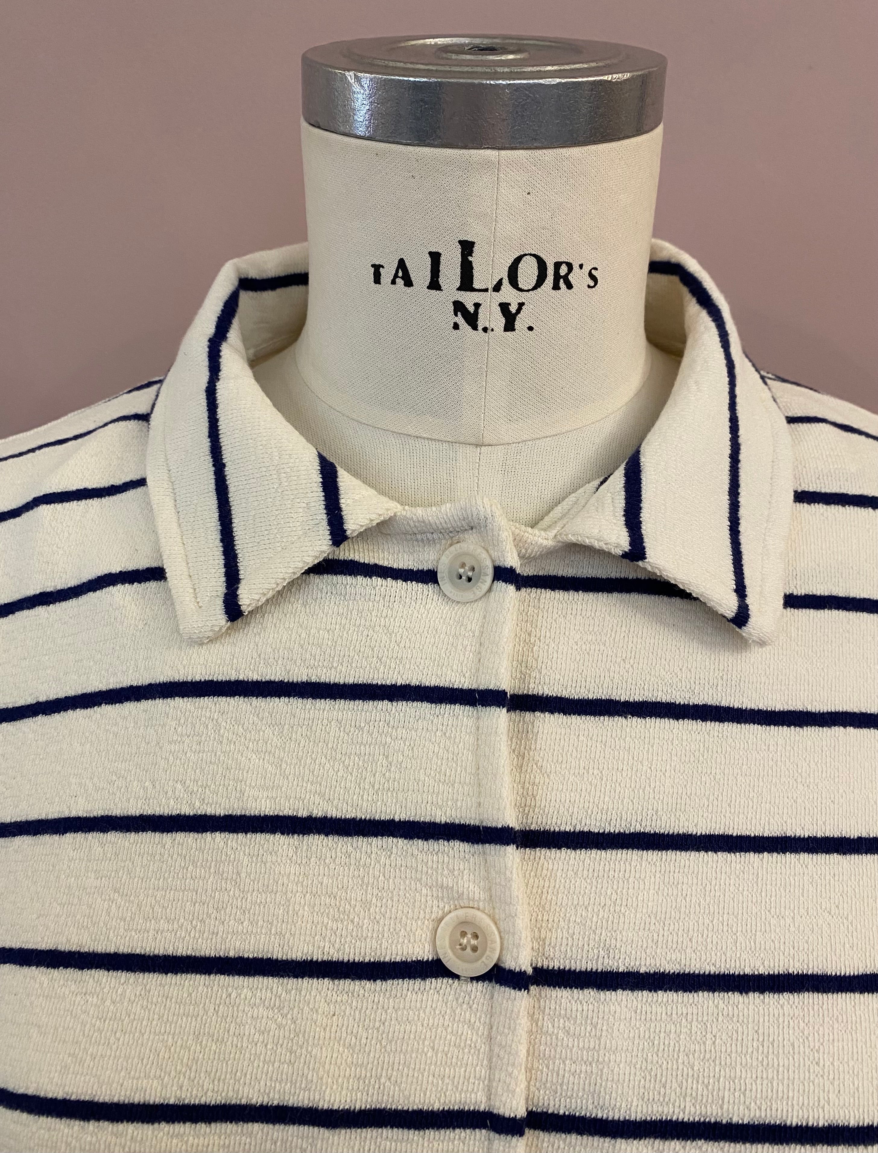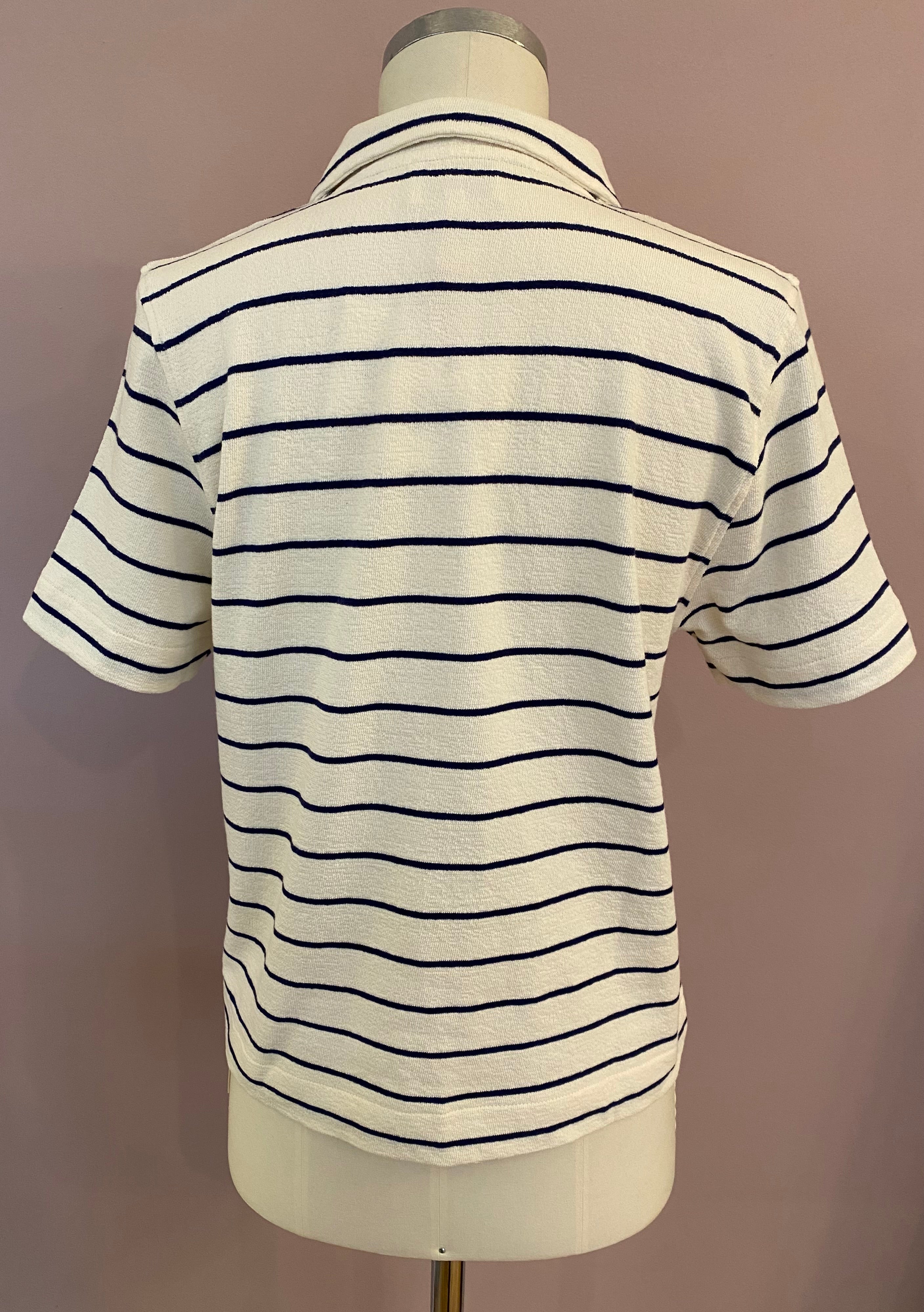 Poloshirt "Nizia" in Ecru mit schmalem, dunkelblauem Streifen von Ines de la Fressange. Gerade geschnittenes Sommerpolo mit typischem Kentkragen, kurzem Arm und durchgehender Knopfleiste mit sechs hellen Signatur-Knöpfen. Der innen leicht frottierte Organic Cotton sorgt für hohen Tragekomfort. Ein Lieblingsteil für wärmere Tage.