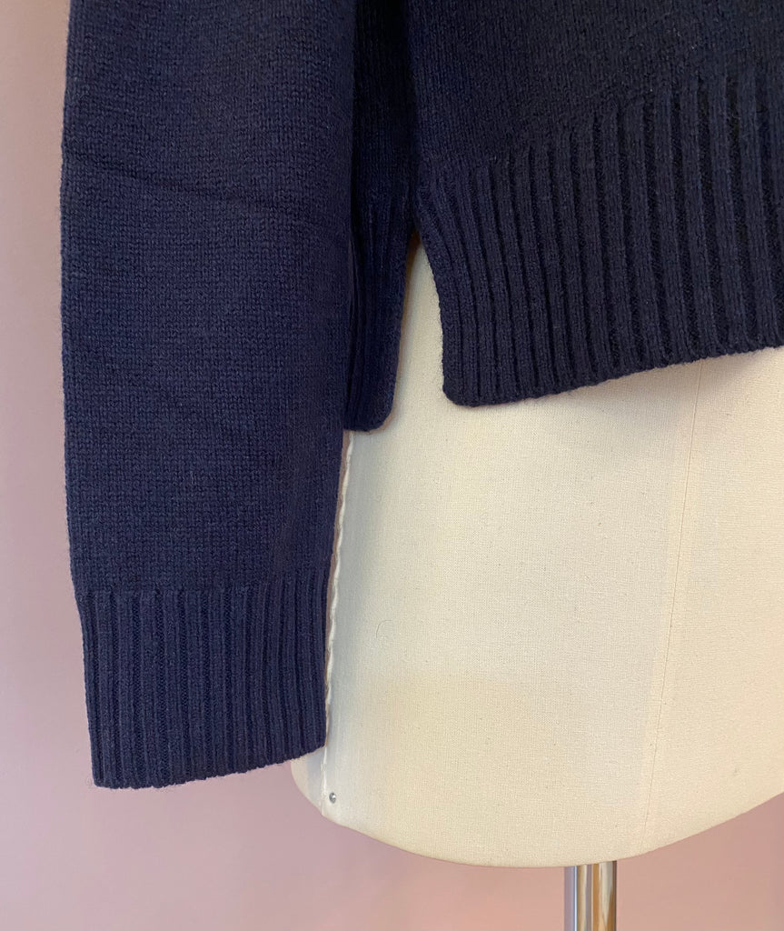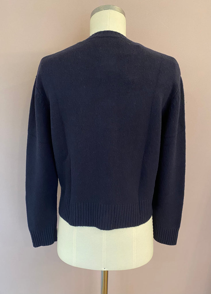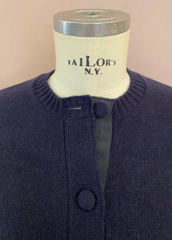 Kuscheliger Glattstrick-Cardigan "Sirine" in herrlichem Dunkelblau, von Officine Générale. Leicht boxy geschnittene Passform mit schönem Roundneck und Rippstrick-Details an den Abschlüssen. Die untere Knopfleiste ist mit einem dunkelblauen Ripsband belegt und hat vier Schließknöpfe, die mit Strick bezogen sind. Seitliche Cut-outs vervollkommnen den edlen Look der aus feinster Wolle gefertigten Strickjacke.