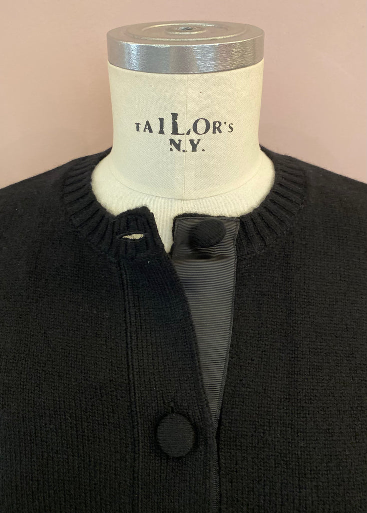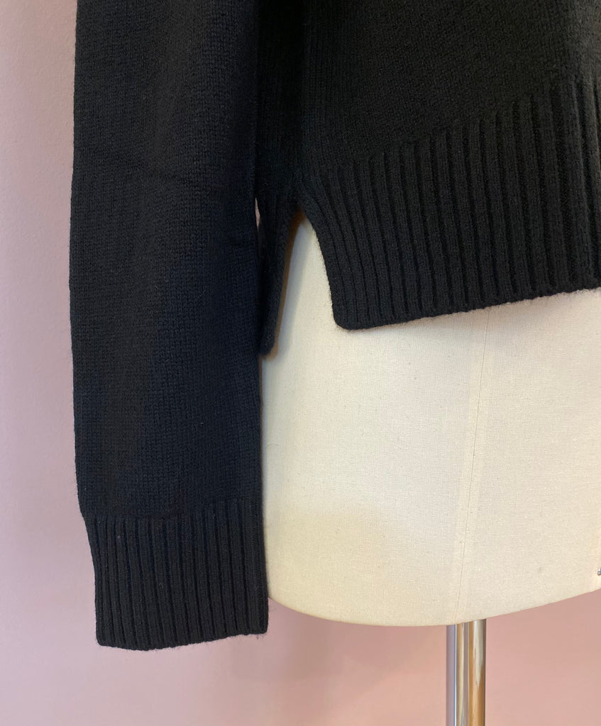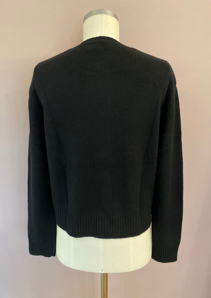 Kuscheliger Glattstrick-Cardigan "Sirine" in klassischem, tiefen Schwarz, von Officine Générale. Leicht boxy geschnittene Passform mit schönem Roundneck und Rippstrick-Details an den Abschlüssen. Die untere Knopfleiste ist mit einem dunkelblauen Ripsband belegt und hat vier Schließknöpfe, die mit Strick bezogen sind. Seitliche Cut-outs vervollkommnen den edlen Look der aus feinster Wolle gefertigten Strickjacke.