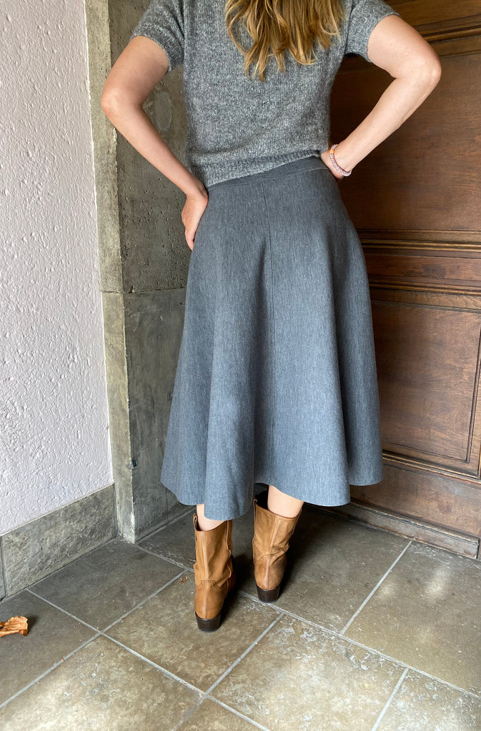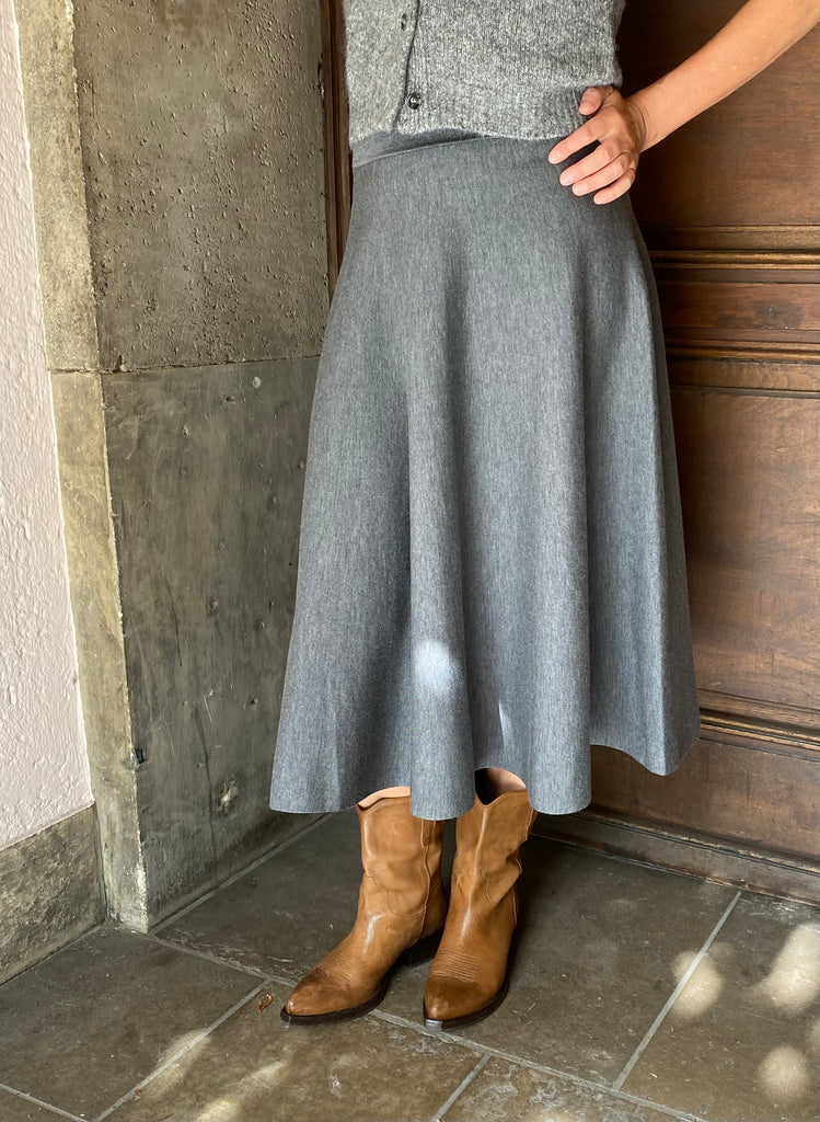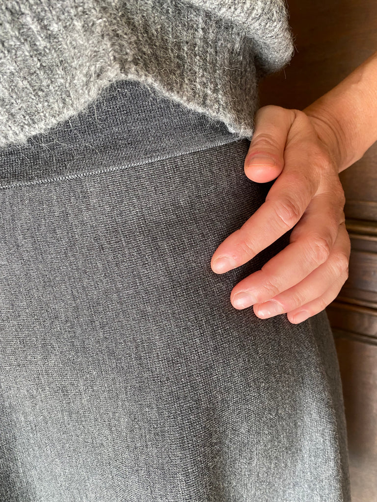 Wunderbar, schwer fallender, gestrickter, knieumspielender Tellerrock in Grau Melange von Roberto Collina. Die verlängerte Midi-Länge und der schöne Fall geben dem Rock eine gute Silhouette mit angenehmem Schwung. Er verfügt über einen breiten, komfortablen Bund und ist mit sauberen Kanten verarbeitet.