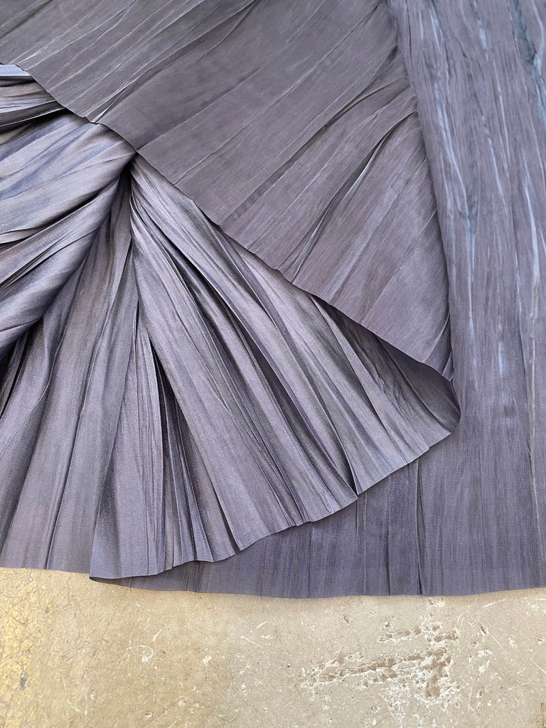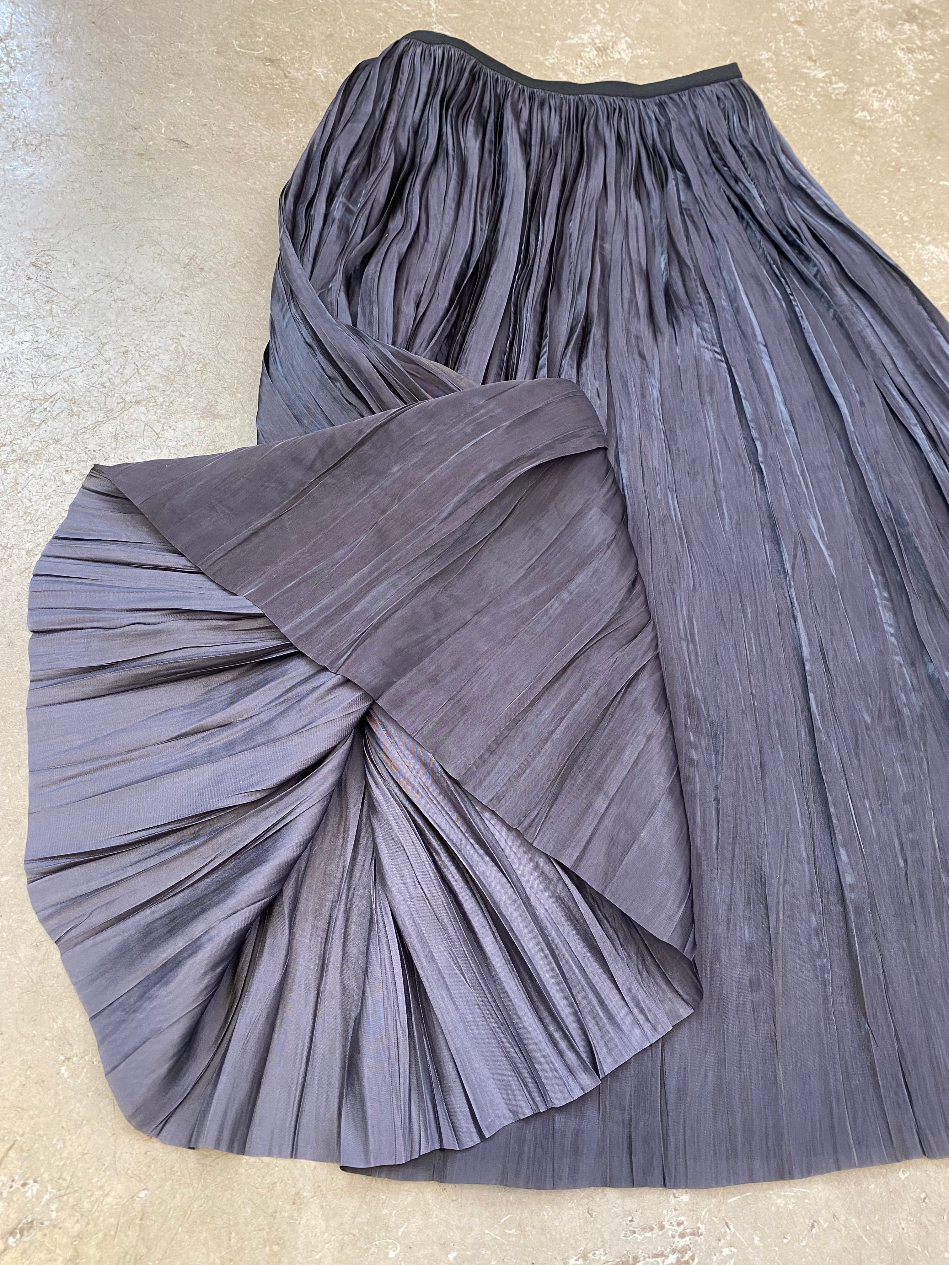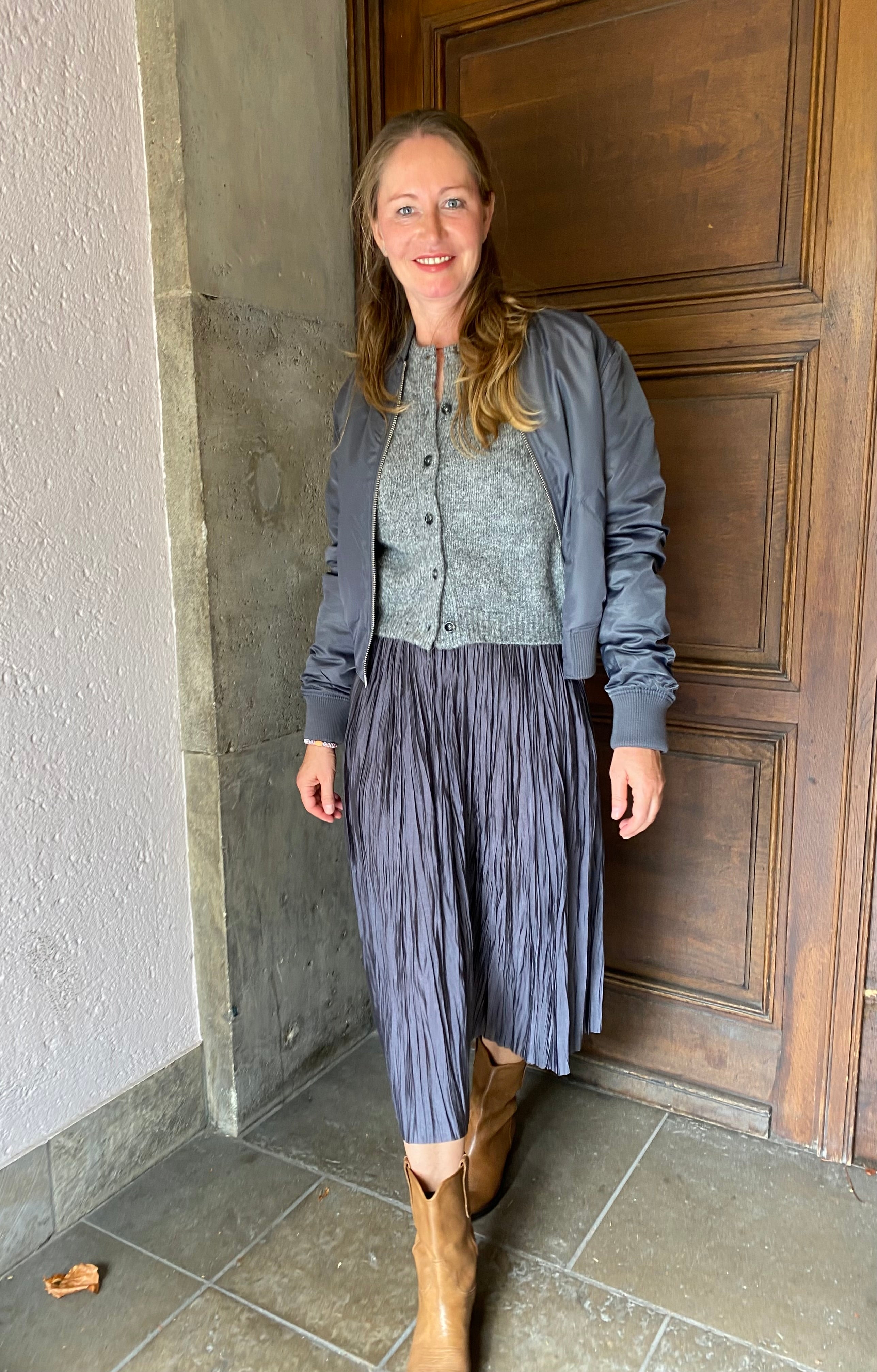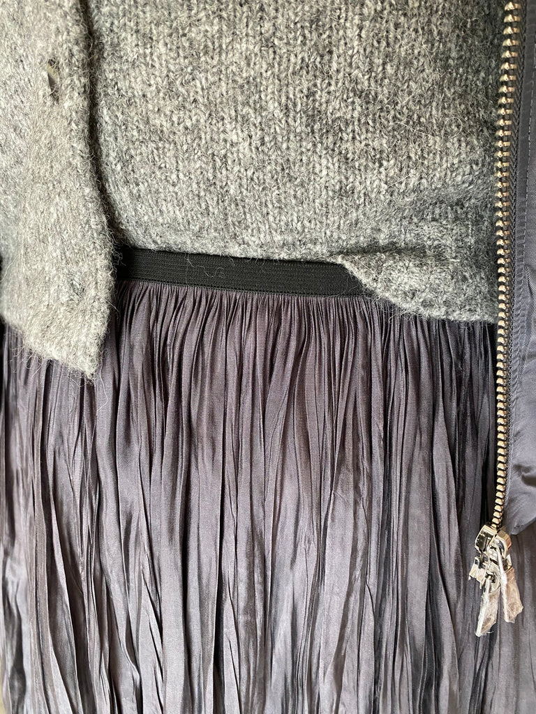 Dezent glänzender Midi-Plisseerock in Anthrazit von Roberto Collina. Der elastische Bund und die gerade Schnittform garantieren bequemen Sitz und Zeitlosigkeit. Der etwa wadenlange Rock lässt sich nicht nur in der Übergangszeit, sondern auch im Herbst und Winter problemlos kombinieren. Mit lässigem Cardigan oder Pullover und z.B. einer Bomberjacke, sowie Stiefeln, wird daraus ein ebenso stimmiges, wie unkompliziertes Herbst-Outfit.