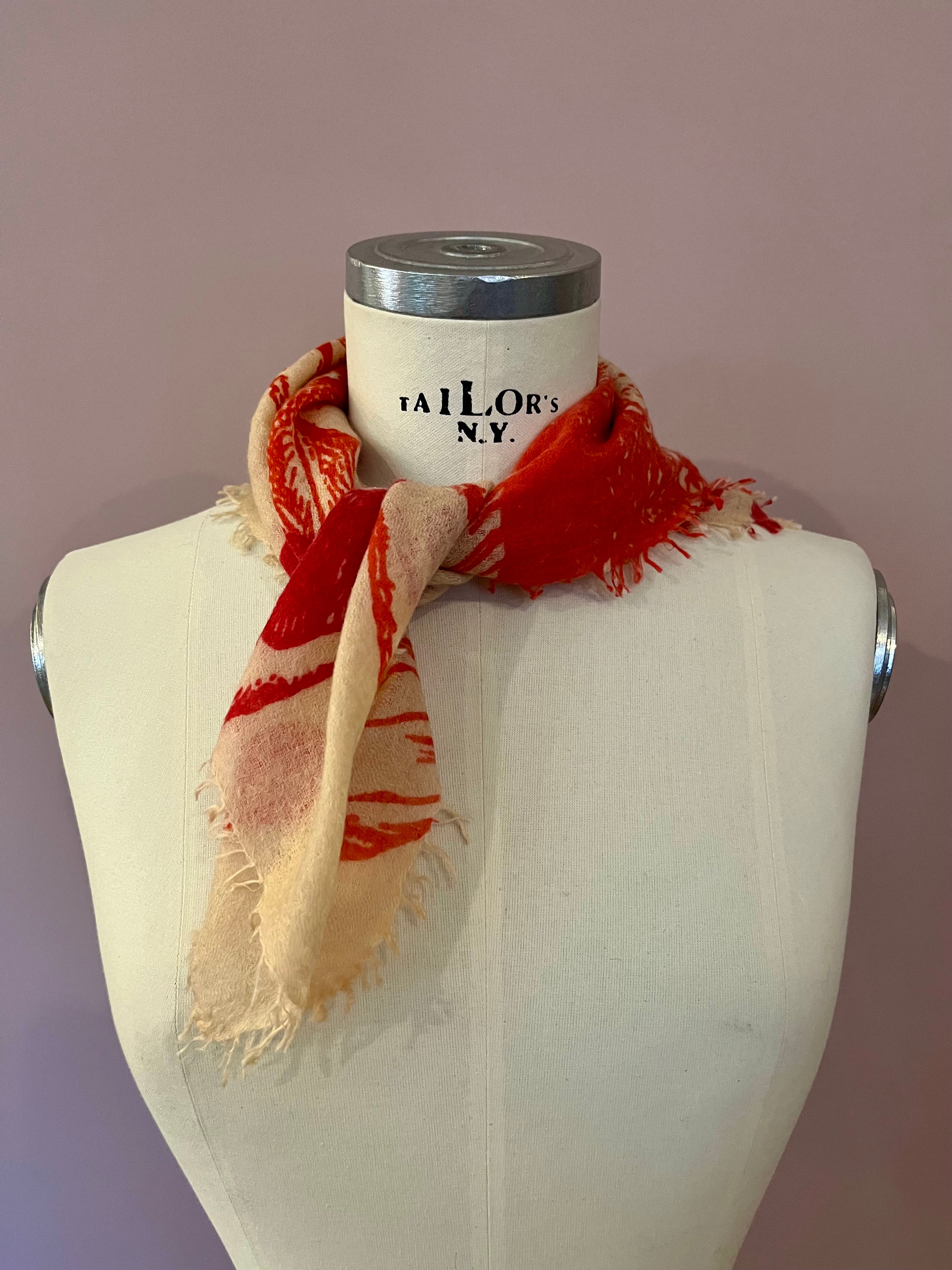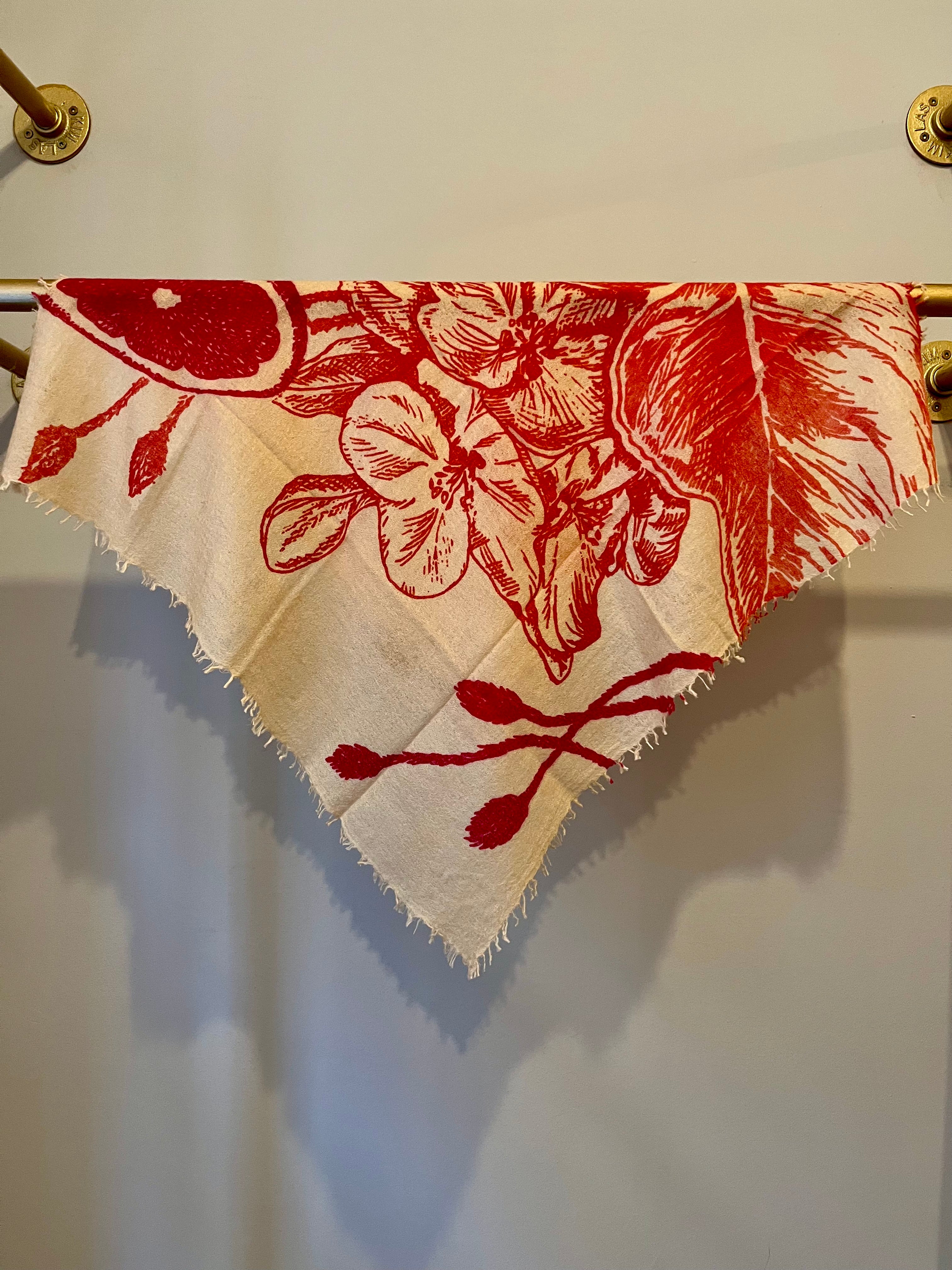 Super softes, feines Bandana aus gefilztem Kaschmir von Mouleta. Quadratisches Schaltuch mit Zitrusfrüchten und -blumen Print in kühlem Sandton, Pink und leuchtendem Orange. Der perfekte Begleiter für die See oder kühle Abende - in den Ausschnitt einer Bluse geknotet oder zu einem Pullover oder einer Jeansjacke kombiniert.