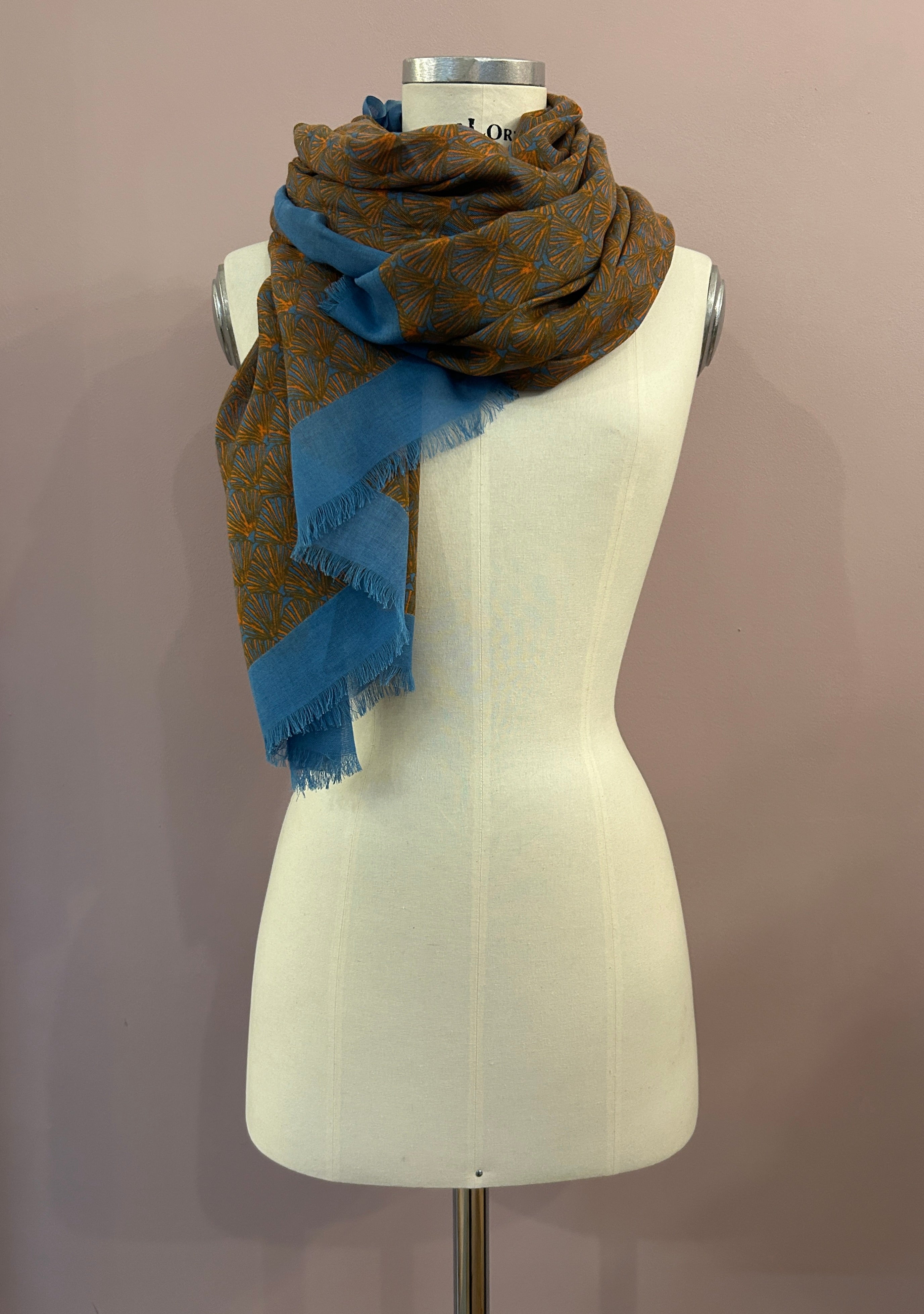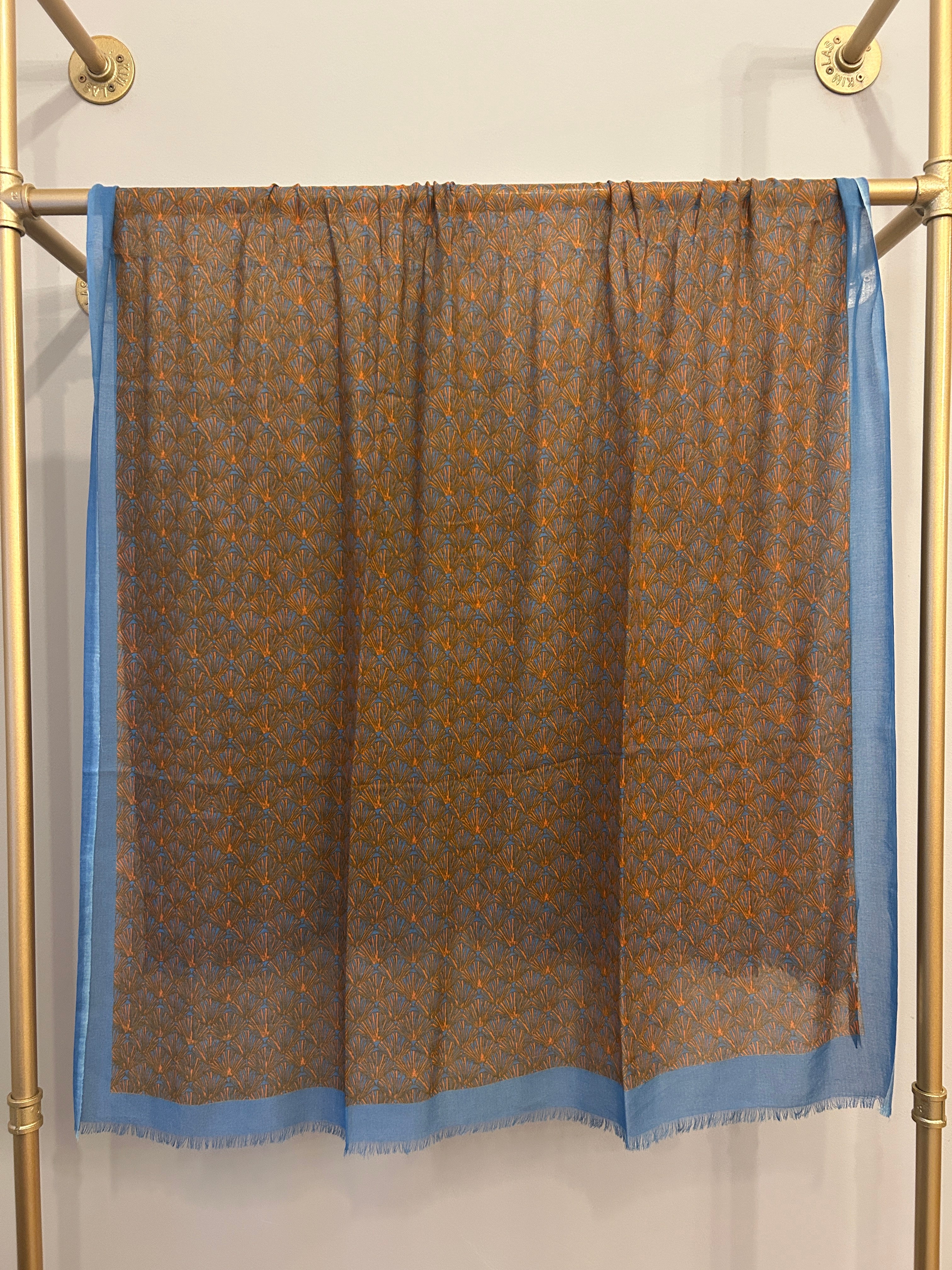 Feines Tuch in einem zarten Taubenblau, mit einem feinen All-over-Print aus orangefarbenen Muschelmotiven – dezent, elegant.