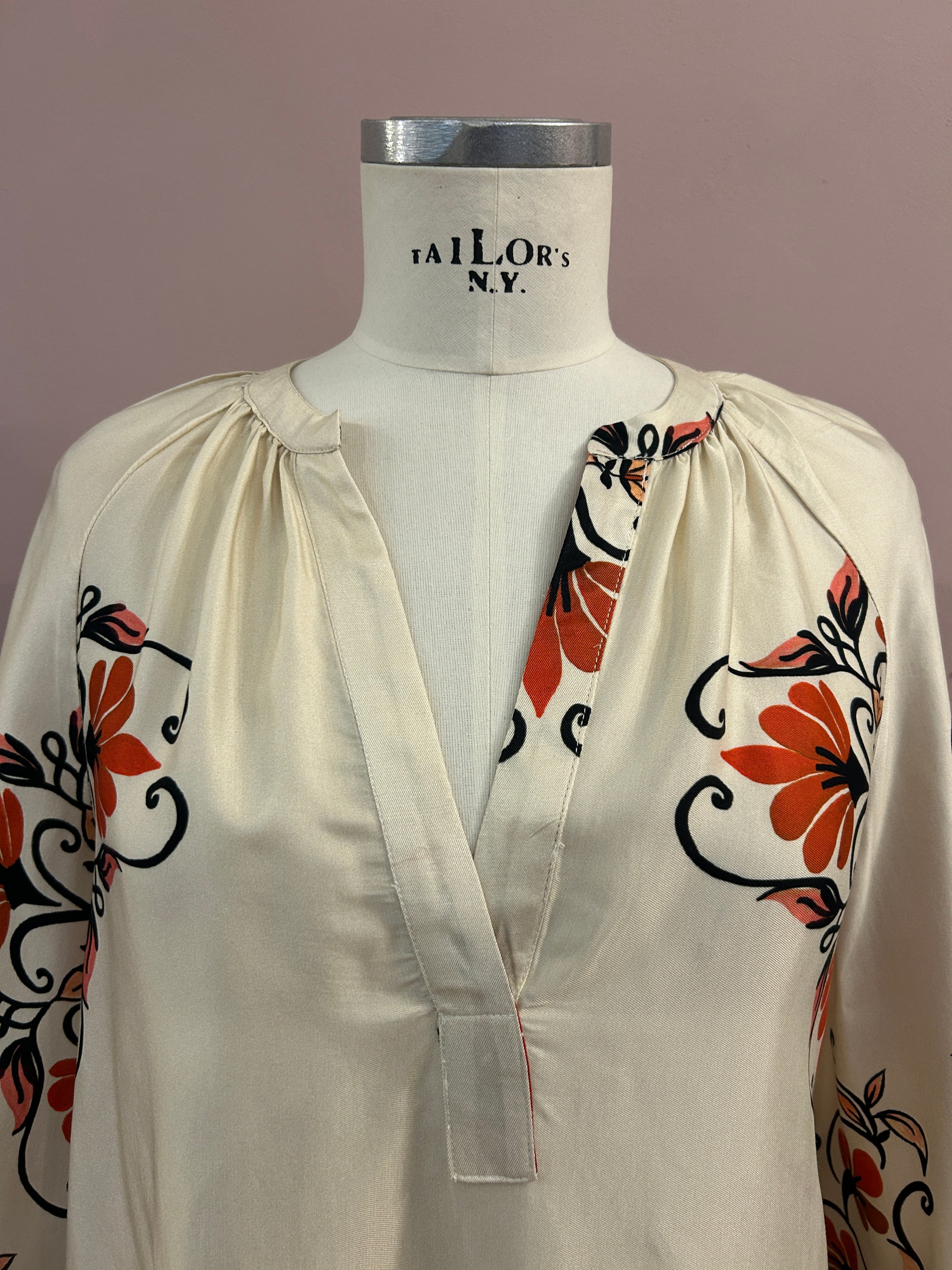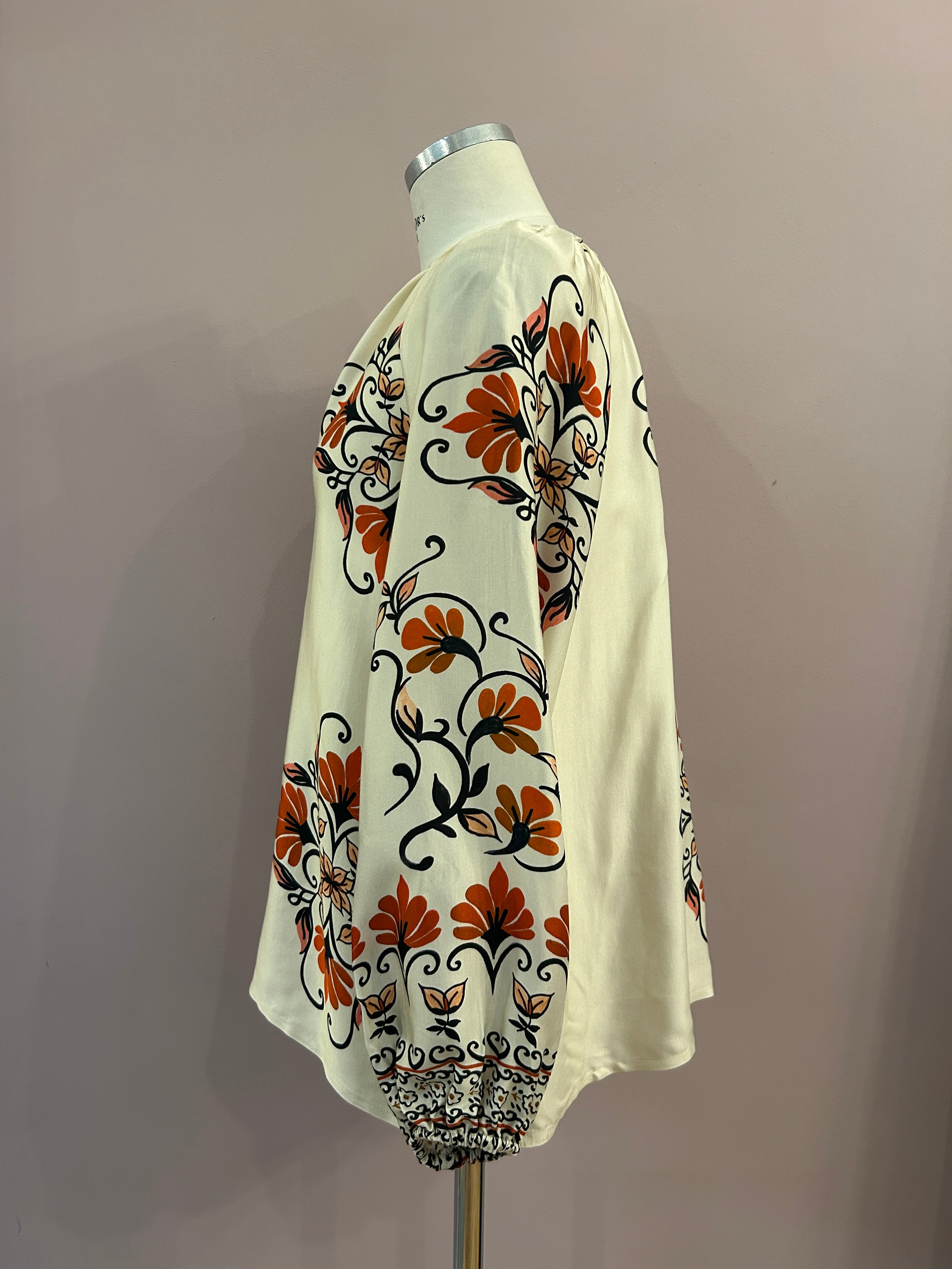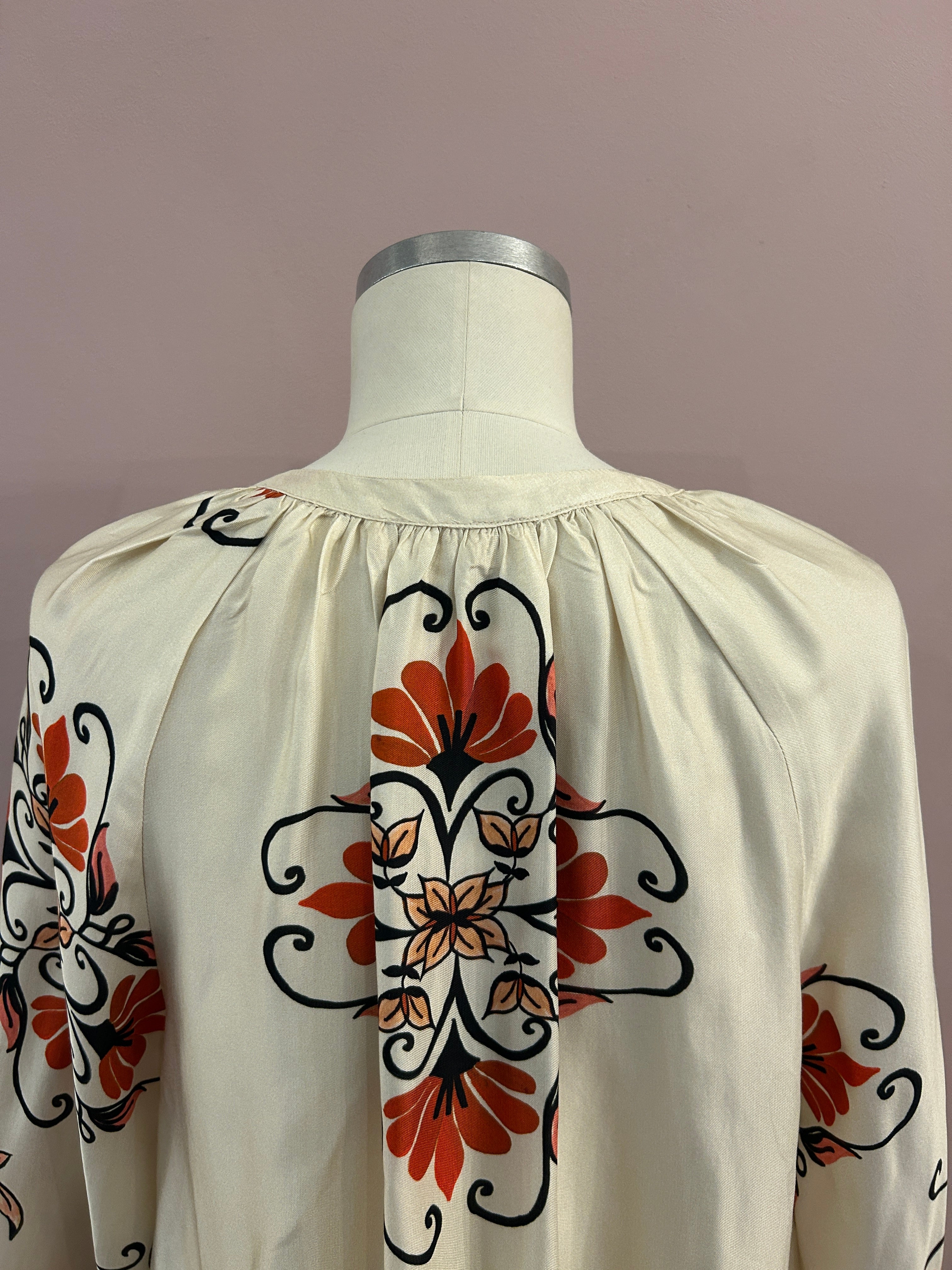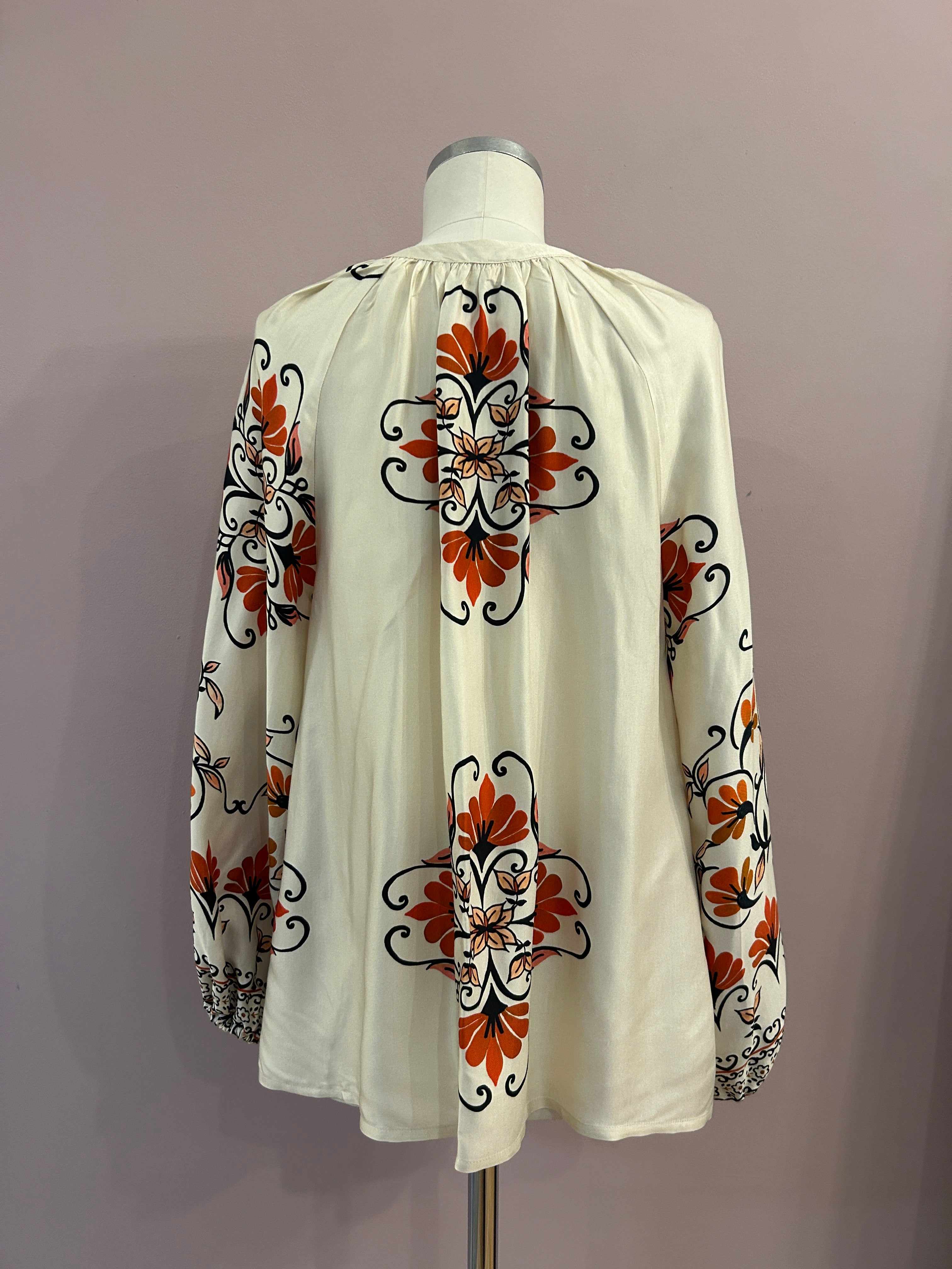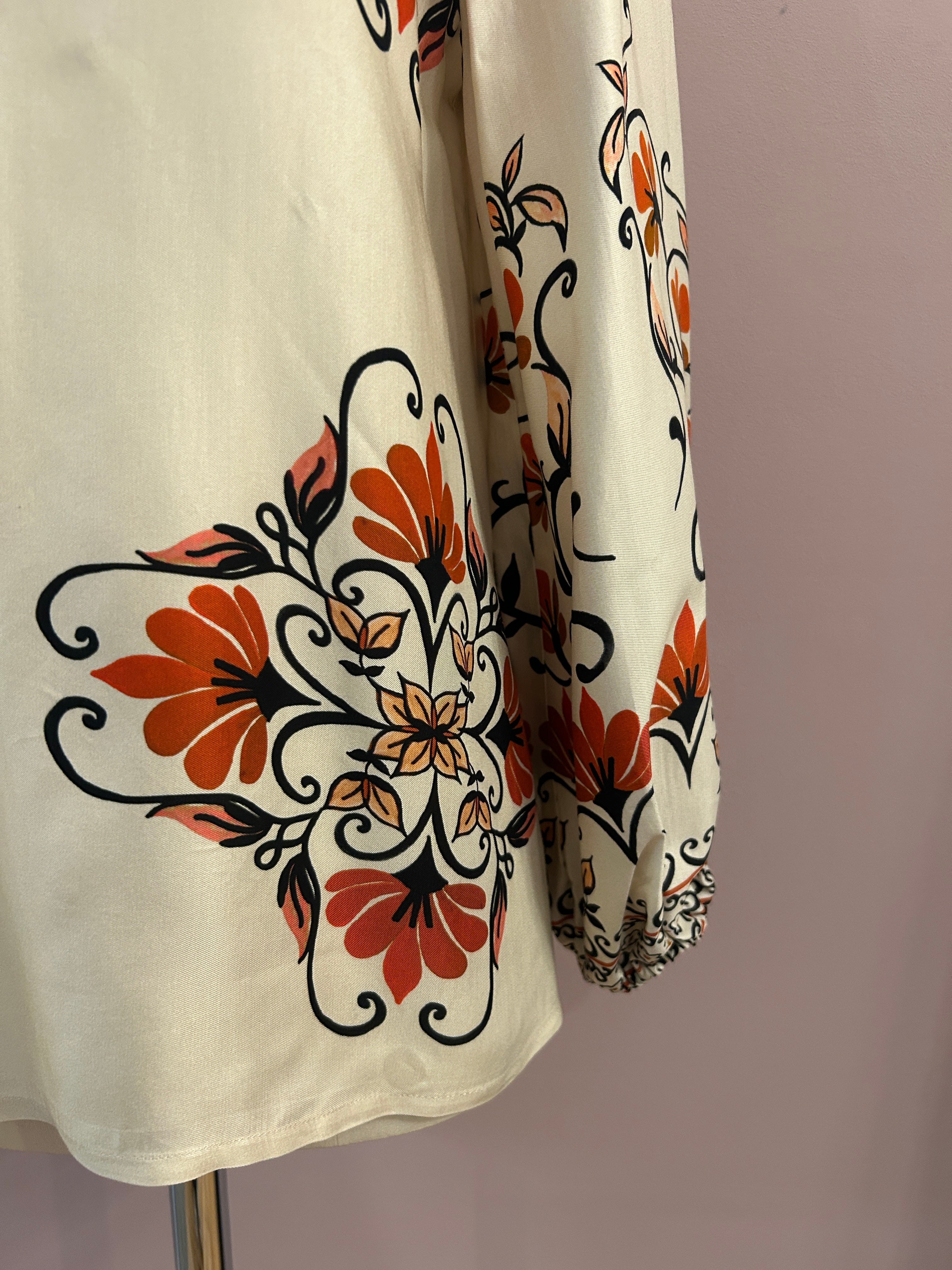 Diese sanft schimmernde Tunika aus Viskose verführt mit einem floralen Vintageprint in warmen Orangetönen, Schwarz und Creme. Das fließende Material sorgt für eine feine Bewegung und ein leichtes, aber dennoch elegantes Tragegefühl.